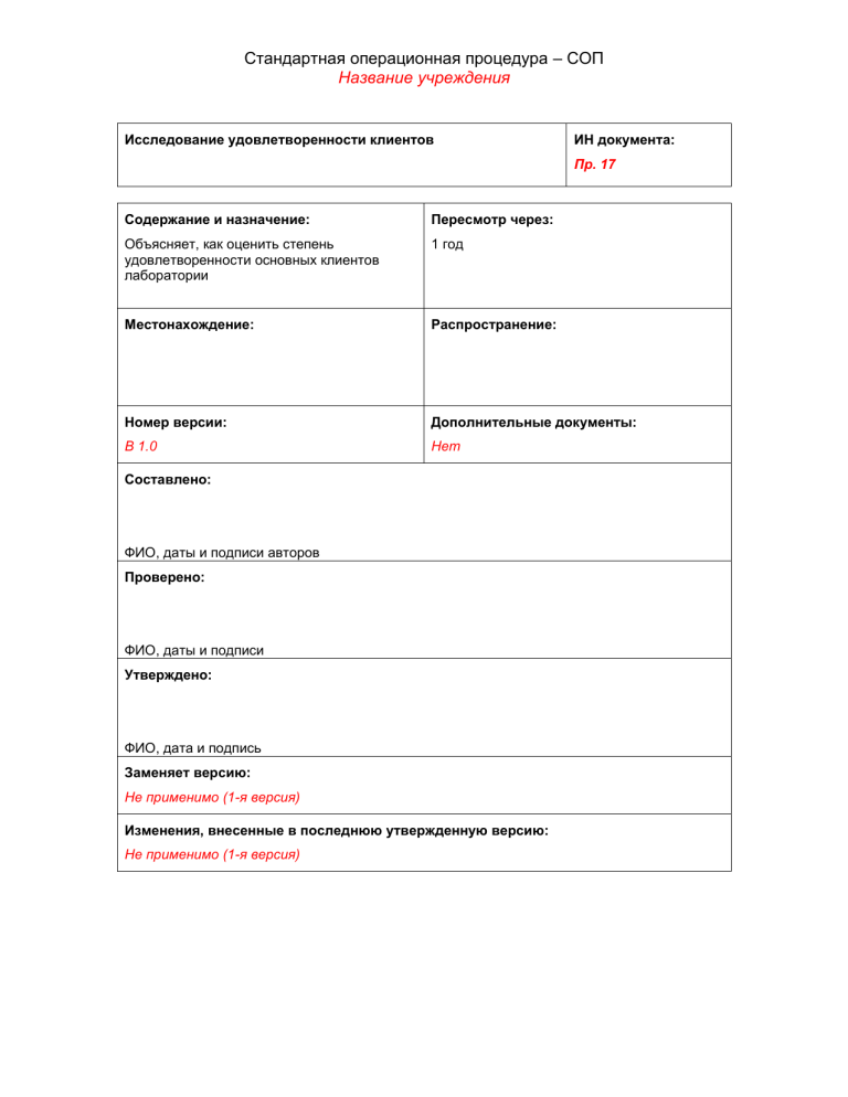 Стандартная операционная процедура – СОП Название учреждения Исследование удовлетворенности клиентов ИН документа: Пр. 17 Содержание и назначение: Пересмотр через: Объясняет, как оценить степень удовлетворенности основных клиентов лаборатории 1 год Местонахождение: Распространение: Номер версии: Дополнительные документы: В 1.0 Нет Составлено: ФИО, даты и подписи авторов Проверено: ФИО, даты и подписи Утверждено: ФИО, дата и подпись Заменяет версию: Не применимо (1-я версия) Изменения, внесенные в последнюю утвержденную версию: Не применимо (1-я версия) Учреждение: Версия: 1.0 Дата: Число страниц: 5 Название: Процедура ИН документа: Пр. 17 «Исследование удовлетворенности клиентов» Глава РК: 10 Процедура «Исследование удовлетворенности клиентов» Применение ......................................................................................................... 2 Цель ..................................................................................................................... 2 Определения ....................................................................................................... 2 Список литературы ............................................................................................. 2 Ответственность ................................................................................................. 2 Порядок действий ............................................................................................... 3 Методология .................................................................................................... 3 Инициирование и завершение исследования удовлетворенности клиентов ....... 3 1. Разработка опросника и сбор данных. ................................................... 3 2. Временные рамки исследования. ........................................................... 4 3. Подсчет результатов. .............................................................................. 4 4. Управление данными............................................................................... 5 5. Результаты ............................................................................................... 5 Связанные документы ........................................................................................ 5 Применение Данная процедура обеспечивает надлежащее планирование, сбор и анализ данных при исследовании удовлетворенности клиентов. Цель Данная процедура объясняет, как оценить степень удовлетворенности основных внешних потребителей услуг лаборатории: пациентов, медработников и сотрудников органов общественного здравоохранения. Определения Исправление – действия с целью устранения обнаруженного несоответствия. Потребитель, клиент, заказчик – организация или физическое лицо, которые получают товар или услугу от поставщика. Удовлетворенность клиентов, потребителей – восприятие клиентами того, в какой степени были удовлетворены их запросы. Список литературы Заполнить при необходимости Ответственность Руководитель/директор лаборатории: инициирует исследование удовлетворенности клиентов и осуществляет контроль за исследованием. 2 Учреждение: Версия: 1.0 Дата: Число страниц: 5 Название: Процедура ИН документа: Пр. 17 «Исследование удовлетворенности клиентов» Глава РК: 10 Комитет по качеству: проверяет опросники для исследования и анализирует отчеты; в координации с руководителем лаборатории осуществляет контроль за исследованием. Менеджер по качеству: отвечает за разработку, проведение и анализ опросов клиентов; следует отметить, что эти задачи могут быть делегированы другим сотрудникам, но они остаются под руководством менеджера по качеству; назначает координатора; ведет документацию. Координатор: координирует проведение исследования. Персонал: помогает в проведении исследования. Порядок действий Методология 1. Для о