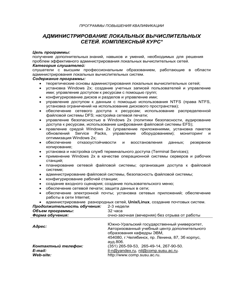 ПРОГРАММЫ ПОВЫШЕНИЯ КВАЛИФИКАЦИИ АДМИНИСТРИРОВАНИЕ ЛОКАЛЬНЫХ ВЫЧИСЛИТЕЛЬНЫХ СЕТЕЙ. КОМПЛЕКСНЫЙ КУРС* Цель программы: получение дополнительных знаний, навыков и умений, необходимых для решения проблем эффективного администрирования локальных вычислительных сетей. Категория слушателей: слушатели с высшим профессиональным образованием, работающие в области администрирования локальных вычислительных систем. Содержание программы: теоретические основы администрирования локальных вычислительных сетей; установка Windows 2x; создание учетных записей пользователей и управление ими; управление доступом к ресурсам с помощью групп; конфигурирование дисков и разделов и управление ими; управление доступом к данным с помощью использования NTFS (права NTFS, установка ограничений на использование дискового пространства); обеспечение сетевого доступа к ресурсам; использование распределенной файловой системы DFS; настройка сетевой печати; управление безопасностью в Windows 2x (политики безопасности, аудирование доступа к ресурсам, использование шифрования файловой системы EFS); правление средой Windows 2x (управление приложениями, установка пакетов обновлений Service Packs, управление оборудованием); мониторинг и оптимизация Windows 2x; обеспечение отказоустойчивости и восстановления данных; резервное копирование; установка и настройка служб терминального доступа (Terminal Services); применение Windows 2x в качестве операционной системы серверов и рабочих станций; планирование сетевой файловой системы; организация доступа к файловой системе; администрирование файловой системы, безопасность файловой системы; конфигурирование рабочей станции; создание входного сценария; создание пользовательского меню; обеспечение сетевой печати; защита данных в сети; обеспечение электронной почты; установка сетевых приложений; обеспечение работы в сети Internet; администрирование разнородных сетей, Unix/Linux, создание почтовых систем. Продолжительность обучения: 2-3 недели Объем программы: 32 часа Форма обучения: очно-заочная (вечерняя) без отрыва от работы Адрес: Контактный телефон: E-mail: Web-site: Южно-Уральский государственный университет, Авторизованный учебный центр дополнительного образования кафедры ЭВМ, 454080, г.Челябинск, пр. Ленина, 87, 3б корпус, ауд.806. (351) 265-59-53, 265-49-14, 267-90-50. il-n@yandex.ru, nil@comp.susu.ac.ru. http://www.comp.susu.ac.ru.