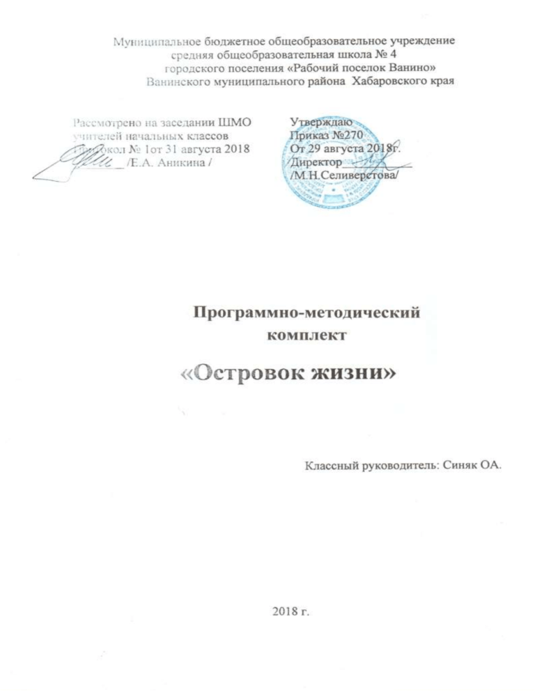 1 Содержание 1. Аннотация реализуемой программы………………………………… 3 2. Аннотация основных методических разработок ……………………..4 3. Динамика результативности реализации………………………….…. 7 Приложение ………………………………………..…………………….11 2 1. Аннотация реализуемой программы воспитательной работы На этапе младшего школьного возраста, очень важна система взаимодействия «семья – школа», как целенаправленный процесс по созданию оптимальных условий для развития индивидуальных особенностей личности ребенка, где роль классного руководителя является организующей в стремлении заложить первые «кирпичики» высших чувств – патриотизма, гуманизма, трудолюбия. Важна, прежде всего, личность самого ребёнка и происходящие с ней в процессе обучения изменения. Актуальность: Потребности современного общества возлагают на школу задачи не только качественного обучения, но и воспитания Человека высоконравственного, духовно богатого, способного адаптироваться к процессам, происходящим в современном мире. В процессе реализации программы создаются условия для понимания ребёнком того, что жизнь человека, его ум и здоровье – это превеликая ценность на земле. Ориентируясь на ФГОС НОО и воспитательные программы МБОУ СОШ №4, рассмотренные на заседании м/о классных руководителей протокол № 1 от «29» августа 2015г., которые размещены на сайте школы, мной разработана программа воспитательной работы «Островок жизни». «Островок жизни» - это небольшой отрезок длиною в четыре года, где живут дети, которые занимаются разными видами деятельности. Акробаты и талантливые пианисты, тренированные пловцы и вокалисты, футболисты, артисты, танцоры и спортивные гимнасты. Реализуя направления деятельности приоритетным направлением для меня Федерального стандарта является патриотическое, так как прежде всего присущие значимые качества для гражданина: это уважение к родной стране, своему народу, его истории, осознание своих обязанностей перед обществом, другими людьми, самим собой. С точки зрения психолого-педагогического подхода каждый год обучения в начальной 3 школе является важным звеном в становлении личности младшего школьника. Поэтому каждый последующий год реализации данной программы опирается на результаты предыдущего года воспитания. Возрастные модули программы 1-4 классов: 1 класс «Познай себя»; 2 класс «Я, семья и школа»; 3 класс «Я и окружающий мир»; 4 класс «Я и мой край». Воспитательная работа в рамках программы включает : проектную и исследовательскую деятельность, экскурсии, походы, акции, праздники, викторины, конкурсы, кружки, ведение портфолио. Как классного руководителя, меня волнует вопрос, какими окончанию начальной школы. станут мои ученики по Предназначение помогать личностному росту каждого ребёнка, вижу в том, чтобы создавая благоприятные условия для его общения и деятельности. Свою деятельность, я начинаю с беседы на самом первом родительском собрании в 1 классе о необходимости воспитания и дополнительного образования. 2. Аннотация основных методических разработок 1. Презентация и статья «Вектор организации и проведения родительских собраний: из опыта работы» на сайте: Социальная сеть работников образования https://nsportal.ru/oksana-sinyak, в разработок Ванинского района муниципального Сборнике методических Хабаровского «Педагогич