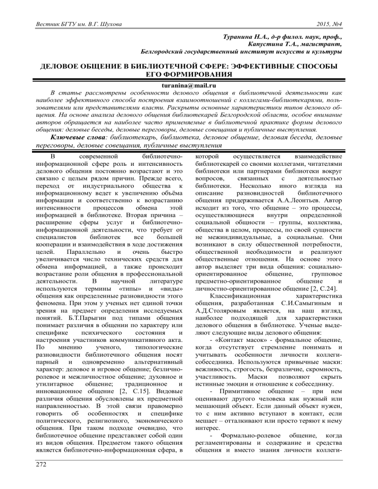 Вестник БГТУ им. В.Г. Шухова 2015, №4 Туранина Н.А., д-р филол. наук, проф., Капустина Т.А., магистрант, Белгородский государственный институт искусств и культуры ДЕЛОВОЕ ОБЩЕНИЕ В БИБЛИОТЕЧНОЙ СФЕРЕ: ЭФФЕКТИВНЫЕ СПОСОБЫ ЕГО ФОРМИРОВАНИЯ turanina@mail.ru В статье рассмотрены особенности делового общения в библиотечной деятельности как наиболее эффективного способа построения взаимоотношений с коллегами-библиотекарями, пользователями или представителями власти. Раскрыты основные характеристики типов делового общения. На основе анализа делового общения библиотекарей Белгородской области, особое внимание авторов обращается на наиболее часто применяемые в библиотечной практике формы делового общения: деловые беседы, деловые переговоры, деловые совещания и публичные выступления. Ключевые слова: библиотекарь, библиотека, деловое общение, деловая беседа, деловые переговоры, деловые совещания, публичные выступления В современной библиотечноинформационной сфере роль и интенсивность делового общения постоянно возрастают и это связано с целым рядом причин. Прежде всего, переход от индустриального общества к информационному ведет к увеличению объёма информации и соответственно к возрастанию интенсивности процессов обмена этой информацией в библиотеке. Вторая причина – расширение сферы услуг и библиотечноинформационной деятельности, что требует от специалистов библиотек все большей кооперации и взаимодействия в ходе достижения целей. Параллельно и очень быстро увеличивается число технических средств для обмена информацией, а также происходит возрастание роли общения в профессиональной деятельности. В научной литературе используются термины «типы» и «виды» общения как определенные разновидности этого феномена. При этом у ученых нет единой точки зрения на предмет определения исследуемых понятий. Б.Т.Парыгин под типами общения понимает различия в общении по характеру или специфике психического состояния и настроения участников коммуникативного акта. По мнению ученого, типологические разновидности библиотечного общения носят парный и одновременно альтернативный характер: деловое и игровое общение; безличноролевое и межличностное общение; духовное и утилитарное общение; традиционное и инновационное общение [2, С.15]. Видовые различия общения обусловлены их предметной направленностью. В этой связи правомерно говорить об особенностях и специфике политического, религиозного, экономического общения. При таком подходе очевидно, что библиотечное общение представляет собой один из видов общения. Предметом такого общения является библиотечно-информационная сфера, в 272 которой осуществляется взаимодействие библиотекарей со своими коллегами, читателями библиотеки или партнерами библиотеки вокруг вопросов, связанных с деятельностью библиотеки. Несколько иного взгляда на описание разновидностей библиотечного общения придерживается А.А.Леонтьев. Автор исходит из того, что общение – это процессы, осуществляющиеся внутри определенной социальной общности – группы, коллектива, общества в целом, процессы, по своей сущности не межиндивидуальные, а социальные. Они возникают в силу общественной потребности, общественной необходимости и реализуют общественные отношения. На основе этого автор выделяет три вида общения: соци