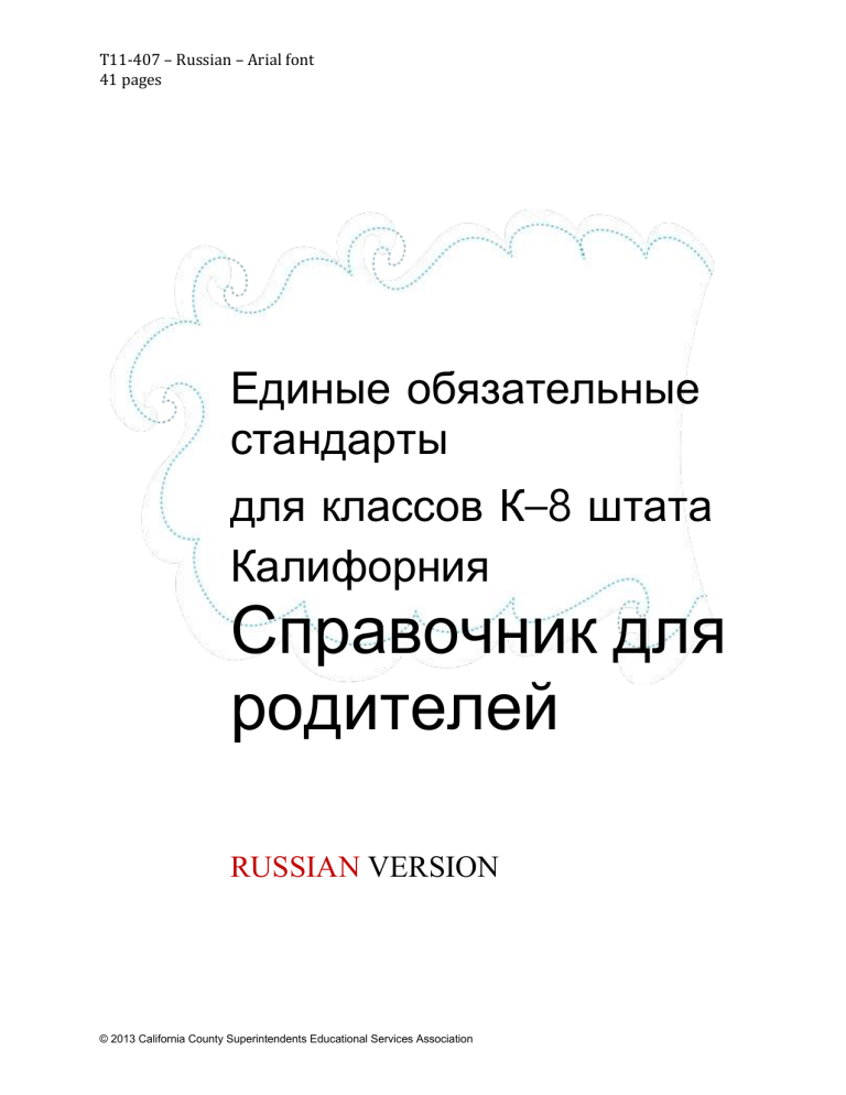T11-407 – Russian – Arial font 41 pages Единые обязательные стандарты для классов К–8 штата Калифорния Справочник для родителей RUSSIAN VERSION © 2013 California County Superintendents Educational Services Association T11-407 – Russian – Arial font 41 pages Ассоциации инспекторов образовательных учреждений округа Калифорния © 2013 California County Superintendents Educational Services Association Подготовлено при финансовой поддержке Фонда Уильяма и Флоры Хьюлетт Департамент образования штата Калифорния (CDE) выражает свою признательность и благодарность Ассоциации инспекторов образовательных учреждений округа Калифорния (CCSESA), а также Отделу образования округа Сакраменто (SCOE) за то, что они любезно дали разрешение на перевод настоящего документа. Переводная версия предоставляется школам как вспомогательный материал, который учителя могут использовать во время родительских собраний и в программах работы с родителями. По причине вариативности перевода CDE рекомендует школам при необходимости привлекать местных переводчиков для модификации документа в соответствии с местным требованиям. Вопросы относительно перевода следует направлять в Центр распространения многоязычных материалов по адресу cmd@cde.ca.gov. Подготовлено: Патрисией Дакхорн, Тамарой Уилсон, Фрэн Гибсон, Кэти Кёрл, Cью Стикел, Родительскопреподавательской ассоциацией штата Калифорния и Отделом образования округа Вентура © 2013 California County Superintendents Educational Services Association T11-407 – Russian – Arial font 41 pages Содержание Введение ............................................................................................................. 4 Математика Математика. Стандарты математических навыков ............................... 6 Обзор: подготовительный класс ............................................................ 8 Обзор: 1-й класс ...................................................................................... 10 Обзор: 2-й класс ...................................................................................... 12 Обзор: 3-й класс ...................................................................................... 14 Обзор: 4-й класс ...................................................................................... 16 Обзор: 5-й класс ...................................................................................... 18 Обзор: 6-й класс ...................................................................................... 20 Обзор: 7-й класс ...................................................................................... 22 Обзор: 8-й класс ...................................................................................... 24 Английская словестность Обзор: подготовительный класс ............................................................ 26 Обзор: 1-й класс ...................................................................................... 28 Обзор: 2-й класс ...................................................................................... 29 Обзор: 3-й класс ...................................................................................... 31 Обзор: 4-й класс ...................................................................................... 33 Обзор: 5-й класс ...................................................................................... 35 Обзор: 6-й класс ...................................................................................... 37 Обзор: 7-й класс ...................................................................................... 38 Обзор: 8-й класс ...................................................................................... 40 © 2013 California County Superintendents Educational Services Association T11-407 – Russian – Arial font 41 pages Введение В настоящем справочнике для родителей дается общее понятие Единых образовательных стандартов штата Калифорния и обзор того, что должны усвоить учащиеся подготовительных – 8-х классов. Стандарты включают знания и умения, которыми нашей молодежи необходимо овладеть для успешной учебы в вузе и карьеры. Единый набор учебных требований помогает учителям и родителям ставить перед учащимися образовательные задачи для достижения надлежащего уровня образования. Для чего вводятся