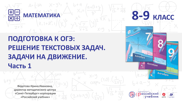 МАТЕМАТИКА ПОДГОТОВКА К ОГЭ: РЕШЕНИЕ ТЕКСТОВЫХ ЗАДАЧ. ЗАДАЧИ НА ДВИЖЕНИЕ. Часть 1 Федотова Ирина Ивановна, директор методического центра «Санкт-Петербург» корпорации «Российский учебник» 8-9 КЛАСС ОГЭ: ТЕКСТОВАЯ ЗАДАЧА № 22 2 ТЕКСТОВЫЕ ЗАДАЧИ ➢ задачи на «числовые зависимости» (арифметическая и геометрическая прогрессии); ➢ задачи на производительность, совместную работу; ➢ задачи на проценты и доли; ➢ задачи на смеси и сплавы (на концентрацию); ➢ задачи на движение 3 ОСНОВНЫЕ ТИПЫ ЗАДАЧ НА ДВИЖЕНИЕ: ▪ ▪ ▪ ▪ ▪ задачи на движение по прямой (навстречу и вдогонку) задачи на движение по замкнутой трассе задачи на движение по воде задачи на среднюю скорость задачи на движение протяженных тел 4 ЭТАПЫ РЕШЕНИЯ ЗАДАЧ: 1. Анализ условия задачи (чтение задачи, определение типа задачи, выделение данных, которые известны и требуется найти) 2. Схематическая запись задачи (рисунок, схема, чертеж) 3. Поиск способа решения (определение связи между данными задачи, формул, составление плана решения задачи, приведение величин к «одинаковой» соразмерности, составление таблицы) 4. Составление уравнение или системы уравнений как математической модели задачи 5. Решение полученного уравнения или системы уравнений (запись решения и результата) 6. Проверка решения 7. Формулировка ответа 5 ЗАДАЧИ НА ДВИЖЕНИЕ ПО ПРЯМОЙ 6 ЗАДАЧИ НА ДВИЖЕНИЕ ПО ПРЯМОЙ Задача 1. Мотоцикл двигается со скоростью 60 км/ч. Сколько километров он проедет за 2 часа? 7 ЗАДАЧИ НА ДВИЖЕНИЕ ПО ПРЯМОЙ Задача 1. Мотоцикл двигается со скоростью 60 км/ч. Сколько километров он проедет за 2 часа? Решение. 𝜗=60 км/ч, 𝑡=2 ч 𝑠 = 𝜗 ∙ 𝑡, 𝑠 = 60 ∙ 2 = 120 (км) проедет за 2 часа или км 60км∙2ч 𝑠 = 60 ∙ 2ч = =120 км проедет за 2 часа ч ч Ответ: 120 км 8 ЗАДАЧИ НА ДВИЖЕНИЕ ПО ПРЯМОЙ Задача 1. Мотоцикл двигается со скоростью 60 км/ч. Сколько километров он проедет за 15 минут? 1 15 1 15 мин= 15∙ ч = ч = ч 60 60 4 9 ЗАДАЧИ НА ДВИЖЕНИЕ ПО ПРЯМОЙ Задача 1. Мотоцикл двигается со скоростью 60 км/ч. Сколько километров он проедет за 2 часа? За 15 минут? Решение. 𝜗=60 км/ч, 𝑡=2 ч 𝑠 = 𝜗 ∙ 𝑡, км 60км∙2ч 𝑠 = 60 ∙ 2ч = =120 км ч ч или 𝑠 = 60 ∙ 2 = 120 (км) проедет за 2 часа Ответ: 120 км 10 𝜗=60 км/ч, 𝑡=15 мин 1 15 мин= ч 4 1 60 𝑠 = 60 ∙ = = 15 (км) 4 4 Ответ: 15 км ЗАДАЧИ НА ДВИЖЕНИЕ ПО ПРЯМОЙ Задача 2. Велосипедист за 2 часа проехал 24 км, а пешеход прошел 16 км за 4 часа. Во сколько раз велосипедист двигался быстрее, чем пешеход? 11 ЗАДАЧИ НА ДВИЖЕНИЕ ПО ПРЯМОЙ Задача 2. Велосипедист за 2 часа проехал 24 км, а пешеход прошел 16 км за 4 часа. Во сколько раз велосипедист двигался быстрее, чем пешеход? Решение. 𝑠 24 𝜗 = ; 𝜗 = =12(км/ч) – скорость велосипедиста 𝑡 2 16 𝜗= =4(км/ч) – скорость пешехода 4 12:4=3 Ответ: в 3 раза 12 ЗАДАЧИ НА ДВИЖЕНИЕ ПО ПРЯМОЙ Задача 3. Экскурсионный автобус выехал из Санкт-Петербурга в Пушкинские горы со скоростью 70 км/ч. Через час вслед за ним выехал автомобиль со скоростью 90 км/ч. За сколько часов автомобиль догонит автобус? Решение. 1. Анализ условия задачи 2. Схематическая запись задачи 3. Поиск способа решения 4. Составление уравнение 5. Решение уравнения 6. Проверка решения 7. Ответ 13 ЗАДАЧИ НА ДВИЖЕНИЕ ПО ПРЯМОЙ Задача 3. Экскурсионный автобус выехал из Санкт-Петербурга в Пушкинские горы со скоростью 70 км/ч. Через час вслед за ним выехал автомобиль со скоростью 90 км/ч. За сколько часов автомобиль догонит автобус? Решение. Перефразируем вопрос: За сколько часов автомобиль догонит автобус? Сколько часов в пути