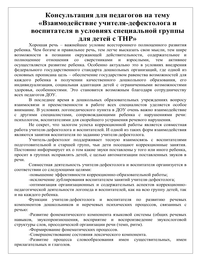 Консультация для педагогов на тему «Взаимодействие учителя-дефектолога и воспитателя в условиях специальной группы для детей с ТНР» Хорошая речь – важнейшее условие всестороннего полноценного развития ребенка. Чем богаче и правильнее речь, тем легче высказать свои мысли, тем шире возможности в познании окружающей действительности, содержательнее и полноценнее отношения со сверстниками и взрослыми, тем активнее осуществляется развитие ребенка. Особенно актуально это в условиях внедрения федерального государственного стандарта дошкольных организаций, где одной из основных прописана цель – обеспечение государством равенства возможностей для каждого ребенка в получении качественного дошкольного образования, его индивидуализация, социальная адаптация детей с ограниченными возможностями здоровья, особенностями. Это становится возможным благодаря сотрудничеству всех педагогов ДОУ. В последнее время в дошкольных образовательных учреждениях вопросу взаимосвязи и преемственности в работе всех специалистов уделяется особое внимание. В условиях логопедического пункта в ДОУ очень важно взаимодействие с другими специалистами, сопровождающими ребенка с нарушениями речи: психологом, воспитателями для скорейшего устранения речевого нарушения. Не секрет, что залогом успеха коррекционной работы является совместная работа учителя-дефектолога и воспитателей. И одной из таких форм взаимодействия являются занятия воспитателя по заданию учителя-дефектолога. Учитель-дефектолог поддерживает тесную взаимосвязь с воспитателями подготовительной и старшей групп, чьи дети посещают коррекционные занятия. Постоянно информирует их о том какие звуки поставлены у того или иного ребенка, просит в группах исправлять детей, с целью автоматизации поставленных звуков в речи. Совместная деятельность учителя-дефектолога и воспитателя организуется в соответствии со следующими целями: -повышение эффективности коррекционно-образовательной работы; -исключение дублирования воспитателем занятий учителя-дефектолога; -оптимизация организационных и содержательных аспектов коррекционнопедагогической деятельности логопеда и воспитателей, как на всю группу детей, так и на каждого ребенка. Функции учителя-дефектолога и воспитателя по развитию речевых компонентов дошкольников и неречевых психических процессов, связанных с речью: -Развитие фонематического компонента языковой системы (общих речевых навыков, звукопроизношения, восприятие и воспроизведение звукослоговой структуры слов, просодической организации речи (темп, ритм). -Формирование фонематических процессов. -Совершенствование состояния лексического компонента. -Развитие процесса словообразования имен существительных, имен прилагательных и глаголов. -Формирование грамматического строя речи. -Совершенствование связной речи. -Развитие неречевых психических функций, тесно связанных с речью: словесно-логического мышления, памяти, внимания, воображения. -Совершенствование речевого дыхания, артикуляционной и тонкой ручной моторики детей. Постоянный контроль над правильным произношением поставленных звуков, дифференцируя их со смешиваемыми фонемами на слух и в произношении, используя речевой материал, рекомендуемый логопедом. -Активизация, обогащение и уточнение сло
