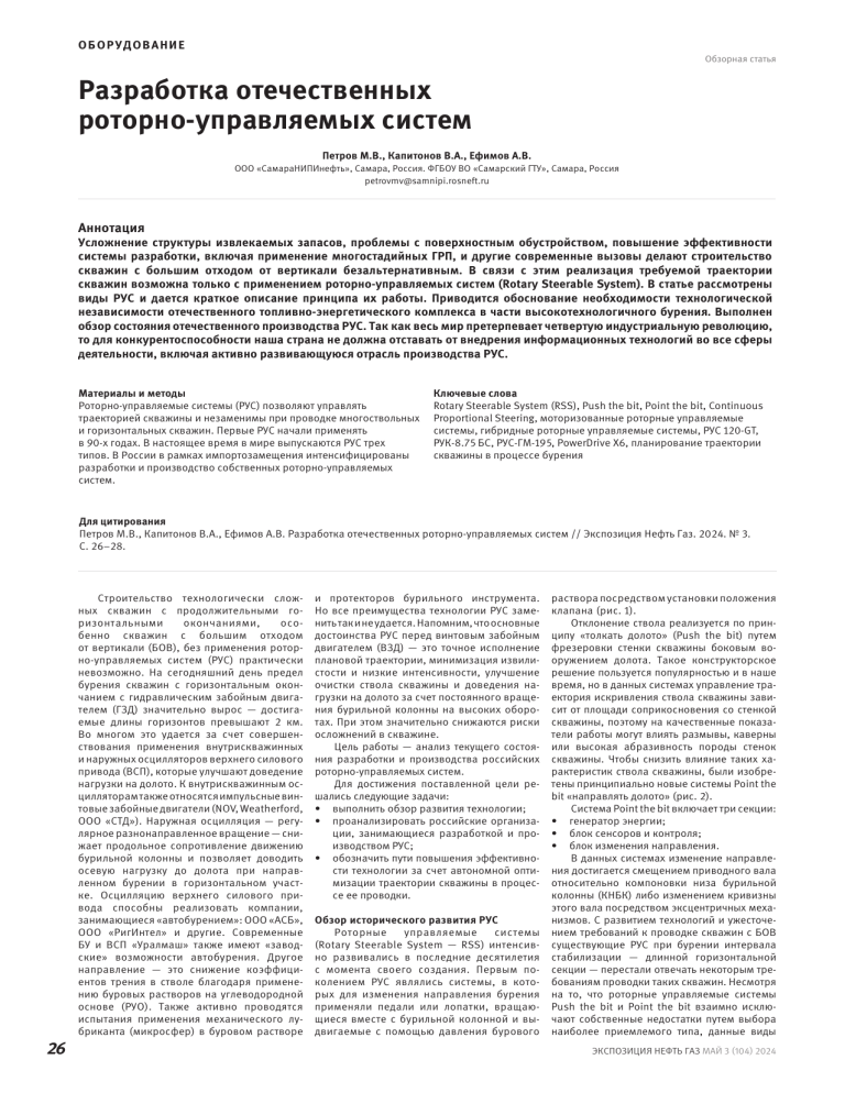ОБ О Р УД О В АНИ Е Обзорная статья Разработка отечественных роторно-управляемых систем Петров М.В., Капитонов В.А., Ефимов А.В. ООО «СамараНИПИнефть», Самара, Россия. ФГБОУ ВО «Самарский ГТУ», Самара, Россия petrovmv@samnipi.rosneft.ru Аннотация Усложнение структуры извлекаемых запасов, проблемы с поверхностным обустройством, повышение эффективности системы разработки, включая применение многостадийных ГРП, и другие современные вызовы делают строительство скважин с большим отходом от вертикали безальтернативным. В связи с этим реализация требуемой траектории скважин возможна только с применением роторно-управляемых систем (Rotary Steerable System). В статье рассмотрены виды РУС и дается краткое описание принципа их работы. Приводится обоснование необходимости технологической независимости отечественного топливно-энергетического комплекса в части высокотехнологичного бурения. Выполнен обзор состояния отечественного производства РУС. Так как весь мир претерпевает четвертую индустриальную революцию, то для конкурентоспособности наша страна не должна отставать от внедрения информационных технологий во все сферы деятельности, включая активно развивающуюся отрасль производства РУС. Материалы и методы Роторно-управляемые системы (РУС) позволяют управлять траекторией скважины и незаменимы при проводке многоствольных и горизонтальных скважин. Первые РУС начали применять в 90-х годах. В настоящее время в мире выпускаются РУС трех типов. В России в рамках импортозамещения интенсифицированы разработки и производство собственных роторно-управляемых систем. Ключевые слова Rotary Steerable System (RSS), Push the bit, Point the bit, Continuous Proportional Steering, моторизованные роторные управляемые системы, гибридные роторные управляемые системы, РУС 120-GT, РУК-8.75 БС, РУС-ГМ-195, PowerDrive X6, планирование траектории скважины в процессе бурения Для цитирования Петров М.В., Капитонов В.А., Ефимов А.В. Разработка отечественных роторно-управляемых систем // Экспозиция Нефть Газ. 2024. № 3. С. 26–28. 26 Строительство технологически сложных скважин с продолжительными горизонтальными окончаниями, особенно скважин с большим отходом от вертикали (БОВ), без применения роторно-управляемых систем (РУС) практически невозможно. На сегодняшний день предел бурения скважин с горизонтальным окончанием с гидравлическим забойным двигателем (ГЗД) значительно вырос — достигаемые длины горизонтов превышают 2 км. Во многом это удается за счет совершенствования применения внутрискважинных и наружных осцилляторов верхнего силового привода (ВСП), которые улучшают доведение нагрузки на долото. К внутрискважинным осцилляторам также относятся импульсные винтовые забойные двигатели (NOV, Weatherford, ООО «СТД»). Наружная осцилляция — регулярное разнонаправленное вращение — снижает продольное сопротивление движению бурильной колонны и позволяет доводить осевую нагрузку до долота при направленном бурении в горизонтальном участке. Осцилляцию верхнего силового привода способны реализовать компании, занимающиеся «автобурением»: ООО «АСБ», ООО «РигИнтел» и другие. Современные БУ и ВСП «Уралмаш» также имеют «заводские» возможности автобурения. Другое направление — это снижение коэффициентов трения в стволе благодаря применению буровых растворов на углеводородной основе (РУО). Также активно проводятся испытания приме