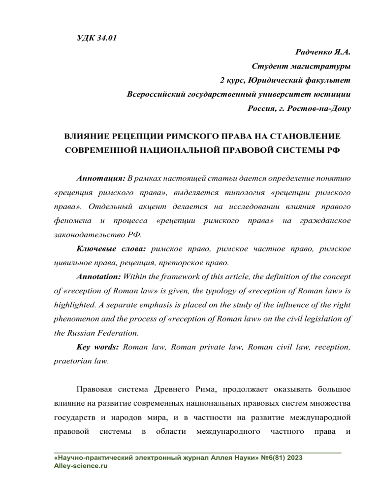УДК 34.01 Радченко Я.А. Студент магистратуры 2 курс, Юридический факультет Всероссийский государственный университет юстиции Россия, г. Ростов-на-Дону ВЛИЯНИЕ РЕЦЕПЦИИ РИМСКОГО ПРАВА НА СТАНОВЛЕНИЕ СОВРЕМЕННОЙ НАЦИОНАЛЬНОЙ ПРАВОВОЙ СИСТЕМЫ РФ Аннотация: В рамках настоящей статьи дается определение понятию «рецепция римского права», выделяется типология «рецепции римского права». Отдельный акцент делается на исследовании влияния правого феномена и процесса «рецепции римского права» на гражданское законодательство РФ. Ключевые слова: римское право, римское частное право, римское цивильное права, рецепция, преторское право. Annotation: Within the framework of this article, the definition of the concept of «reception of Roman law» is given, the typology of «reception of Roman law» is highlighted. A separate emphasis is placed on the study of the influence of the right phenomenon and the process of «reception of Roman law» on the civil legislation of the Russian Federation. Key words: Roman law, Roman private law, Roman civil law, reception, praetorian law. Правовая система Древнего Рима, продолжает оказывать большое влияние на развитие современных национальных правовых систем множества государств и народов мира, и в частности на развитие международной правовой системы в области международного частного права __________________________________________________________________________ «Научно-практический электронный журнал Аллея Науки» №6(81) 2023 Alley-science.ru и международного процесса. Римское право также оказывает влияние на развитие правовой системы Российской Федерации в области частного права, происходит восстановление и развитие частноправовых традиций, которые были закреплены в основных положениях римского частного права. Рецепция римского права или рецепция римского частного права - есть процесс и правовой феномен заимствования юридических теоретических конструкций; системы изложения права; системы и структуры права; основных фундаментальных категориального аппаратов; правовых положений; частноправовых понятийного традиций; и опыта правоприменительной практики; результатов научных юридических трудов; форм права, закрепленных в источниках римского права; правовых знаний из речей римских ораторов; прецедентной практики (судебный и административный прецеденты в Древнем Риме, преторское право); правовых принципов; частно-правовых явлений из римского права (римского частного права) для формирования и развития современных правовых систем множества государств и международного сообщества. Кроме того, это процесс государственного использования основных положений римского (частного) права. [1] Выделим типологию рецепции римского (частного) права: [2] − Западноевропейская рецепция римского права. Римское право заложило теоретические основы и фундаментальные положения национальных правовых систем государств романно-германской правовой семьи и скандинавской правовой семьи, располагающихся в Западной Европе, Северной Европе и Центральной Европе, частично в Восточной Европе. Особенно данная рецепция повлияла на развитие правовых систем Франции и Германии. − Восточноевропейская рецепция римского права или Византийская рецепция римского права. Римское право в слияние с греческим правом дало правовые начала византийскому праву, которое заложило теоретические __________________________________________________________________________ «Научно-практический электронный журнал Аллея Науки» №6(81) 2023 Alley-science.ru основы и фундаментальные положения национальных правовых си