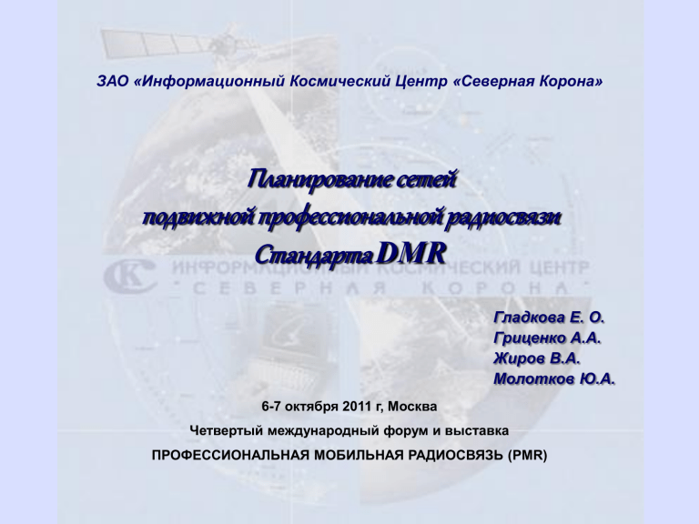 ЗАО «Информационный Космический Центр «Северная Корона» Планирование сетей подвижной профессиональной радиосвязи Стандарта DMR Гладкова Е. О. Гриценко А.А. Жиров В.А. Молотков Ю.А. 6-7 октября 2011 г, Москва Четвертый международный форум и выставка ПРОФЕССИОНАЛЬНАЯ МОБИЛЬНАЯ РАДИОСВЯЗЬ (PMR) ЗАО « Информационный Космический Центр « Северная Корона » Сфера деятельности проектирование и планирование радиосистем передачи информации (спутниковых и наземных) Направления работ - разработка методического обеспечения, - разработка программного обеспечения, - выполнение проектных работ, - обучение и консалтинг тел/факс e-mail: сайт: +7 (812) 600-63-82 org@spacecenter.ru www.spacecenter.ru ЗАО «Информационный Космический Центр «Северная Корона» Существующие аналоговые системы Улучшается качество связи ∆F Появляется возможность передавать данные одновременно с голосом Повышается канальная емкость Системы связи стандарта DMR Планирование! - Стандарт внедряется в частотных диапазонах действующих аналоговых сетей - Относительно низкочастотный диапазон … ∆F тел/факс e-mail: сайт: +7 (812) 600-63-82 org@spacecenter.ru www.spacecenter.ru ЗАО «Информационный Космический Центр «Северная Корона» Диапазоны частот для использования стандарта DMR Подвижная (искл.-воздушная) ПР 1,9 МГц Подвижная ПР 70 МГц СИ 13 МГц 300 300,525 ПР СИ 0,6 0,525 МГц МГц 403 - 410 МГц СИ 149,9 162,7625 СИ 12,8625 МГц Подвижная 301,125 305,825 СИ 4,7 МГц СИ 7 МГц ПР 1,2 МГц Подвижная (искл.-воздушная) 163,2 168,5 СИ 5,3 МГц ПР 0,4375 МГц ПР 5,5 МГц Подвижная Подвижная 307,025 308 СИ 336 336,525 ПР СИ 0,6 0,525 МГц МГц 0,975 МГц ПР 28 МГц 417 - 422 МГц СИ СИ 11 МГц Подвижная Подвижная 337,125 341,825 СИ 4,7 МГц ПР 1,2 МГц 343,025 344 СИ 0,975 МГц ПР 46 МГц 433 - 447 МГц СИ Частотный ресурс ограничен, и в то же время является ресурсом для действующих аналоговых сетей тел/факс e-mail: сайт: +7 (812) 600-63-82 org@spacecenter.ru www.spacecenter.ru ЗАО «Информационный Космический Центр «Северная Корона» Частотно-территориальное планирование сети стандарта DMR Задачи ЧТП: - определение приемлемой конфигурации расположения базовых станций, удовлетворяющей требованиям к радиопокрытию; - определение достаточной высоты антенн и мощности передатчиков; - формирование частотного плана сети, удовлетворяющей требованиям к канальной емкости Основные этапы: 1 этап - Подготовка и анализ исходных данных (данные о местоположении БС; частотный ресурс; параметры оборудования АС и БС; требования к показателям качества; картографическое обеспечение), формирование плана связи; 2 этап - Обеспечение радиопокрытия (задача решается без учета помех) и коррекция исходных данных (при необходимости); 3 этап - Формирование частотного плана и оценка радиопокрытия с учетом помех; коррекция исходных данных (при необходимости); 4 этап - Оценка качества планирования и визуализация результатов. тел/факс e-mail: сайт: +7 (812) 600-63-82 org@spacecenter.ru www.spacecenter.ru ЗАО «Информационный Космический Центр «Северная Корона» Алгоритм частотно-территориального планирования Подготовка и анализ исходных данных да Возможно корректировать исходные данные? нет Выбор мест установки БС да 2 этап нет Удовлетворяет требованиям? Обеспечение радиопокрытия (без учета помех) Просмотрены все варианты параметров установки антенн? 4 этап Расчет зоны покрытия (без учета помех) нет нет Просмотрены все варианты назначения частот? Расчет зоны покрытия (с учетом помех) Удовлетворяет требованиям? Выбор параметров установки антенн да Наз