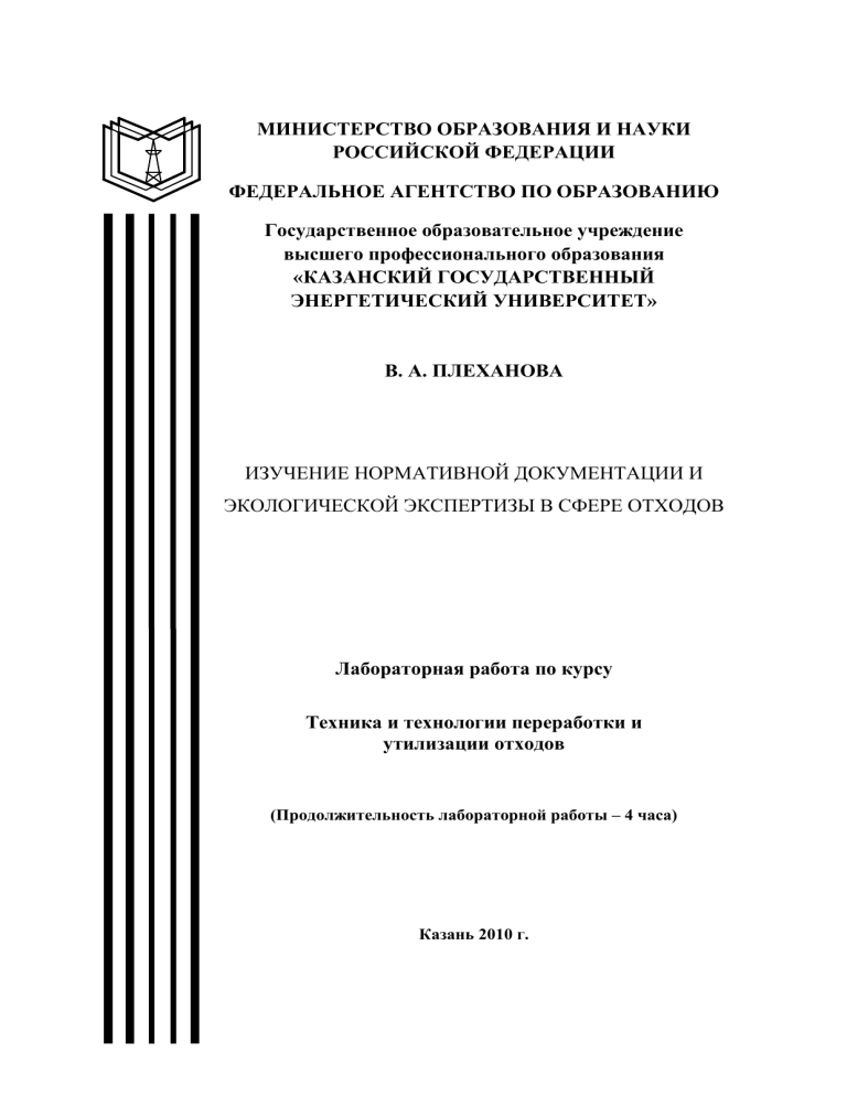МИНИСТЕРСТВО ОБРАЗОВАНИЯ И НАУКИ РОССИЙСКОЙ ФЕДЕРАЦИИ ФЕДЕРАЛЬНОЕ АГЕНТСТВО ПО ОБРАЗОВАНИЮ Государственное образовательное учреждение высшего профессионального образования «КАЗАНСКИЙ ГОСУДАРСТВЕННЫЙ ЭНЕРГЕТИЧЕСКИЙ УНИВЕРСИТЕТ» В. А. ПЛЕХАНОВА ИЗУЧЕНИЕ НОРМАТИВНОЙ ДОКУМЕНТАЦИИ И ЭКОЛОГИЧЕСКОЙ ЭКСПЕРТИЗЫ В СФЕРЕ ОТХОДОВ Лабораторная работа по курсу Техника и технологии переработки и утилизации отходов (Продолжительность лабораторной работы – 4 часа) Казань 2010 г. 2 УДК 628.5:574 ББК П Рецензенты: доц. каф. ИЭР Апкин Ренат Нуриханович Плеханова В.А. Изучение нормативной документации и экологической экспертизы в сфере отходов. Лабораторная работа. Казань: Казан. гос. энерг. ун-т, 2010. В работе даны сведения о нормативной документации и экологической экспертизе в сфере отходов. В практической части работы приведены расчеты полигона ТБО и порядок заполнения паспортов на опасные отходы. Работа предназначена для студентов специальности 280202.65 «Инженерная защита окружающей среды». УДК 628.5:574 ББК © Казанский государственный энергетический университет, 2010 3 ЛАБОРАТОРНАЯ РАБОТА № 4 Изучение нормативной документации и экологической экспертизы в сфере отходов Цель работы: Ознакомиться с нормативной документацией и экологической экспертизой в сфере отходов на примере лицензирования деятельности по сбору, использованию, обезвреживанию, транспортированию и размещению опасных отходов; изучить методику расчета полигона для твердых бытовых отходов (ТБО); научиться заполнять паспорта на опасные отходы. ТЕОРЕТИЧЕСКАЯ ЧАСТЬ РАБОТЫ Перечень основных нормативно-правовых документов по лицензированию деятельности по сбору, использованию, обезвреживанию, транспортированию и размещению опасных отходов включает: 1. Федеральный закон от 8.08.2002г. №128-ФЗ «О лицензировании отдельных видов деятельности». 2. Федеральный закон от 24.06.1998г. №89-ФЗ «Об отходах производства и потребления». 3. Федеральный закон от 23.11.1995г. №174-ФЗ «Об экологической экспертизе». 4. Постановление Правительства РФ от 11.02.2002г. №135 «О лицензировании отдельных видов деятельности». 5. Постановление Правительства РФ от 23.05.2002г. №340 «Об утверждении Положения о лицензировании деятельности по обращению с опасными отходами» 6. Постановление Правительства РФ от 3.10.2002г. №731 «Об изменении и признании утратившими силу некоторых постановлений 4 Совета Министров РСФСР, Правительства РСФСР и Правительства РФ, касающихся государственной регистрации юридических лиц». 7. Приказ МПР России от 18.06.2002г. №451 «О лицензировании деятельности по обращению с опасными отходами (согласно заключению Минюста России от 22.08.2002г. №07/7963-ЮД в государственной регистрации не нуждается) 8. Приказ МПР России от 15.06.2001г. №511 «Об утверждении Критериев отнесения опасных отходов к классу опасности для окружающей природной среды» (согласно заключению Минюста России от 24.07.2001г. №07/7483-ЮД в государственной регистрации не 16.05.2000г. №372 «Об воздействия намечаемой нуждается». 9. Приказ утверждении Госкомэкологии Положения об РФ от оценке хозяйственной и иной деятельности на окружающую среду в Российской Федерации, зарегистрированного в Минюсте России 4.07.2000г. рег. №2302. 10. Приказ Министерства охраны окружающей среды и природных ресурсов РФ от 29.12.95 №539 «Об утверждении инструкции по экологическому обоснованию хозяйственной и и
