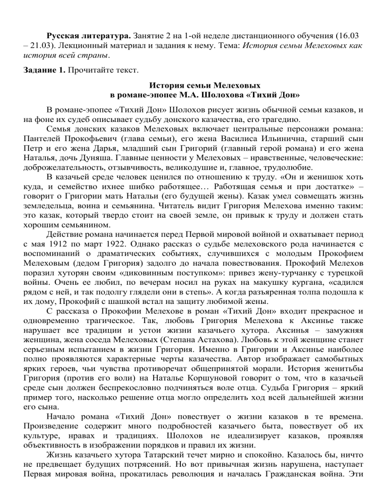 Русская литература. Занятие 2 на 1-ой неделе дистанционного обучения (16.03 – 21.03). Лекционный материал и задания к нему. Тема: История семьи Мелеховых как история всей страны. Задание 1. Прочитайте текст. История семьи Мелеховых в романе-эпопее М.А. Шолохова «Тихий Дон» В романе-эпопее «Тихий Дон» Шолохов рисует жизнь обычной семьи казаков, и на фоне их судеб описывает судьбу донского казачества, его трагедию. Семья донских казаков Мелеховых включает центральные персонажи романа: Пантелей Прокофьевич (глава семьи), его жена Василиса Ильинична, старший сын Петр и его жена Дарья, младший сын Григорий (главный герой романа) и его жена Наталья, дочь Дуняша. Главные ценности у Мелеховых – нравственные, человеческие: доброжелательность, отзывчивость, великодушие и, главное, трудолюбие. В казачьей среде человек ценился по отношению к труду. «Он и женишок хоть куда, и семейство ихнее шибко работящее… Работящая семья и при достатке» – говорит о Григории мать Натальи (его будущей жены). Казак умел совмещать жизнь земледельца, воина и семьянина. Читатель видит Григория Мелехова именно таким: это казак, который твердо стоит на своей земле, он привык к труду и должен стать хорошим семьянином. Действие романа начинается перед Первой мировой войной и охватывает период с мая 1912 по март 1922. Однако рассказ о судьбе мелеховского рода начинается с воспоминаний о драматических событиях, случившихся с молодым Прокофием Мелеховым (дедом Григория) задолго до начала повествования. Прокофий Мелехов поразил хуторян своим «диковинным поступком»: привез жену-турчанку с турецкой войны. Очень ее любил, по вечерам носил на руках на макушку кургана, «садился рядом с ней, и так подолгу глядели они в степь». А когда разъяренная толпа подошла к их дому, Прокофий с шашкой встал на защиту любимой жены. С рассказа о Прокофии Мелехове в роман «Тихий Дон» входит прекрасное и одновременно трагическое. Так, любовь Григория Мелехова к Аксинье также нарушает все традиции и устои жизни казачьего хутора. Аксинья – замужняя женщина, жена соседа Мелеховых (Степана Астахова). Любовь к этой женщине станет серьезным испытанием в жизни Григория. Именно в Григории и Аксинье наиболее полно проявляются характерные черты казачества. Автор изображает самобытных ярких героев, чьи чувства противоречат общепринятой морали. История женитьбы Григория (против его воли) на Наталье Коршуновой говорит о том, что в казачьей среде сын должен беспрекословно подчиняться воле отца. Судьба Григория – яркий пример того, насколько решение отца могло определить ход всей дальнейшей жизни его сына. Начало романа «Тихий Дон» повествует о жизни казаков в те времена. Произведение содержит много подробностей казачьего быта, повествует об их культуре, нравах и традициях. Шолохов не идеализирует казаков, проявляя объективность в изображении порядков и правил их жизни. Жизнь казачьего хутора Татарский течет мирно и спокойно. Казалось бы, ничто не предвещает будущих потрясений. Но вот привычная жизнь нарушена, наступает Первая мировая война, прокатилась революция и началась Гражданская война. Эти печальные события вносят полный дисбаланс в гармоничный быт казаков, наполняя их существование жестокостью, насилием и ненавистью. Первая мировая и гражданская войны пройдутся по хуторам и станицам, у каждой сем