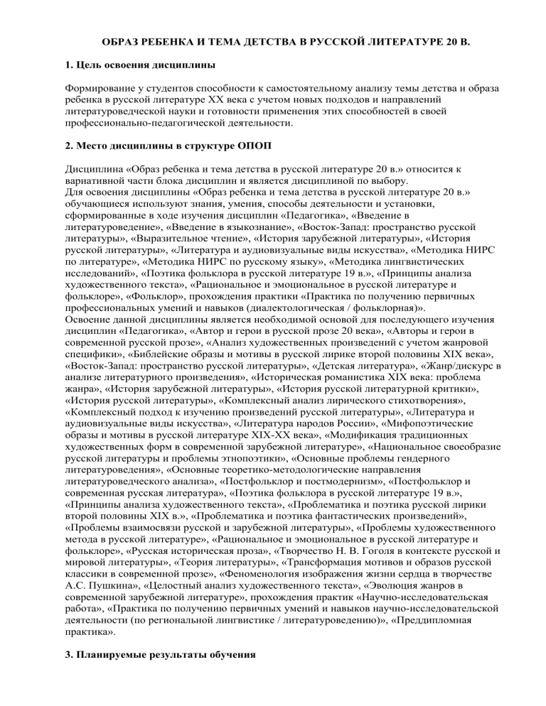 ОБРАЗ РЕБЕНКА И ТЕМА ДЕТСТВА В РУССКОЙ ЛИТЕРАТУРЕ 20 В. 1. Цель освоения дисциплины Формирование у студентов способности к самостоятельному анализу темы детства и образа ребенка в русской литературе ХХ века с учетом новых подходов и направлений литературоведческой науки и готовности применения этих способностей в своей профессионально-педагогической деятельности. 2. Место дисциплины в структуре ОПОП Дисциплина «Образ ребенка и тема детства в русской литературе 20 в.» относится к вариативной части блока дисциплин и является дисциплиной по выбору. Для освоения дисциплины «Образ ребенка и тема детства в русской литературе 20 в.» обучающиеся используют знания, умения, способы деятельности и установки, сформированные в ходе изучения дисциплин «Педагогика», «Введение в литературоведение», «Введение в языкознание», «Восток-Запад: пространство русской литературы», «Выразительное чтение», «История зарубежной литературы», «История русской литературы», «Литература и аудиовизуальные виды искусства», «Методика НИРС по литературе», «Методика НИРС по русскому языку», «Методика лингвистических исследований», «Поэтика фольклора в русской литературе 19 в.», «Принципы анализа художественного текста», «Рациональное и эмоциональное в русской литературе и фольклоре», «Фольклор», прохождения практики «Практика по получению первичных профессиональных умений и навыков (диалектологическая / фольклорная)». Освоение данной дисциплины является необходимой основой для последующего изучения дисциплин «Педагогика», «Автор и герои в русской прозе 20 века», «Авторы и герои в современной русской прозе», «Анализ художественных произведений с учетом жанровой специфики», «Библейские образы и мотивы в русской лирике второй половины XIX века», «Восток-Запад: пространство русской литературы», «Детская литература», «Жанр/дискурс в анализе литературного произведения», «Историческая романистика XIX века: проблема жанра», «История зарубежной литературы», «История русской литературной критики», «История русской литературы», «Комплексный анализ лирического стихотворения», «Комплексный подход к изучению произведений русской литературы», «Литература и аудиовизуальные виды искусства», «Литература народов России», «Мифопоэтические образы и мотивы в русской литературе XIX-XX века», «Модификация традиционных художественных форм в современной зарубежной литературе», «Национальное своеобразие русской литературы и проблемы этнопоэтики», «Основные проблемы гендерного литературоведения», «Основные теоретико-методологические направления литературоведческого анализа», «Постфольклор и постмодернизм», «Постфольклор и современная русская литература», «Поэтика фольклора в русской литературе 19 в.», «Принципы анализа художественного текста», «Проблематика и поэтика русской лирики второй половины XIX в.», «Проблематика и поэтика фантастических произведений», «Проблемы взаимосвязи русской и зарубежной литературы», «Проблемы художественного метода в русской литературе», «Рациональное и эмоциональное в русской литературе и фольклоре», «Русская историческая проза», «Творчество Н. В. Гоголя в контексте русской и мировой литературы», «Теория литературы», «Трансформация мотивов и образов русской классики в современной прозе», «Феноменология изображени