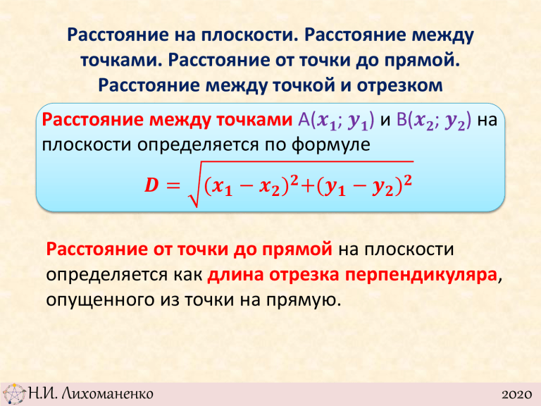 Расстояние на плоскости. Расстояние между точками. Расстояние от точки до прямой. Расстояние между точкой и отрезком Расстояние между точками A(𝒙𝟏; 𝒚𝟏) и B(𝒙𝟐; 𝒚𝟐) на плоскости определяется по формуле 𝑫= (𝒙𝟏 − 𝒙𝟐 )𝟐 +(𝒚𝟏 − 𝒚𝟐 )𝟐 Расстояние от точки до прямой на плоскости определяется как длина отрезка перпендикуляра, опущенного из точки на прямую. Н.И. Лихоманенко 2020 Расстояние на плоскости. Расстояние между точками. Расстояние от точки до прямой. Расстояние между точкой и отрезком Нормальное уравнением прямой 𝑨 𝑨𝟐 + 𝑩𝟐 •𝒙 + 𝑩 𝑨𝟐 + 𝑩𝟐 •𝒚 + 𝑪 𝑨𝟐 + 𝑩𝟐 =0, где С ≤ 𝟎 При подстановке координат произвольной точки в выражение получается значение, равное по абсолютной величине расстоянию от точки до прямой. Н.И. Лихоманенко 2020 Расстояние на плоскости. Расстояние между точками. Расстояние от точки до прямой. Расстояние между точкой и отрезком Алгоритм «Расстояние от точки до прямой. Найти расстояние от точки (𝑥3 , 𝑦3 ) до прямой проходящей через точки (𝑥1 , 𝑦1 ) и (𝑥2 , 𝑦2 ). 𝐴 = 𝑦2 − 𝑦1 𝐵 = 𝑥1 − 𝑥2 𝐶 = −𝑥1 • 𝑦2 − 𝑦1 + 𝑦1 • 𝑥2 − 𝑥1 |𝐴•𝑥3 + 𝐵•𝑦3 + 𝐶| 𝐷= 𝐴2 + 𝐵 2 Н.И. Лихоманенко 2020 Расстояние на плоскости. Расстояние между точками. Расстояние от точки до прямой. Расстояние между точкой и отрезком Пример. Дано: 𝑥1 = 0, 𝑦1 = 0, 𝑥2 = 3, 𝑦2 = 4, 𝑥3 = −1, 𝑦3 = 7. Найти расстояние от точки (𝑥3 , 𝑦3 ) до прямой проходящей через точки (𝑥1 , 𝑦1 ) и (𝑥2 , 𝑦2 ). 𝐴 = 𝑦2 − 𝑦1 = 4 − 0 = 4 𝐵 = 𝑥1 − 𝑥2 = 0 − 3 = −3 𝐶 = −𝑥1 • 𝑦2 − 𝑦1 + 𝑦1 • 𝑥2 − 𝑥1 = −0•4 + 0•3 = 0 |𝐴•𝑥3 + 𝐵•𝑦3 + 𝐶| 4 ∗ −1 + −3 •7 + 0 𝐷= = =5 16 + 9 𝐴2 + 𝐵 2 Н.И. Лихоманенко 2020 Расстояние на плоскости. Расстояние между точками. Расстояние от точки до прямой. Расстояние между точкой и отрезком Алгоритм «Расстояние от точки до отрезка». Найти расстояние от точки (𝒙𝟑 , 𝒚𝟑 ) до отрезка с координатами концов (𝒙𝟏 , 𝒚𝟏 ) и (𝒙𝟐 , 𝒚𝟐 ). 1. Если перпендикуляр из точки к прямой, проходящей через концы отрезка, пересекает отрезок, то расстояние между точкой и отрезком равно расстоянию между точкой и прямой, проходящей через отрезок. 2. Если перпендикуляр не пересекает отрезок, то расстояние равно минимальному из расстояний между точкой и одним из концов отрезка. Н.И. Лихоманенко 2020 Расстояние на плоскости. Расстояние между точками. Расстояние от точки до прямой. Расстояние между точкой и отрезком Алгоритм «Расстояние от точки до отрезка». Если один из углов при основании тупой, то перпендикуляр, опущенный из вершины, соответствующей исходной точке, не попадает на основание (отрезок) . Н.И. Лихоманенко 2020 Расстояние на плоскости. Расстояние между точками. Расстояние от точки до прямой. Расстояние между точкой и отрезком Алгоритм «Расстояние от точки до отрезка». Если нет тупых углов при основании, то перпендикуляр, опущенный из вершины, соответствующей исходной точке, попадает на основание (отрезок) . Н.И. Лихоманенко 2020 Расстояние на плоскости. Расстояние между точками. Расстояние от точки до прямой. Расстояние между точкой и отрезком Алгоритм «Расстояние от точки до отрезка». Пусть a, b, c длины сторон треугольника с основанием c (длина отрезка). Треугольник является тупоугольным при основании, если 𝒂𝟐 > 𝒃𝟐 + 𝒄𝟐 или 𝒃𝟐 > 𝒂𝟐 + 𝒄𝟐 Если перпендикуляр не пересекает отрезок, то расстояние от точки до отрезка равно минимуму из величин a и b. Если пересекает, то необходимо воспользоваться формулой расс