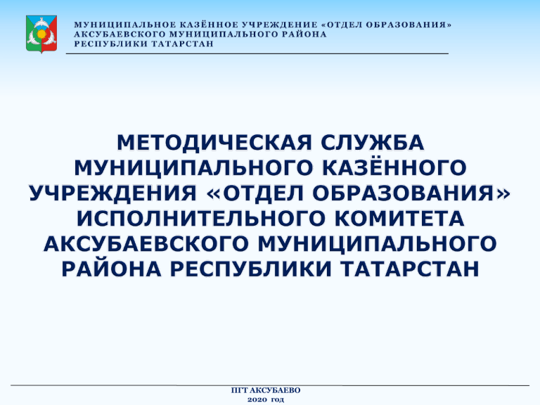 ПГТ АКСУБАЕВО 2020 год СТРУКТУРА МЕТОДИЧЕСКОЙ СЛУЖБЫ ПГТ АКСУБАЕВО Цели и задачи: • Содействие развитию муниципальной системы образования. • Оказание поддержки образовательным учреждениям в введении и реализации государственных образовательных стандартов общего образования. • Оказание методической помощи в обеспечении подготовки образовательных организаций к государственной итоговой аттестации, всероссийским проверочным работам. • Оказание методической помощи родителям в вопросах педагогики, возрастной психологии, воспитания и развития детей дошкольного и школьного возраста. • Обеспечение методического сопровождения деятельности методических объединений педагогов. • Совершенствование системы работы по оказанию методической помощи педагогам по проблемам, выявленным в результате диагностики и посещения образовательных организаций. • Содействие повышению профессиональной компетентности педагогических кадров в межкурсовой период. • Выявление, изучение, обобщение и распространение эффективной педагогической практики. ПГТ АКСУБАЕВО Проекты методистов, реализуемые в 2019-2020 учебном году «Психологическая компетентность педагога как фактор повышения качества образования», «Повышение уровня профессиональной компетенции преподавателей-организаторов ОБЖ», «Повышение профессиональной компетентности учителей русского языка и литературы через использование современных образовательных технологий», «Развитие профессиональных компетенций и устранения профессиональных дефицитов учителей естественно-научного цикла Аксубаевского муниципального района», «Повышение уровня профессиональной компетентности педагогов дошкольных образовательных учреждений Аксубаевского муниципального района», «Современные педагогические технологии как ресурс инновационного развития педагога». ПГТ АКСУБАЕВО Количество работников образования 95 Доля педагогических работников, имеющих квалификационную категорию 68 6,44 16,95 12 63,07 359 Руководители ОО Педагогические работники в ОО Руководители ДОУ 14,21 высшая квалификационная категория первая квалификационная категория прошли СЗД не прошли СЗД Воспитатели ДОУ ПГТ АКСУБАЕВО В Аксубаевском районе действуют 20 методических объединений, 3 ресурсных центра, 1 рабочая группа. В 2019-2020 году районным методическим кабинетом были проведены семинары для всех категорий педагогических работников: ДЛЯ РУКОВОДИТЕЛЕЙ И ЗАМЕСТИТЕЛЕЙ РУКОВОДИТЕЛЕЙ ОО: - МБОУ «Аксубаевская СОШ №3» - районный семинар «Использование эффективных форм, методов и приемов организации учебного и воспитательного процесса» для директоров школ; - МБДОУ «Радуга»- районный семинар «Внутрисадовский контроль как инструмент качества образования в ДОУ» для заведующих ДОУ и руководителей ОУ с дошкольным уровнем образования; - МБОУ «Староузеевская СОШ»- районный семинар «Система работы образовательных организаций по подготовке к государственной итоговой аттестации» для заместителей директоров ООШ и СОШ. ДЛЯ ШКОЛЬНЫх БИБЛИОТЕКАРЕЙ: - «Итоги работы РМО библиотекарей АМР за 2018-2019 учебный год, задачи на 2019-2020 у.г.»; - Работа школьной библиотеки в современных условиях; - Заказ учебников на 2020/21 учебный год. ПГТ АКСУБАЕВО ДЛЯ УЧИТЕЛЕЙ – ПРЕДМЕТНИКОВ: - Методический семинар «Особенности эффективной подготовки учащихся к ито