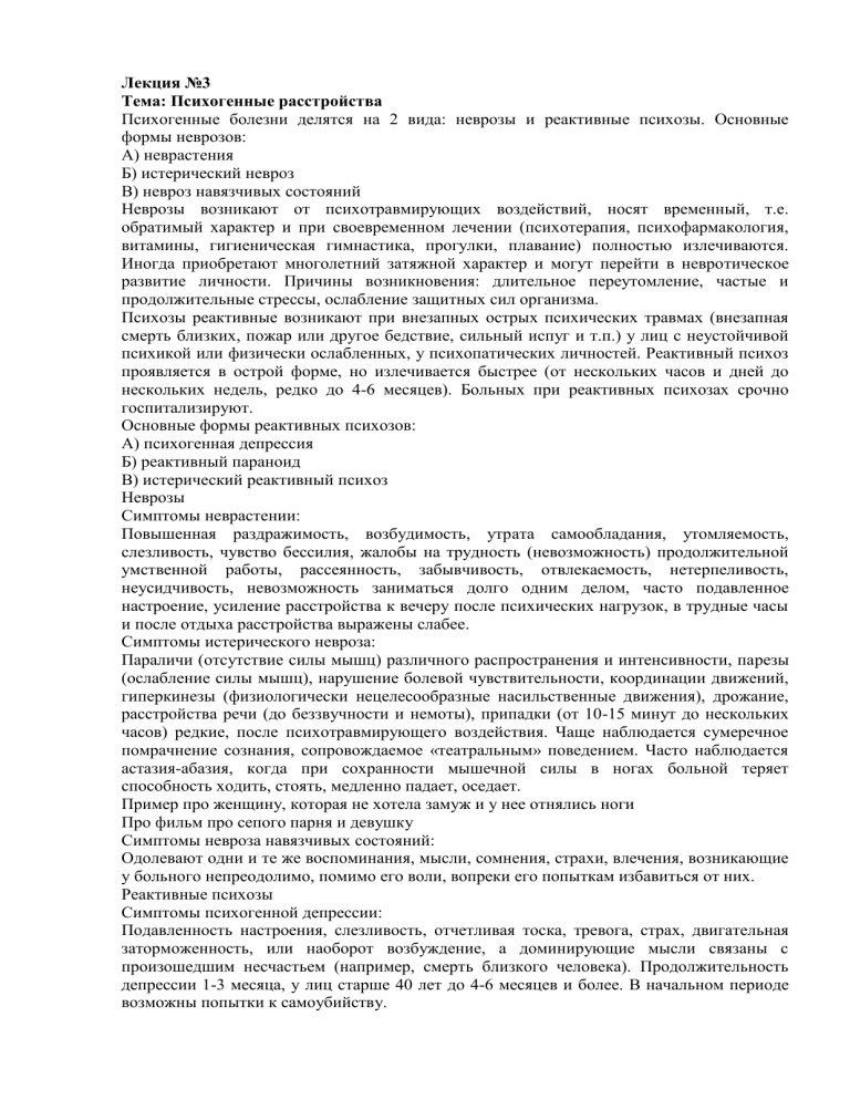 Лекция №3 Тема: Психогенные расстройства Психогенные болезни делятся на 2 вида: неврозы и реактивные психозы. Основные формы неврозов: А) неврастения Б) истерический невроз В) невроз навязчивых состояний Неврозы возникают от психотравмирующих воздействий, носят временный, т.е. обратимый характер и при своевременном лечении (психотерапия, психофармакология, витамины, гигиеническая гимнастика, прогулки, плавание) полностью излечиваются. Иногда приобретают многолетний затяжной характер и могут перейти в невротическое развитие личности. Причины возникновения: длительное переутомление, частые и продолжительные стрессы, ослабление защитных сил организма. Психозы реактивные возникают при внезапных острых психических травмах (внезапная смерть близких, пожар или другое бедствие, сильный испуг и т.п.) у лиц с неустойчивой психикой или физически ослабленных, у психопатических личностей. Реактивный психоз проявляется в острой форме, но излечивается быстрее (от нескольких часов и дней до нескольких недель, редко до 4-6 месяцев). Больных при реактивных психозах срочно госпитализируют. Основные формы реактивных психозов: А) психогенная депрессия Б) реактивный параноид В) истерический реактивный психоз Неврозы Симптомы неврастении: Повышенная раздражимость, возбудимость, утрата самообладания, утомляемость, слезливость, чувство бессилия, жалобы на трудность (невозможность) продолжительной умственной работы, рассеянность, забывчивость, отвлекаемость, нетерпеливость, неусидчивость, невозможность заниматься долго одним делом, часто подавленное настроение, усиление расстройства к вечеру после психических нагрузок, в трудные часы и после отдыха расстройства выражены слабее. Симптомы истерического невроза: Параличи (отсутствие силы мышц) различного распространения и интенсивности, парезы (ослабление силы мышц), нарушение болевой чувствительности, координации движений, гиперкинезы (физиологически нецелесообразные насильственные движения), дрожание, расстройства речи (до беззвучности и немоты), припадки (от 10-15 минут до нескольких часов) редкие, после психотравмирующего воздействия. Чаще наблюдается сумеречное помрачнение сознания, сопровождаемое «театральным» поведением. Часто наблюдается астазия-абазия, когда при сохранности мышечной силы в ногах больной теряет способность ходить, стоять, медленно падает, оседает. Пример про женщину, которая не хотела замуж и у нее отнялись ноги Про фильм про сепого парня и девушку Симптомы невроза навязчивых состояний: Одолевают одни и те же воспоминания, мысли, сомнения, страхи, влечения, возникающие у больного непреодолимо, помимо его воли, вопреки его попыткам избавиться от них. Реактивные психозы Симптомы психогенной депрессии: Подавленность настроения, слезливость, отчетливая тоска, тревога, страх, двигательная заторможенность, или наоборот возбуждение, а доминирующие мысли связаны с произошедшим несчастьем (например, смерть близкого человека). Продолжительность депрессии 1-3 месяца, у лиц старше 40 лет до 4-6 месяцев и более. В начальном периоде возможны попытки к самоубийству. Симптомы реактивного параноида: Острый чувственный бред, сопровождаемый тревогой и двигательным возбуждением. Бред – это объективно ложное суждение (или идея), возникающее у больного без соответствующих вн
