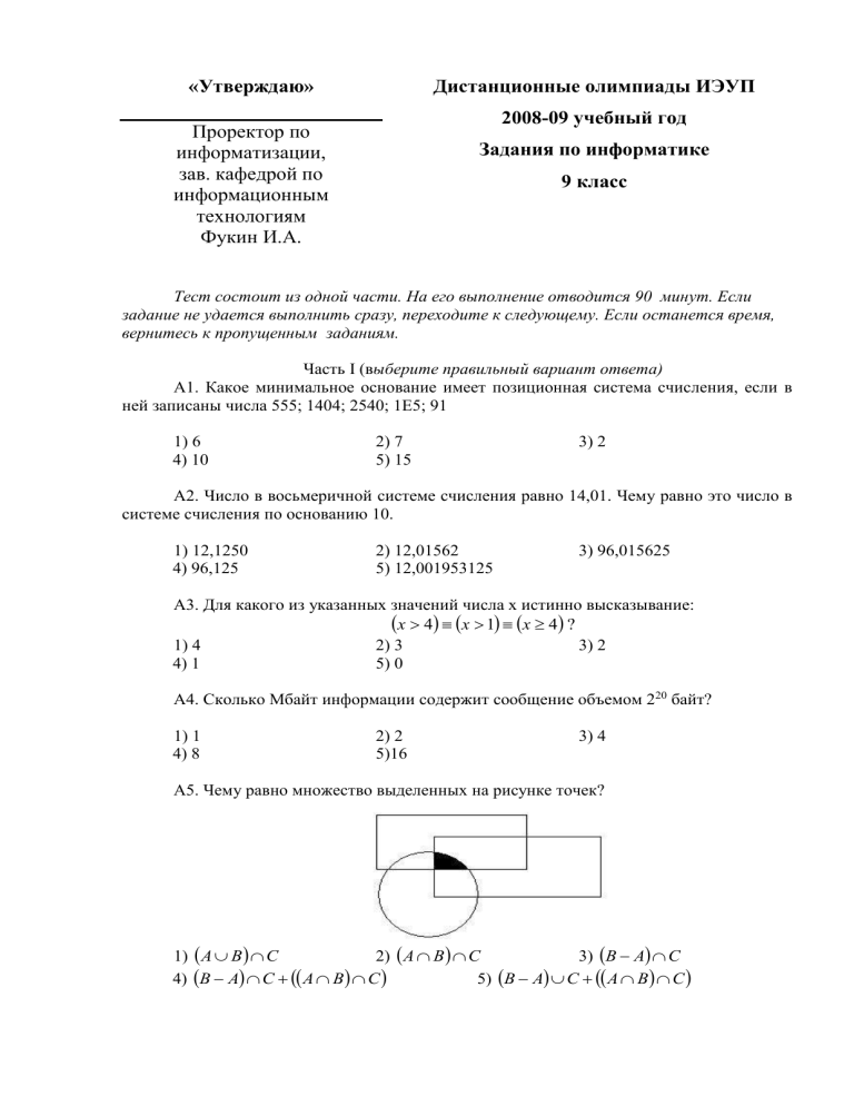 «Утверждаю» Дистанционные олимпиады ИЭУП 2008-09 учебный год Проректор по информатизации, зав. кафедрой по информационным технологиям Фукин И.А. Задания по информатике 9 класс Тест состоит из одной части. На его выполнение отводится 90 минут. Если задание не удается выполнить сразу, переходите к следующему. Если останется время, вернитесь к пропущенным заданиям. Часть I (выберите правильный вариант ответа) А1. Какое минимальное основание имеет позиционная система счисления, если в ней записаны числа 555; 1404; 2540; 1Е5; 91 1) 6 4) 10 2) 7 5) 15 3) 2 А2. Число в восьмеричной системе счисления равно 14,01. Чему равно это число в системе счисления по основанию 10. 1) 12,1250 4) 96,125 2) 12,01562 5) 12,001953125 3) 96,015625 А3. Для какого из указанных значений числа х истинно высказывание: x 4 x 1 x 4 ? 1) 4 2) 3 3) 2 4) 1 5) 0 А4. Сколько Мбайт информации содержит сообщение объемом 220 байт? 1) 1 4) 8 2) 2 5)16 3) 4 А5. Чему равно множество выделенных на рисунке точек? 1) A B C 2) A B C 3) B A C 4) B A C A B C 5) B A C A B C А6. Три подразделения А, В и С торговой фирмы стремились получить по итогам года прибыль. Экономисты высказали следующие предположения: • неверно, что подразделение В получит прибыль только тогда, когда получение прибыли подразделением Л не будет достаточным основанием для получения прибыли подразделением С; • получение прибыли подразделением С является необходимым для получения прибыли либо подразделением А, либо подразделением В; • неверно, что подразделение А получит прибыль только тогда, когда получит прибыль либо подразделение В, либо подразделение С. По завершению года оказалось, что одно из трех предположений ложно. Это означает, что прибыль получили 1) А, С 4) В, С Составитель: Романова И.А. Тел: 231-92-90 2) А, В, С 5) А 3) А, В