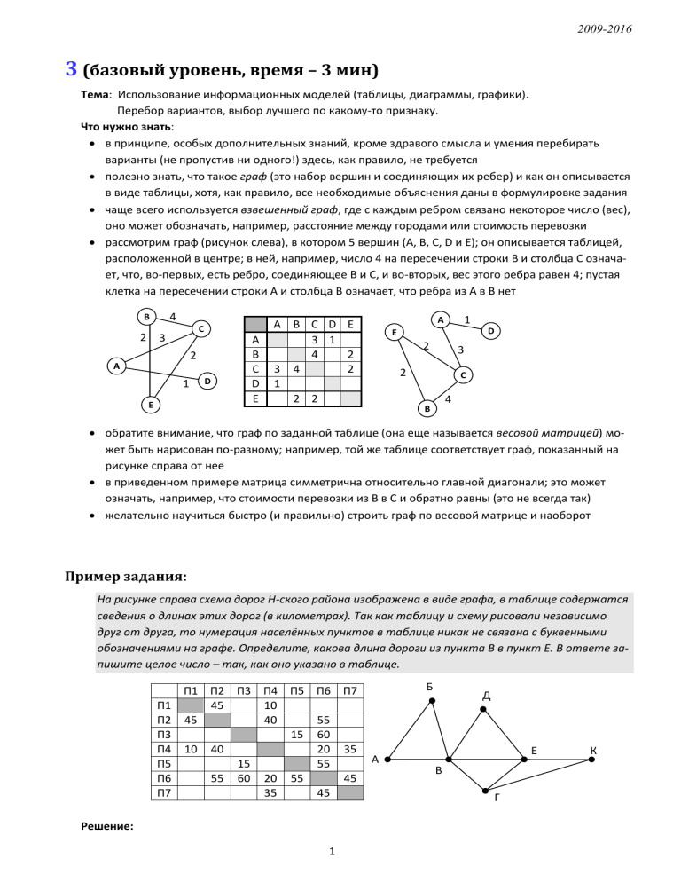 2009-2016 3 (базовый уровень, время – 3 мин) Тема: Использование информационных моделей (таблицы, диаграммы, графики). Перебор вариантов, выбор лучшего по какому-то признаку. Что нужно знать: в принципе, особых дополнительных знаний, кроме здравого смысла и умения перебирать варианты (не пропустив ни одного!) здесь, как правило, не требуется полезно знать, что такое граф (это набор вершин и соединяющих их ребер) и как он описывается в виде таблицы, хотя, как правило, все необходимые объяснения даны в формулировке задания чаще всего используется взвешенный граф, где с каждым ребром связано некоторое число (вес), оно может обозначать, например, расстояние между городами или стоимость перевозки рассмотрим граф (рисунок слева), в котором 5 вершин (A, B, C, D и E); он описывается таблицей, расположенной в центре; в ней, например, число 4 на пересечении строки В и столбца С означает, что, во-первых, есть ребро, соединяющее В и С, и во-вторых, вес этого ребра равен 4; пустая клетка на пересечении строки А и столбца В означает, что ребра из А в В нет 4 B 2 C 3 2 A 1 E D A B C D Е 1 A A B C D Е 3 1 4 2 3 4 2 1 2 2 D E 2 3 2 C 4 B обратите внимание, что граф по заданной таблице (она еще называется весовой матрицей) может быть нарисован по-разному; например, той же таблице соответствует граф, показанный на рисунке справа от нее в приведенном примере матрица симметрична относительно главной диагонали; это может означать, например, что стоимости перевозки из В в С и обратно равны (это не всегда так) желательно научиться быстро (и правильно) строить граф по весовой матрице и наоборот Пример задания: На рисунке справа схема дорог Н-ского района изображена в виде графа, в таблице содержатся сведения о длинах этих дорог (в километрах). Так как таблицу и схему рисовали независимо друг от друга, то нумерация населённых пунктов в таблице никак не связана с буквенными обозначениями на графе. Определите, какова длина дороги из пункта В в пункт Е. В ответе запишите целое число – так, как оно указано в таблице. П1 П2 П3 П4 П5 П6 П7 П1 45 10 П2 45 40 55 П3 15 60 П4 10 40 20 35 П5 15 55 П6 55 60 20 55 45 П7 35 45 Решение: 1 Б А Д Е В Г К 2009-2016 1) для того чтобы определить нужные нам вершины В и Е в весовой матрице, легче всего подсчитать степени вершин, то есть для каждой вершины найти количество рёбер, с которыми она связана (петля – ребро, которое соединяет вершину саму с собой, как кольцевая дорога, считается дважды) 2) в весовой матрице степень вершины – это количество непустых клеток в соответствующей строке (показаны справа от таблицы на жёлтом фоне), а для изображения графа- количество пересечений небольшой окружности, проведённой около вершины, со всеми рёбрами: П1 П1 П2 П3 П4 П5 П6 П7 П2 45 П3 45 П4 10 40 П5 15 10 40 55 15 60 20 35 П6 55 60 20 55 35 45 55 Б П7 45 2 3 2 4 2 5 2 2 Д 2 Е4 А 2 К 2 В5 Г 3 3) по изображению графа находим, что вершина В имеет степень 5, а вершина Е – степень 4 4) в таблице есть ровно одна вершина, степень которой 5 (это П6) и одна вершина, степень которой – 4 (П4), их соединяет ребро длиной 20 (эти ячейки выделены в весовой матрице фиолетовым фоном). 5) Ответ: 20. 6) Бонус: попытаемся теперь определить, как обозначены остальные вершины в таблице. Каждая из вершин Д (степени 2) и Г (степени 3) соединена с уже известными вершинами В и Е, по таблице находим, что вершина Д – это П7, а вершина Г – это П2. Тогда вершина К соединяется с Е (П4) и Г (П2), то есть К – это П1. А вот различить вершины А и Б по этим данным