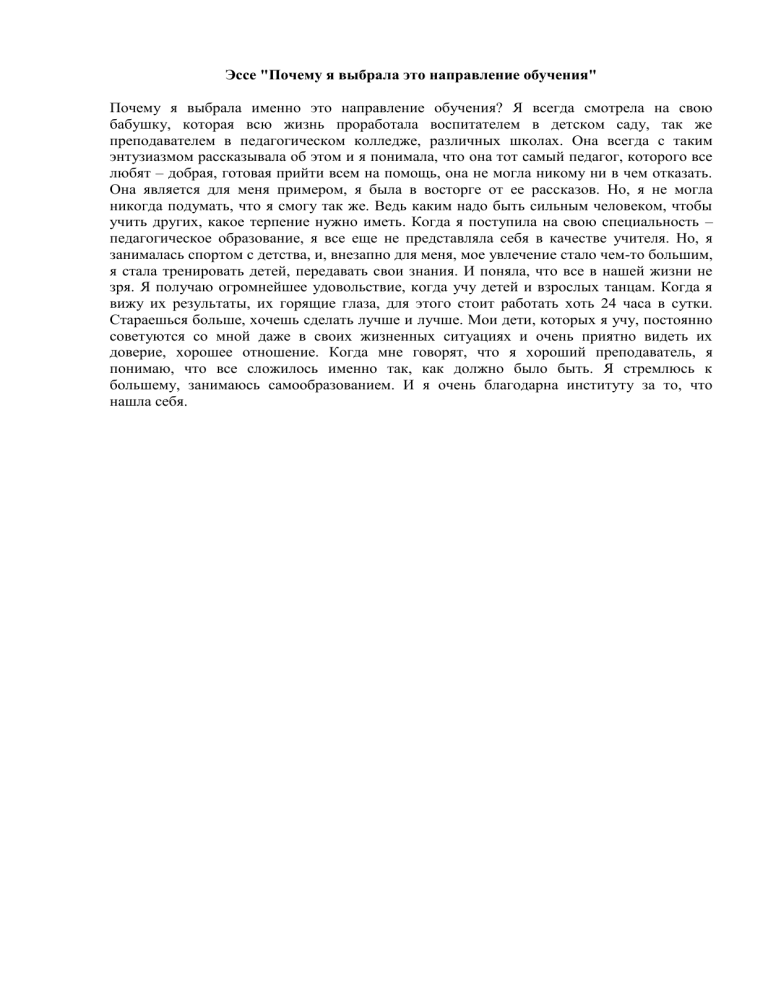 Эссе "Почему я выбрала это направление обучения" Почему я выбрала именно это направление обучения? Я всегда смотрела на свою бабушку, которая всю жизнь проработала воспитателем в детском саду, так же преподавателем в педагогическом колледже, различных школах. Она всегда с таким энтузиазмом рассказывала об этом и я понимала, что она тот самый педагог, которого все любят – добрая, готовая прийти всем на помощь, она не могла никому ни в чем отказать. Она является для меня примером, я была в восторге от ее рассказов. Но, я не могла никогда подумать, что я смогу так же. Ведь каким надо быть сильным человеком, чтобы учить других, какое терпение нужно иметь. Когда я поступила на свою специальность – педагогическое образование, я все еще не представляла себя в качестве учителя. Но, я занималась спортом с детства, и, внезапно для меня, мое увлечение стало чем-то большим, я стала тренировать детей, передавать свои знания. И поняла, что все в нашей жизни не зря. Я получаю огромнейшее удовольствие, когда учу детей и взрослых танцам. Когда я вижу их результаты, их горящие глаза, для этого стоит работать хоть 24 часа в сутки. Стараешься больше, хочешь сделать лучше и лучше. Мои дети, которых я учу, постоянно советуются со мной даже в своих жизненных ситуациях и очень приятно видеть их доверие, хорошее отношение. Когда мне говорят, что я хороший преподаватель, я понимаю, что все сложилось именно так, как должно было быть. Я стремлюсь к большему, занимаюсь самообразованием. И я очень благодарна институту за то, что нашла себя.