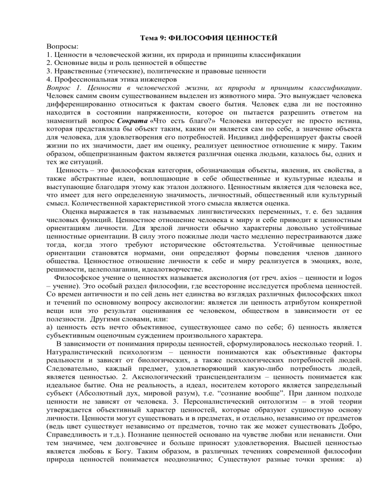 Тема 9: ФИЛОСОФИЯ ЦЕННОСТЕЙ Вопросы: 1. Ценности в человеческой жизни, их природа и принципы классификации 2. Основные виды и роль ценностей в обществе 3. Нравственные (этические), политические и правовые ценности 4. Профессиональная этика инженеров Вопрос 1. Ценности в человеческой жизни, их природа и принципы классификации. Человек самим своим существованием выделен из животного мира. Это вынуждает человека дифференцированно относиться к фактам своего бытия. Человек едва ли не постоянно находится в состоянии напряженности, которое он пытается разрешить ответом на знаменитый вопрос Сократа «Что есть благо?» Человека интересует не просто истина, которая представляла бы объект таким, каким он является сам по себе, а значение объекта для человека, для удовлетворения его потребностей. Индивид дифференцирует факты своей жизни по их значимости, дает им оценку, реализует ценностное отношение к миру. Таким образом, общепризнанным фактом является различная оценка людьми, казалось бы, одних и тех же ситуаций. Ценность – это философская категория, обозначающая объекты, явления, их свойства, а также абстрактные идеи, воплощающие в себе общественные и культурные идеалы и выступающие благодаря этому как эталон должного. Ценностным является для человека все, что имеет для него определенную значимость, личностный, общественный или культурный смысл. Количественной характеристикой этого смысла является оценка. Оценка выражается в так называемых лингвистических переменных, т. е. без задания числовых функций. Ценностное отношение человека к миру и себе приводит к ценностным ориентациям личности. Для зрелой личности обычно характерны довольно устойчивые ценностные ориентации. В силу этого пожилые люди часто медленно перестраиваются даже тогда, когда этого требуют исторические обстоятельства. Устойчивые ценностные ориентации становятся нормами, они определяют формы поведения членов данного общества. Ценностное отношение личности к себе и миру реализуется в эмоциях, воле, решимости, целеполагании, идеалотворчестве. Философское учение о ценностях называется аксиология (от греч. axios – ценности и logos – учение). Это особый раздел философии, где всесторонне исследуется проблема ценностей. Со времен античности и по сей день нет единства во взглядах различных философских школ и течений по основному вопросу аксиологии: является ли ценность атрибутом конкретной вещи или это результат оценивания ее человеком, обществом в зависимости от ее полезности. Другими словами, или: а) ценность есть нечто объективное, существующее само по себе; б) ценность является субъективным оценочным суждением произвольного характера. В зависимости от понимания природы ценностей, сформулировалось несколько теорий. 1. Натуралистический психологизм – ценности понимаются как объективные факторы реальности и зависят от биологических, а также психологических потребностей людей. Следовательно, каждый предмет, удовлетворяющий какую-либо потребность людей, является ценностью. 2. Аксиологический трансцендентализм – ценность понимается как идеальное бытие. Она не реальность, а идеал, носителем которого является запредельный субъект (Абсолютный дух, мировой разум), т.е. “сознание вообще”. При данном подходе ценности не зависят от человека. 3. Персоналистический онт