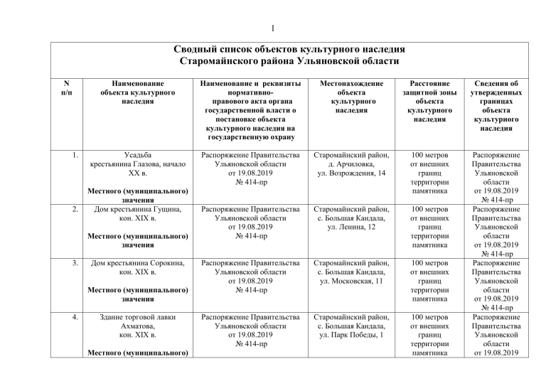 1 Сводный список объектов культурного наследия Старомайнского района Ульяновской области N п/п 1. 2. Наименование объекта культурного наследия Наименование и реквизиты нормативноправового акта органа государственной власти о постановке объекта культурного наследия на государственную охрану Местонахождение объекта культурного наследия Расстояние защитной зоны объекта культурного наследия Сведения об утвержденных границах объекта культурного наследия Усадьба крестьянина Глазова, начало ХХ в. Распоряжение Правительства Ульяновской области от 19.08.2019 № 414-пр Старомайнский район, д. Арчиловка, ул. Возрождения, 14 100 метров от внешних границ территории памятника Распоряжение Правительства Ульяновской области от 19.08.2019 № 414-пр Старомайнский район, с. Большая Кандала, ул. Ленина, 12 100 метров от внешних границ территории памятника Распоряжение Правительства Ульяновской области от 19.08.2019 № 414-пр Старомайнский район, с. Большая Кандала, ул. Московская, 11 100 метров от внешних границ территории памятника Распоряжение Правительства Ульяновской области от 19.08.2019 № 414-пр Старомайнский район, с. Большая Кандала, ул. Парк Победы, 1 100 метров от внешних границ территории памятника Распоряжение Правительства Ульяновской области от 19.08.2019 № 414-пр Распоряжение Правительства Ульяновской области от 19.08.2019 № 414-пр Распоряжение Правительства Ульяновской области от 19.08.2019 № 414-пр Распоряжение Правительства Ульяновской области от 19.08.2019 Местного (муниципального) значения Дом крестьянина Гущина, кон. ХIХ в. Местного (муниципального) значения 3. Дом крестьянина Сорокина, кон. ХIХ в. Местного (муниципального) значения 4. Здание торговой лавки Ахматова, кон. ХIХ в. Местного (муниципального) 2 № 414-пр значения 5. Дом крестьянина Ахматова, кон. ХIХ в. Местного (муниципального) значения 6. Дом крестьянина Марьина, кон. ХIХ в. Местного (муниципального) значения 7. Здание кладовой Ахматова, кон. ХIХ в. Местного (муниципального) значения 8. 9. Дом крестьянина Морозова, нач. ХХ в. Местного (муниципального) значения Церковь в честь Казанской иконы Божией Матери, 1-я пол. XIX в. Регионального значения Распоряжение Правительства Ульяновской области от 19.08.2019 № 414-пр Старомайнский район, с. Большая Кандала, ул. Парк Победы, 4 100 метров от внешних границ территории памятника Распоряжение Правительства Ульяновской области от 19.08.2019 № 414-пр Старомайнский район, с. Большая Кандала, ул. Ульяновская, 8 100 метров от внешних границ территории памятника Распоряжение Правительства Ульяновской области от 19.08.2019 № 414-пр Старомайнский район, с. Большая Кандала, ул. Ульяновская, 30 100 метров от внешних границ территории памятника Распоряжение Правительства Ульяновской области от 19.08.2019 № 414-пр Старомайнский район, с. ДмитриевоПомряскино, ул. Советская, 32 100 метров от внешних границ территории памятника Распоряжение Правительства Ульяновской области от 17.07.2017 № 343-пр Старомайнский район, 200 метров с. Дмитриевоот линии внешней Помряскино, стены памятника ул. Советская, 46 Распоряжение Правительства Ульяновской области от 19.08.2019 № 414-пр Распоряжение Правительства Ульяновской области от 19.08.2019 № 414-пр Распоряжение Правительства Ульяновской области от 19.08.2019 № 414-пр Распоряжение Правительства Ульяновской области от 19.08.2019 № 414-пр Не утверждены 10. Могила татарского поэта Гавдельджаббара Кандалый, 1797-1860 гг. Местн