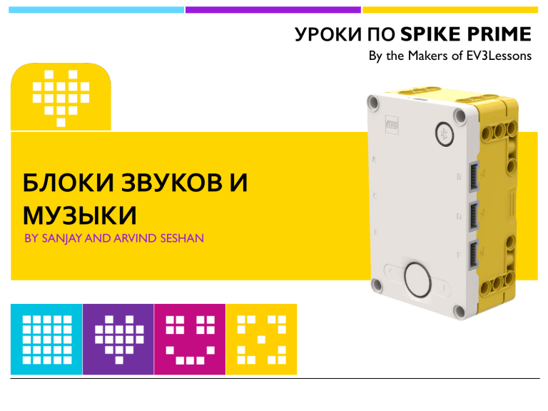 УРОКИ ПО SPIKE PRIME By the Makers of EV3Lessons БЛОКИ ЗВУКОВ И МУЗЫКИ BY SANJAY AND ARVIND SESHAN ЦЕЛЬ УРОКА Узнаем, как использовать блоки звуков. Узнаем, как создать и изменить звуки. Узнаем, как добавить Блоки Музыки на Палитре. Создадим музыку. Copyright © 2020 SPIKE Prime Lessons (primelessons.org) CC-BY-NC-SA. 2 БЛОКИ ЗВУКОВ Блоки Звуков находятся на двух Палитрах Блоков. Блоки Музыки должны быть добавлены к Вашей Палитре Блоков, используя Расширения. Вы можете играть ноты, изменять инструменты и даже создать свои звуки. Блоки Звуков могут быть добавлены к Вашим проектам для развлечения, но также и для отладки задач – например, они могут использоваться, чтобы указать, когда часть кода закончилась. Примечание: Только звуковой сигнал включения на самом деле играет на Хабе. Другие звуки играют на Вашем устройстве (ноутбук/планшет, и т.д.) Copyright © 2020 SPIKE Prime Lessons (primelessons.org) CC-BY-NC-SA. 3 ДОБАВЛЕНИЕ ЗВУКОВ Добавить больше звуков, можно используя выпадающее меню. В Библиотеке размещено много звуков. Выбрав звук, Вы можете также изменить его. Copyright © 2020 SPIKE Prime Lessons (primelessons.org) CC-BY-NC-SA. 4 ЗАПИСЬ СВОИХ ЗВУКОВ Вы можете сделать запись своих звуков двумя способами: или через «Запись» или «Add sound». Copyright © 2020 SPIKE Prime Lessons (primelessons.org) CC-BY-NC-SA. 5 ЗАДАЧА И РЕШЕНИЕ Выберем Блок Инструментов. Добавим Расширенные Блоки Музыки, нажав на Символ Расширений Палитры Блоков. Выберем любой инструмент. Составим короткую музыкальную композицию и проиграем её 4 раза. Выберем инструмент Кларнет Музыка проигрывается 4 раза используя Блок Цикла Играются 4 ноты Copyright © 2020 SPIKE Prime Lessons (primelessons.org) CC-BY-NC-SA. 6 CREDITS This lesson was created by Sanjay Seshan and Arvind Seshan for SPIKE Prime Lessons More lessons are available at www.primelessons.org This work is licensed under a Creative Commons Attribution-NonCommercial-ShareAlike 4.0 International License. Copyright © 2020 SPIKE Prime Lessons (primelessons.org) CC-BY-NC-SA. 7