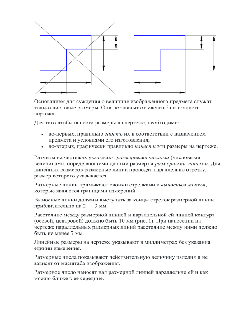 Основанием для суждения о величине изображенного предмета служат только числовые размеры. Они не зависят от масштаба и точности чертежа. Для того чтобы нанести размеры на чертеже, необходимо: во-первых, правильно задать их в соответствии с назначением предмета и условиями его изготовления; во-вторых, графически правильно нанести эти размеры на чертеже. Размеры на чертежах указывают размерными числами (числовыми величинами, определяющими данный размер) и размерными линиями. Для линейных размеров размерные линии проводят параллельно отрезку, размер которого указывается. Размерные линии примыкают своими стрелками к выносным линиям, которые являются границами измерений. Выносные линии должны выступать за концы стрелок размерной линии приблизительно на 2 — 3 мм. Расстояние между размерной линией и параллельной ей линией контура (осевой, центровой) должно быть 10 мм (рис. 1). При нанесении на чертеже параллельных размерных линий расстояние между ними должно быть не менее 7 мм. Линейные размеры на чертеже указывают в миллиметрах без указания единиц измерения. Размерные числа показывают действительную величину изделия и не зависят от масштаба изображения. Размерное число наносят над размерной линией параллельно ей и как можно ближе к ее середине. Основные правила нанесения размеров 1. Общее количество размеров на чертеже должно быть минимальным, но достаточным для изготовления и контроля изделия. 2. Размеры на чертежах указывают размерными линиями и размерными числами, в миллиметрах, без обозначения единиц измерения. 3. Размеры на чертеже проставляют соответственно действительным размерам изделия, независимо от масштаба изображения. 4. Выносные линии проводят от линии видимого контура; размерные линии предпочтительно наносить вне контура изображения. 5. При нанесении размера прямолинейного отрезка размерную линию проводят параллельно этому отрезку, а выносные линии перпендикулярно размерным. 6. Выносные линии должны выходить за концы стрелок размерных линий на 2 - 3 мм. 7. Необходимо избегать пересечения размерных и выносных линий. Ближе к контуру располагают меньший размер. Затем наносят большие размеры в порядке возрастания их величины. 8. Расстояние между размерной линией и параллельной ей линией контура (осевой, центровой) должно быть 10 мм. При нанесении на чертеже параллельных размерных линий расстояние между ними должно быть не менее 7 мм. 9. Расстояние между размерной линией и размерным числом принимают равным приблизительно 1-1,5 мм. 10. Размеры, относящиеся к одному и тому же конструктивному элементу (пазу, выступу, отверстию, фаске) рекомендуется группировать в одном месте, располагая их на том изображении, где геометрическая форма данного элемента показана наиболее полно. 11. При сочетании вида и разреза со стороны вида наносят размеры, относящиеся к внешнему устройству изделия, со стороны разреза - к внутреннему. 12. При изображении симметричного изделия размерную линию можно вычерчивать не полностью, обрывая ее за осевой или центровой линией. 13. Не допускается повторение размеров одного и того же элемента на разных изображениях. 14. Не допускается использовать в качестве размерных линий контурные, осевые, центровые и выносные линии. Размерная линия не должна служить продолжением контурной, осевой, центровой или выно