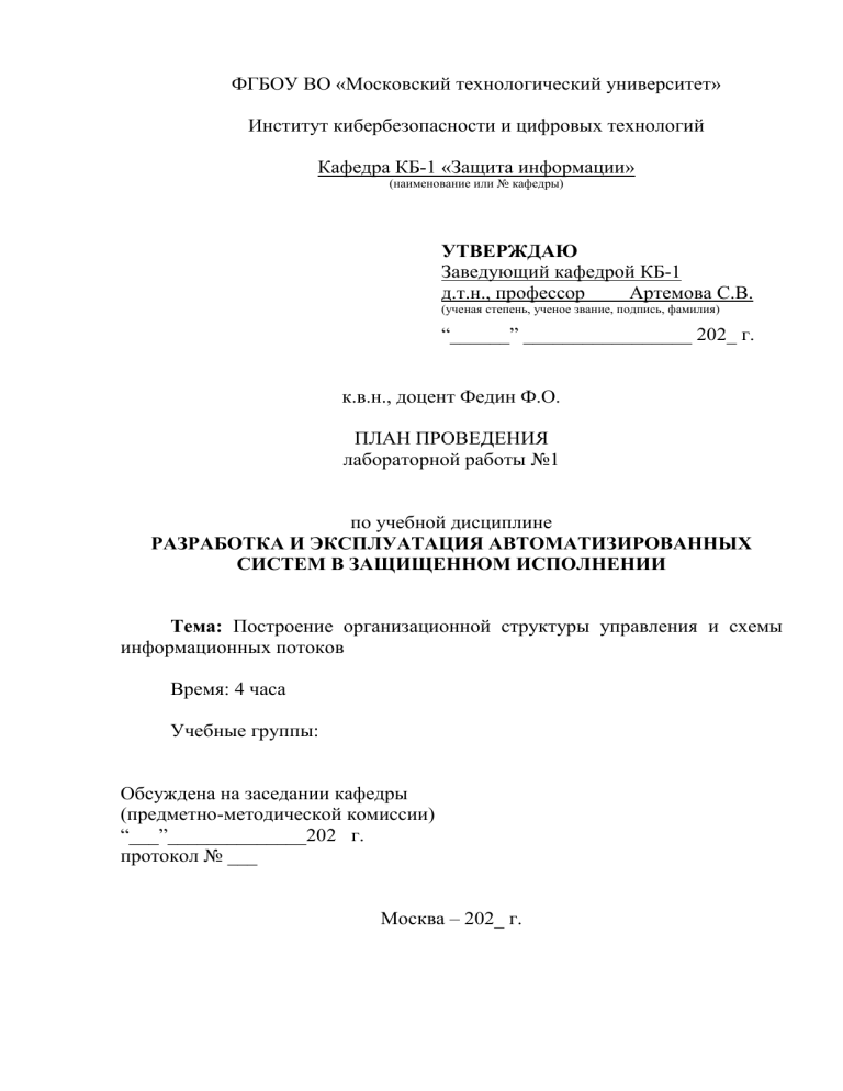 ФГБОУ ВО «Московский технологический университет» Институт кибербезопасности и цифровых технологий Кафедра КБ-1 «Защита информации» (наименование или № кафедры) УТВЕРЖДАЮ Заведующий кафедрой КБ-1 д.т.н., профессор Артемова С.В. (ученая степень, ученое звание, подпись, фамилия) “______” _________________ 202_ г. к.в.н., доцент Федин Ф.О. ПЛАН ПРОВЕДЕНИЯ лабораторной работы №1 по учебной дисциплине РАЗРАБОТКА И ЭКСПЛУАТАЦИЯ АВТОМАТИЗИРОВАННЫХ СИСТЕМ В ЗАЩИЩЕННОМ ИСПОЛНЕНИИ Тема: Построение организационной структуры управления и схемы информационных потоков Время: 4 часа Учебные группы: Обсуждена на заседании кафедры (предметно-методической комиссии) “___”______________202 г. протокол № ___ Москва – 202_ г. I) Учебные и воспитательные цели: 1. Углубить теоретические знания и выработать практические умения в области исследования предметной области, построения организационной структуры и схемы информационных потоков на объекте автоматизации. 2. Сформировать у студентов научное мировоззрение, высокие морально-психологические качества, привить любовь к своей профессии, стремление к повышению своего профессионального мастерства, творческий подход к выполнению поставленных задач, умение работать в коллективе, правильно оценивать результаты своего труда. Место проведения занятия: компьютерная аудитория. II) Учебные вопросы и расчет времени Содержание занятия Вступительная часть Проверить подготовленность к занятию. Объявить тему, цели занятия, учебные вопросы, порядок их отработки. Назвать учебную литературу. Учебные вопросы: 1) Построение схемы информационных потоков Заключительная часть Напомнить обучаемым вопросы, изученные на занятии, подчеркнуть важность отработанной тематики. Дать задание на самостоятельную подготовку, ответить на возможные вопросы обучаемых. III) Учебно-материальное обеспечение 1) Методическая разработка. Время, мин. 2) Компьютерный класс с ПЭВМ. 3) Средство структурной графики. IV) Литература Основная: 1) Рочев, К. В. Информационные технологии. Анализ и проектирование информационных систем: учебное пособие / К.В. Рочев. – СПб: Лань, 2019. – 128 с. – URL: https://e.lanbook.com/book/122181. 2) Ипатова, Э. Р. Методологии и технологии системного проектирования информационных систем: учебное пособие / Э.Р. Ипатова. – Москва: ФЛИНТА, 2016. — 256 с. – URL: https://e.lanbook.com/book/84356. Дополнительная: 1 Гвоздева, Т. В. Проектирование информационных систем. Стандартизация: учебное пособие / Т. В. Гвоздева, Б.А. Баллод. – СПб: Лань, 2019. – 252 с. 2 Брезгин, В.И. Моделирование бизнес‑процессов с AllFusion Process Modeler 4.1: Лабораторный практикум. Часть 2 / В.И. Брезгин. – Екатеринбург: Изд‑во Урал. ун‑та, 2015. — 52 с. 3 Маклаков С. В. Создание информационных систем с AllFusion Modeling Suite. – М.: ДИАЛОГ-МИФИ, 2009, с. 400. 4 Бахтизин, В.В. Технология разработки программного обеспечения: учеб. пособие / В.В. Бахтизин, Л.А. Глухова. – Минск: БГУИР, 2010. – 267 с. Задания для самостоятельной работы студентов Задание 1 В целях проектирования и разработки защищенной автоматизированной информационной системы своего варианта (варианты заданий см. файл Лаб1_Варианты заданий.docx) исследовать предметную область и самостоятельно построить и описать схему организационной структуры управления. Построение выполнить в инструментальном средстве структурной графики MS Visio (или аналогичном средстве структурной графики). Область автоматизации выд