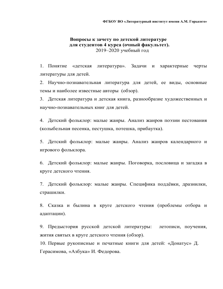 ФГБОУ ВО «Литературный институт имени А.М. Горького» Вопросы к зачету по детской литературе для студентов 4 курса (очный факультет). 2019–2020 учебный год 1. Понятие «детская литература». Задачи и характерные черты литературы для детей. 2. Научно-познавательная литература для детей, ее виды, основные темы и наиболее известные авторы (обзор). 3. Детская литература и детская книга, разнообразие художественных и научно-познавательных книг для детей. 4. Детский фольклор: малые жанры. Анализ жанров поэзии пестования (колыбельная песенка, пестушка, потешка, прибаутка). 5. Детский фольклор: малые жанры. Анализ жанров календарного и игрового фольклора. 6. Детский фольклор: малые жанры. Поговорка, пословица и загадка в круге детского чтения. 7. Детский фольклор: малые жанры. Специфика поддёвки, дразнилки, страшилки. 8. Сказка и былина в круге детского чтения (проблемы отбора и адаптации). 9. Предыстория русской детской литературы: летописи, поучения, жития святых в круге детского чтения (обзор). 10. Первые рукописные и печатные книги для детей: «Донатус» Д. Герасимова, «Азбука» И. Федорова. 11. Савватий, С. Полоцкий и К. Истомин – детям (обзор). «Лицевой букварь» К. Истомина – иллюстрированная энциклопедия для детей. 12. Книга «Юности честное зерцало», ее композиция и значение. 13. «Письмовник» Н. Курганова и «Детская философия» А. Болотова. 14. Н. И. Новиков и его первый детский журнал. Сказки Екатерины II. 15. Проза и поэзия Н. Карамзина для детей. 16. «Черная курица, или Подземные жители» А. Погорельского. Жанр, сюжет и воспитательное значение произведения. 17. Сочинения В. Одоевского в круге чтения современного школьника. Анализ сказки «Городок в табакерке». 18. Сказка П. Ершова «Конек-Горбунок», ее художественное своеобразие. Вопрос о главном герое. 19. Басни И. А. Крылова - неотъемлемая часть детской литературы. Народность, поучительность и художественное совершенство басен. 20. Стихи и сказки В. А. Жуковского для детей. Поэтическое состязание с А. С. Пушкиным. 21. Поэзия и проза А. С. Пушкина в детском и юношеском чтении (обзор). 22. Сказки А. С. Пушкина в круге детского чтения (обзор). Литературный источник «Сказки о золотом петушке». Статья А. Ахматовой «Последняя сказка Пушкина». 23. Поэзия и проза М. Ю. Лермонтова в круге чтения детей и подростков. Образ народа в стихотворении «Бородино». Сказка «Ашик-Кериб». 24. Образ ребенка в повести С.Т. Аксакова «Детские годы Багровавнука». А. Платонов о значении этой повести. 25. Стихи Н. А. Некрасова в круге детского и юношеского чтения. 26. Поэзия второй половины 19 века в круге чтения современного школьника. Поэты «чистого искусства» - детям: Ф. Тютчев, А. Фет, А. К. Толстой, А. Майков и др. 27. Поэзия второй половины 19 века в круге чтения современного школьника Поэты «некрасовской школы» - детям: И. Никитин, И. Суриков, А. Плещеев и др. 28. К. Д. Ушинский - автор учебных книг и детский писатель. 29. Л. Н. Толстой и детская литература. «Новая азбука» и «Русские книги для чтения». Трилогия «Детство», «Отрочество», «Юность». 30. Проза о детях и для детей в конце 19 - начале 20 в. (Д. Мамин- Сибиряк, А. Чехов, А. Куприн, В. Короленко, В. Гаршин, Н. ГаринМихайловский, К. Станюкович, Д. Григорович, М. Горький, Н. Телешов, А. Свирский и др.- обзор). 31. Поэты конца 19 - начала 20 в. и детская литература: И. Бунин, А. Блок, С. Есенин, К. Бальмонт, Саша Черный и др. (обзор). 32. М. Пришвин и детская литера