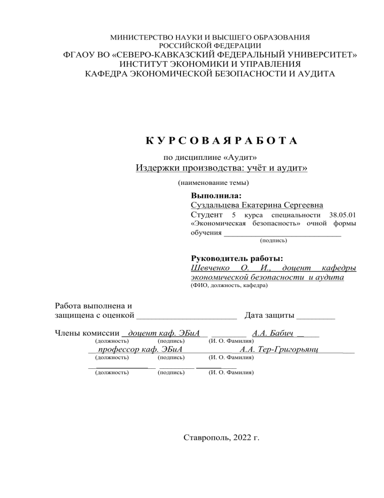 МИНИСТЕРСТВО НАУКИ И ВЫСШЕГО ОБРАЗОВАНИЯ РОССИЙСКОЙ ФЕДЕРАЦИИ ФГАОУ ВО «СЕВЕРО-КАВКАЗСКИЙ ФЕДЕРАЛЬНЫЙ УНИВЕРСИТЕТ» ИНСТИТУТ ЭКОНОМИКИ И УПРАВЛЕНИЯ КАФЕДРА ЭКОНОМИЧЕСКОЙ БЕЗОПАСНОСТИ И АУДИТА КУРСОВАЯРАБОТА по дисциплине «Аудит» Издержки производства: учёт и аудит» (наименование темы) Выполнила: Суздальцева Екатерина Сергеевна Студент 5 курса специальности 38.05.01 «Экономическая безопасность» очной формы обучения __________________________ (подпись) Руководитель работы: Шевченко О. И., доцент кафедры экономической безопасности и аудита (ФИО, должность, кафедра) Работа выполнена и защищена с оценкой __________________________ Дата защиты __________ Члены комиссии доцент каф. ЭБиА__ _________ А.А. Бабич_ ____ (должность) (подпись) __ профессор каф. ЭБиА (должность) __ (должность) (И. О. Фамилия) __А.А. Тер-Григорьянц (подпись) (И. О. Фамилия) __ _________ ____ (подпись) (И. О. Фамилия) Ставрополь, 2022 г. ___ УТВЕРЖДАЮ Заведующий кафедрой экономической безопасности и аудита _____________Л.И. Ушвицкий Институт __экономики и управления Кафедра___ экономической безопасности и аудита Направление (специальность) 38.05.01 Экономическая безопасность ЗАДАНИЕ на курсовую работу Студенту________дисциплины_Аудит_группы_ЭКБ-с-о-17-3__ факультета____________________________________________________ Фамилия, Имя, Отчество_Суздальцева Екатерина Сергеевна________________ 1.Тема__ Издержки производства: учёт и аудит» 2. Цель овладение методикой проведения проверок предприятий с разными правовыми формами организации __________________________________________ 3.Задачи 1) формирование у студентов навыков самостоятельного изучения учебной и дополнительной литературы по отдельным разделам аудита; 2) более углубленное изучение методов и методик аудита в отечественной и международной практике; 3) развитие навыков самостоятельной работы, овладение методикой научного исследования при решении разрабатываемых в курсовой работе проблем и вопросов; 4) выяснение степени практической подготовленности студентов для самостоятельной работы по проведению проверок предприятий с разными правовыми формами организации и отраслевой принадлежности Содержание расчетно-пояснительной записки (перечень подлежащих разработке вопросов) Теоретические основы аудиторской проверки бухгалтерского учета и отчетности_______________________________________________________ Учет как информационная база для проведения аудита__________________________________________________________ Методика проведения аудита ________________________________ Расчетная часть______________________________________________ 4.Литература, пособия 2 Аудит Электронный ресурс : учебник / Н.В. Левицкая / А.П. Колесникова / С.Е. Ганьшина / Н.С. Щербакова / И.А. Савин / В.И. Подольский / Л.В. Сотникова / А.А. Савин / З.А. Салихов / А.Е. Суглобов ; А.А. Савин ; ред. В.И. Подольский. Аудит,2020-10-10. - Москва : ЮНИТИ-ДАНА, 2017. - 687 c. - Книга находится в базовой версии ЭБС IPRbooks. - ISBN 978-5-238-02777-7, экземпляров неограничено 3 Аудит : учебник / А.Е. Суглобов, Б.Т. Жарылгасова, В.Ю. Савин, С.А. Хмелев, И.А. Донцов ; под ред. А. Е. Суглобов. - Москва : Издательско-торговая корпорация «Дашков и К°», 2016. - 368 с. : табл. - (Учебные издания для бакалавров). - http://biblioclub.ru/. - Библиогр. в кн. - ISBN 978-5-394-02458-0, экземпляров неограничено 2 Арабян, К. К. Теория аудита и организация аудиторской проверки / К.К. Арабян. Москва : Юнити-Дана, 2016. - 335 с. - ISBN 978-5-238-02744-9, экземпляров неограничено 5. Ендовицкий, Д. А. Международные стандарты аудиторской деятельности / Д.А. Ендовицкий ; И.В. Панина. - Москв