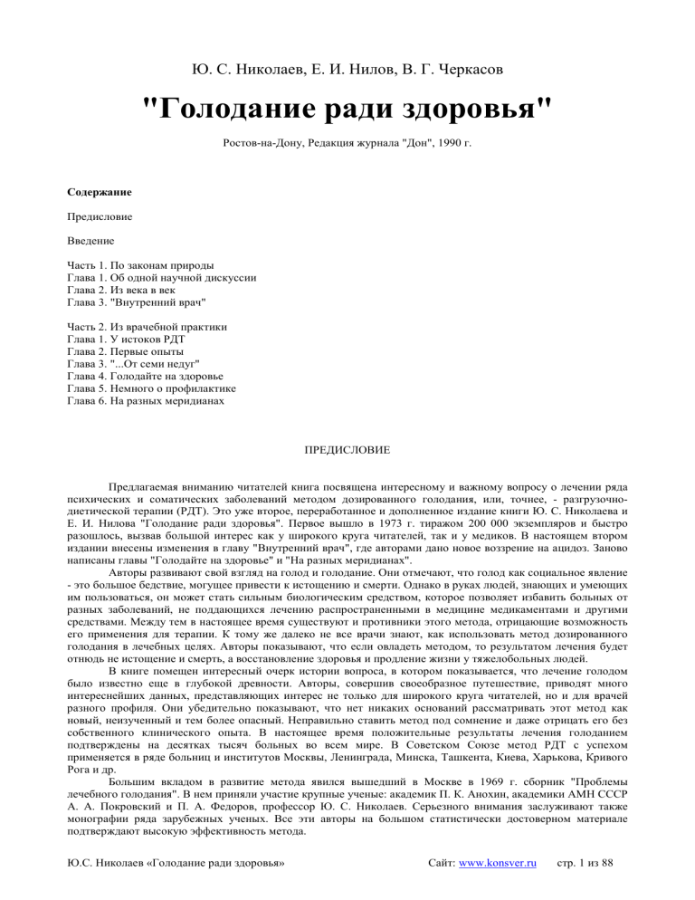 Ю. С. Николаев, Е. И. Нилов, В. Г. Черкасов "Голодание ради здоровья" Ростов-на-Дону, Редакция журнала "Дон", 1990 г. Содержание Предисловие Введение Часть 1. По законам природы Глава 1. Об одной научной дискуссии Глава 2. Из века в век Глава 3. "Внутренний врач" Часть 2. Из врачебной практики Глава 1. У истоков РДТ Глава 2. Первые опыты Глава 3. "...От семи недуг" Глава 4. Голодайте на здоровье Глава 5. Немного о профилактике Глава 6. На разных меридианах ПРЕДИСЛОВИЕ Предлагаемая вниманию читателей книга посвящена интересному и важному вопросу о лечении ряда психических и соматических заболеваний методом дозированного голодания, или, точнее, - разгрузочнодиетической терапии (РДТ). Это уже второе, переработанное и дополненное издание книги Ю. С. Николаева и Е. И. Нилова "Голодание ради здоровья". Первое вышло в 1973 г. тиражом 200 000 экземпляров и быстро разошлось, вызвав большой интерес как у широкого круга читателей, так и у медиков. В настоящем втором издании внесены изменения в главу "Внутренний врач", где авторами дано новое воззрение на ацидоз. Заново написаны главы "Голодайте на здоровье" и "На разных меридианах". Авторы развивают свой взгляд на голод и голодание. Они отмечают, что голод как социальное явление - это большое бедствие, могущее привести к истощению и смерти. Однако в руках людей, знающих и умеющих им пользоваться, он может стать сильным биологическим средством, которое позволяет избавить больных от разных заболеваний, не поддающихся лечению распространенными в медицине медикаментами и другими средствами. Между тем в настоящее время существуют и противники этого метода, отрицающие возможность его применения для терапии. К тому же далеко не все врачи знают, как использовать метод дозированного голодания в лечебных целях. Авторы показывают, что если овладеть методом, то результатом лечения будет отнюдь не истощение и смерть, а восстановление здоровья и продление жизни у тяжелобольных людей. В книге помещен интересный очерк истории вопроса, в котором показывается, что лечение голодом было известно еще в глубокой древности. Авторы, совершив своеобразное путешествие, приводят много интереснейших данных, представляющих интерес не только для широкого круга читателей, но и для врачей разного профиля. Они убедительно показывают, что нет никаких оснований рассматривать этот метод как новый, неизученный и тем более опасный. Неправильно ставить метод под сомнение и даже отрицать его без собственного клинического опыта. В настоящее время положительные результаты лечения голоданием подтверждены на десятках тысяч больных во всем мире. В Советском Союзе метод РДТ с успехом применяется в ряде больниц и институтов Москвы, Ленинграда, Минска, Ташкента, Киева, Харькова, Кривого Рога и др. Большим вкладом в развитие метода явился вышедший в Москве в 1969 г. сборник "Проблемы лечебного голодания". В нем приняли участие крупные ученые: академик П. К. Анохин, академики АМН СССР А. А. Покровский и П. А. Федоров, профессор Ю. С. Николаев. Серьезного внимания заслуживают также монографии ряда зарубежных ученых. Все эти авторы на большом статистически достоверном материале подтверждают высокую эффективность метода. Ю.С. Николаев «Голодание ради здоровья» Сайт: www.konsver.ru стр. 1 из 88 По решению президиума АМН СССР и президиума Ученого совета Министерства здравоохр