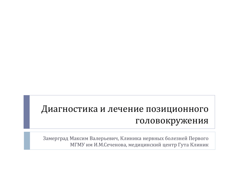 Диагностика и лечение позиционного головокружения Замерград Максим Валерьевич, Клиника нервных болезней Первого МГМУ им И.М.Сеченова, медицинский центр Гута Клиник Содержание Доброкачественное пароксизмальное позиционное головокружение Центральное позиционное головокружение Рецидивирующее позиционное Спонтанное впервые возникшее Головокружение Хроническое персистирующее (неустойчивость) Спонтанное рецидивирующее Причины позиционного головокружения Повреждение центральных отделов вестибулярной системы (например, при краниовертебральных аномалиях, опухолях задней черепной ямки) Повреждения вестибулярного нерва («вестибулярная пароксизмия» вследствие нейро-васкулярного конфликта VIII ЧМН) Повреждение лабиринта (ДППГ, алкогольная интоксикация) Физиологическое позиционное головокружение (головокружение при запрокидывании головы) Доброкачественное пароксизмальное позиционное головокружение Доброкачественное пароксизмальное позиционное головокружение – заболевание, характеризующееся приступами головокружения, возникающего при перемене положения головы, и обусловленное, вероятно, проникновением отолитовых частиц в полукружные канала внутреннего уха. Роберт Барани Эпидемиология ДППГ К 70-летнему возрасту 30% людей хотя бы однажды испытали приступ ДППГ. 20-30% пациентов специализированных клиник обращаются к врачу именно по поводу ДППГ. Данные медицинского центра Гута Клиник: среди всех больных, обратившихся на амбулаторный прием с жалобами на головокружение, ДППГ выявлено в 33,9% случаев. 64% больных – женщины, 36% - мужчины. Причины системного головокружения у 385 пациентов, обратившихся на амбулаторный прием к неврологу 1 0,8 1,2 5,5 11,7 ДППГ Болезнь Меньера 50,4 Вестибулярный нейронит Вестибулярная мигрень 29,4 Вестибулярная пароксизмия Инсульт Другие ДППГ – доброкачественное пароксизмальное позиционное головокружение Замерград М.В. С соавт., Неврологический журнал, 2014: 2 Этиология ДППГ Идиопатическое ДППГ (нарушения метаболизма статолитов, нарушения обмена кальция, ишемия лабиринта, старение) Травма головы Длительный постельный режим Вестибулярный нейронит или лабиринтит Хирургические вмешательства на среднем или внутреннем ухе ? Патогенез ДППГ Теория купулолитиаза (Schuknecht , 1969) Теория каналолитиаза (Parnes, McClure, 1991) ДППГ: локализация повреждения 2% 18% 80% Канало- и купулолитиаз заднего полукружного канала Классическая клиническая картина каналолитиаза заднего полукружного канала • Головокружение возникает при изменении положения головы: при укладывании, при повороте на бок, при запрокидывании головы • Головокружение появляется после латентного периода (1-60 сек) • Нистагм обычно продолжается 5-20 сек • Нистагм и головокружение истощаются при повторной стимуляции • Помимо позиционного головокружения больные часто жалуются на неустойчивость (отолитовое головокружение), тошноту, ощущение укачивания, осциллопсию Диагностика канало- и купулолитиаза заднего полукружного канала: проба Дикса-Холлпайка Диагностика канало- и купулолитиаза заднего полукружного канала: проба Брандта-Дароффа Правила проведения позиционных тестов Первую пробу проводят в сторону того уха, вероятность повреждения которого максимальна Перед исследованием объясняют больному особенности методики и предупреждают о возможном голов