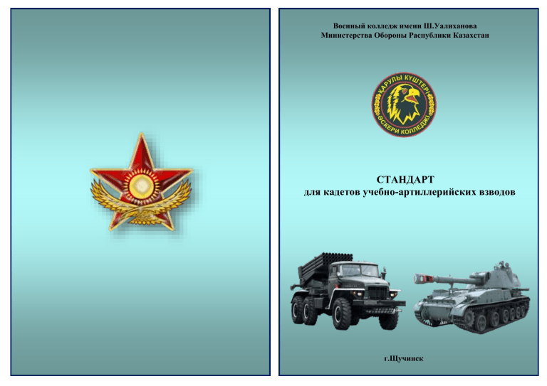 Военный колледж имени Ш.Уалиханова Министерства Обороны Распублики Казахстан СТАНДАРТ для кадетов учебно-артиллерийских взводов г.Щучинск № п/п 1. 2. 3. 4. 5. 6. 7. 8. 9. 10. 11. 12. 13. 14. 15. 16. 17. 18. 19. 20. 21. 22. 23. 24. 25. 26. 27. 28. 29. 30. Наименование задаваемых вопросов стр. Боевой приказ командира орудия Распоряжение командира отделения разведки на занятие КНП Распоряжение командира отделения разведки на организацию разведки Маскировка достигается Способы ориентирования на местности Виды огня артиллерии При поражении цели в зависимости от её характера, важности и условий обстановки задачами стрельбы могут быть Назначение и задачи стрельбы прямой наводкой Способы определения установок для стрельбы Прибор управления огнем (ПУО) предназначен Предназначение 122 мм гаубицы Д-30 Предназначение боевой машины БМ-21 Предназначение 152 мм гаубицы Эксплуатационные документы предназначены Виды технического обслуживания при использовании вооружения Дирекционный угол Командно-наблюдательный пункт предназначен Оптическими приборами называются Перископическая артиллерийская буссоль ПАБ-2А предназначена Перечень основных проверок технического состояния ПАБ2М Схема ориентиров предназначено Топогеодезическая привязка наблюдательного пункта заключается Координатами называют Обратная геодезическая задача Прямая геодезическая задача Что называется огневой позицией и что она включает? Дать определение точке наводки Что называют угломером Что входит в экипировку командира орудия Какое имущество должно быть при орудии? 2 № п/п 1. 2 2. 2 3. 3 3 3 4. 1 Фамилия и инициалы Номер вопроса Оценка 5. 6. 4 7. 4 5 5 5 5 6 6 8. 6 13. 6 6 6 14. 7 16. 7 9. 10. 11. 12. 15. 17. 7 18. 7 19. 8 8 8 8 8 9 9 9 20. 21. 22. 23. 24. 25. 14 Дата Кто опрашивал № п/п Фамилия и инициалы Номер вопроса Оценка Дата 1. 2. 3. 4. 5. 6. 7. 8. 9. 10. Кто опрашивал Боевой приказ командира орудия: 1)сведения о противнике; 2)задачу общевойскового подразделения (части); 3)задачу взвода; 4)основное направление стрельбы (основные угломеры по основной и запасной точкам наводки); 5)огневые задачи орудия и порядок их выполнения (исчисленные установки для стрельбы); 6)порядок подготовки орудия и боеприпасов к стрельбе, количество боеприпасов, которое необходимо подготовить; 7)сектор обстрела, порядок действий расчета при отражении атаки танков и пехоты противника, прорвавшихся к огневой позиции; 8)порядок инженерного оборудования огневой позиции; 9)сигналы управления и оповещения, порядок действий по ним, наблюдателя за сигналами; 10)своего заместителя. 11. Распоряжение командира отделения разведки на занятие КНП 1)сведения о противнике; 2)передний край общевойскового подразделения; 3)место КНП; 4)маршрут выдвижения и порядок подхода к КНП; 5)места установки приборов наблюдения и способ их ориентирования; 6)основное направление стрельбы; 7)время начала разведки. 12. 13. 14. 15. 16. 17. 18. 19. 20. 21. 22. 23. 24. 25. 13 Распоряжение командира отделения разведки на организацию разведки 1)условные наименования местных предметов и ориентиры; 2)сведения о противнике (состав, положение и характер действий противника, места расположения его огневых средтсв); 3)передний край и расположение своих войск; 4)задачи и полосу разведки отделения; 5)задачи и сектор (объект, направление) разведки каждому должностному лицу отделения; 6)порядок инженерного оборудования; 7)сигналы и порядок дйствий по ним; 8)наблюдателя за сигна