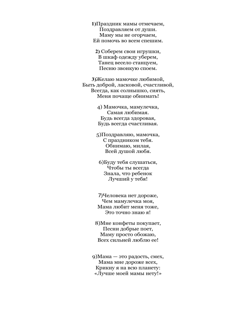 1)Праздник мамы отмечаем, Поздравляем от души. Маму мы не огорчаем, Ей помочь во всем спешим. 2) Соберем свои игрушки, В шкаф одежду уберем, Танец весело станцуем, Песню звонкую споем. 3)Желаю мамочке любимой, Быть доброй, ласковой, счастливой, Всегда, как солнышко, сиять, Меня почаще обнимать! 4) Мамочка, мамулечка, Самая любимая. Будь всегда здоровая, Будь всегда счастливая. 5)Поздравляю, мамочка, С праздником тебя. Обнимаю, милая, Всей душой любя. 6)Буду тебя слушаться, Чтобы ты всегда Знала, что ребенок Лучший у тебя! 7)Человека нет дороже, Чем мамулечка моя, Мама любит меня тоже, Это точно знаю я! 8)Мне конфеты покупает, Песни добрые поет, Маму просто обожаю, Всех сильней люблю ее! 9)Мама — это радость, смех, Мама мне дороже всех, Крикну я на всю планету: «Лучше моей мамы нету!» 10)Мамочка, любимая, Самая родная, Добрая, красивая, Милая такая. 11)Почитаешь сказку И игрушку купишь, Даришь нежность, ласку, Крепко меня любишь! 12)Как солнышко, ты светлая, Как облака, ты мягкая, Как перышко, ты нежная, Как ягодка, ты сладкая. 13)Как океан, ты сильная, Как звездочка — красивая, Как небеса — ванильная, Ты — мамочка любимая! 14)Моей мамочке любимой Пожелаю навсегда, Быть здоровой и счастливой, Яркой, как кинозвезда! 15)Лучше всех моя мамуля, Больше всех ее люблю я! Нет в мире никого мудрей Любимой мамочки моей 16)С днем матери, милая мама! Здоровья желаем тебе. Ты любимая, самая-самая, Самая лучшая ты на Земле! 17)Вас, так сильно, мамочки, Любят малыши, И споют вам песенку Хором от души!