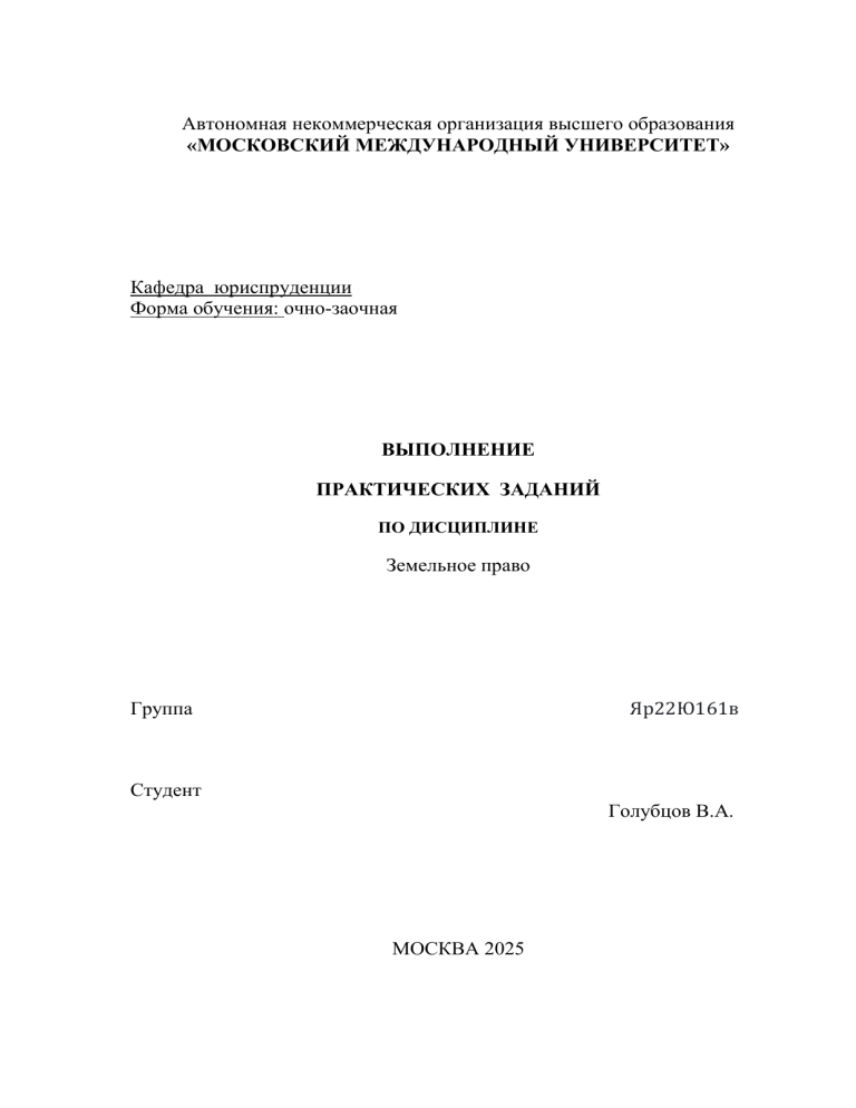 Автономная некоммерческая организация высшего образования «МОСКОВСКИЙ МЕЖДУНАРОДНЫЙ УНИВЕРСИТЕТ» Кафедра юриспруденции Форма обучения: очно-заочная ВЫПОЛНЕНИЕ ПРАКТИЧЕСКИХ ЗАДАНИЙ ПО ДИСЦИПЛИНЕ Земельное право Яр22Ю161в Группа Студент Голубцов В.А. МОСКВА 2025 Задача 1. Мурманская областная Дума обратилась в Конституционный Суд РФ, оспаривая конституционность следующих положений ЗК РФ, регулирующих представление земельных участков в собственность иностранным гражданам, лицам без гражданства и иностранным юридическим лицам: п. 3 ст. 15 ЗК РФ: (Иностранные граждане, лица без гражданства и иностранные юридические лица не могут обладать на праве собственности земельными участками, находящимися на приграничных территориях, перечень которых устанавливается Президентом РФ в соответствии с федеральным законодательством о Государственной границе РФ, и на иных установленных особо территориях Российской Федерации в соответствии с федеральными законами), как допускающего в принципе право указанных лиц на приобретение в собственность земельных участков вне приграничных территорий. По мнению заявителя, норма ЗК РФ противоречат Конституции РФ, так как: - земля является основой жизни и деятельности народов, проживающих на соответствующей территории, в данном случае к таким народам относятся только народы Российской Федерации; - закон не может ограничивать и перераспределять эту основу, право на нее в пользу лиц, не относящихся к народам Российской Федерации; - из Конституции РФ следует, что субъектом права частной собственности на землю могут быть только российские граждане и их объединения; - предоставление иностранным гражданам, лицам без гражданства и иностранным юридическим лицам права собственности на землю умаляет (ограничивает) территориальную основу жизни и деятельности народов Российской Федерации, создает возможность отторжения земли иностранному государству посредством сделок или предъявления территориальных претензий к Российской Федерации, может привести к нарушению суверенитета Российской Федерации. Оцените позицию Мурманской областной Думы. Решение В соответствии Постановление Конституционного Суда РФ от 23.04.2004 N 8-П "По делу о проверке конституционности Земельного кодекса Российской Федерации в связи с запросом Мурманской областной Думы" 1. Признать положения пункта 3 статьи 15, пункта 12 статьи 30, пункта 5 статьи 35, пункта 9 статьи 36, статей 38 и 52 Земельного кодекса Российской Федерации не противоречащими Конституции Российской Федерации.2. Признать Земельный кодекс Российской Федерации по порядку его принятия Государственной Думой не противоречащим Конституции Российской Федерации. 3. Настоящее Постановление окончательно, не подлежит обжалованию, вступает в силу немедленно после провозглашения, действует непосредственно и не требует подтверждения другими органами и должностными лицами. 4. Согласно статье 78 Федерального конституционного закона "О Конституционном Суде Российской Федерации" настоящее Постановление подлежит незамедлительному опубликованию в "Российской газете" и "Собрании законодательства Российской Федерации". Постановление должно быть опубликовано также в "Вестнике Конституционного Суда Российской Федерации". Статья 3 ФЗ "О гражданстве" 2002г. дает следующее определение гражда
