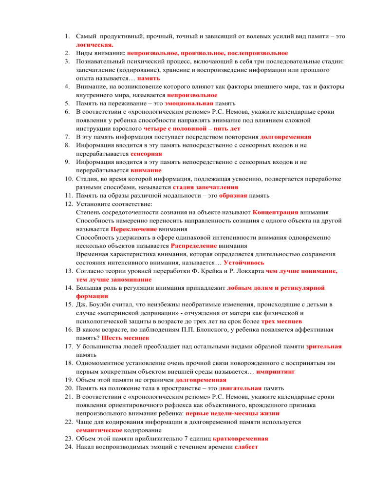 1. Самый продуктивный, прочный, точный и зависящий от волевых усилий вид памяти – это логическая. 2. Виды внимания: непроизвольное, произвольное, послепроизвольное 3. Познавательный психический процесс, включающий в себя три последовательные стадии: запечатление (кодирование), хранение и воспроизведение информации или прошлого опыта называется… память 4. Внимание, на возникновение которого влияют как факторы внешнего мира, так и факторы внутреннего мира, называется непроизвольное 5. Память на переживание – это эмоциональная память 6. В соответствии с «хронологическим резюме» Р.С. Немова, укажите календарные сроки появления у ребенка способности направлять внимание под влиянием сложной инструкции взрослого четыре с половиной – пять лет 7. В эту память информация поступает посредством повторения долговременная 8. Информация вводится в эту память непосредственно с сенсорных входов и не перерабатывается сенсорная 9. Информация вводится в эту память непосредственно с сенсорных входов и не перерабатывается внимание 10. Стадия, во время которой информация, подлежащая усвоению, подвергается переработке разными способами, называется стадия запечатления 11. Память на образы различной модальности – это образная память 12. Установите соответствие: Степень сосредоточенности сознания на объекте называют Концентрация внимания Способность намеренно переносить направленность сознания с одного объекта на другой называется Переключение внимания Способность удерживать в сфере одинаковой интенсивности внимания одновременно несколько объектов называется Распределение внимания Временная характеристика внимания, которая определяется длительностью сохранения состояния интенсивного внимания, называется… Устойчивось 13. Согласно теории уровней переработки Ф. Крейка и Р. Локхарта чем лучше понимание, тем лучше запоминание 14. Большая роль в регуляции внимания принадлежит лобным долям и ретикулярной формации 15. Дж. Боулби считал, что неизбежны необратимые изменения, происходящие с детьми в случае «материнской депривации» - отчуждения от матери как физической и психологической защиты в возрасте до трех лет на срок более трех месяцев 16. В каком возрасте, по наблюдениям П.П. Блонского, у ребенка появляется аффективная память? Шесть месяцев 17. У большинства людей преобладает над остальными видами образной памяти зрительная память 18. Одномоментное установление очень прочной связи новорожденного с воспринятым им первым конкретным объектом внешней среды называется… импринтинг 19. Объем этой памяти не ограничен долговременная 20. Память на положение тела в пространстве – это двигательная память 21. В соответствии с «хронологическим резюме» Р.С. Немова, укажите календарные сроки появления ориентировочного рефлекса как объективного, врожденного признака непроизвольного внимания ребенка: первые недели-месяцы жизни 22. Чаще для кодирования информации в долговременной памяти используется семантическое кодирование 23. Объем этой памяти приблизительно 7 единиц кратковременная 24. Накал воспроизводимых эмоций с течением времени слабеет 25. Под действием сильных эмоций запечатлеваемая информация искажается 26. Физиологической основой внимания является концентрация возбуждения в определенных участках коры головного мозга, в очагах оптима
