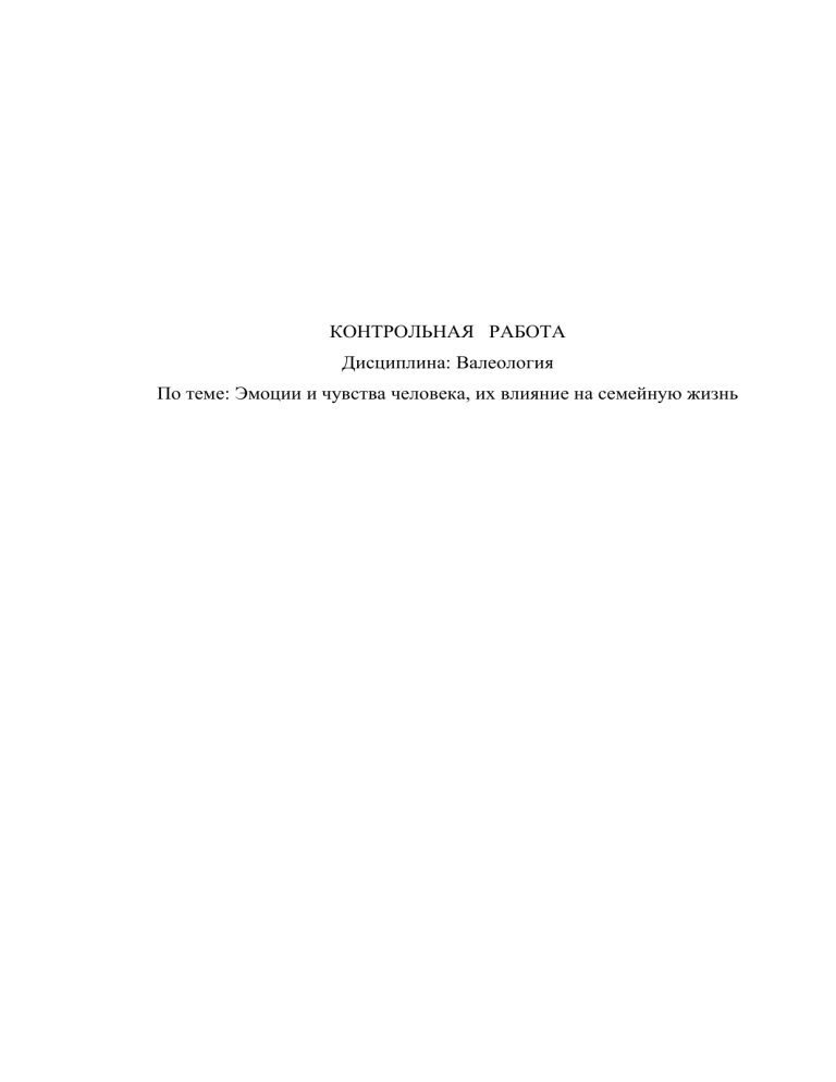 КОНТРОЛЬНАЯ РАБОТА Дисциплина: Валеология По теме: Эмоции и чувства человека, их влияние на семейную жизнь 2 Содержание Введение 3 1. Эмоции и чувства 4 2. Функции, виды и формы эмоций 10 3. Влияние эмоций на семейную жизнь 20 Заключение 23 Список использованной литературы 24 3 Введение Эмоции — особый класс субъективных психологических состояний, отражающих в форме непосредственных переживаний, ощущений приятного или неприятного, отношения человека к миру и людям, процесс и результаты его практической деятельности. Эмоции и чувства выражают наше отношение к тому, что мы познаем, к нашим поступкам. Знания об эмоциях необходимы каждому для того, чтобы лучше понять других и самих себя. Не понимая себя, невозможно понять другого человека. Эмоции образуют основную побудительную силу и своим влиянием способны изменить образ жизни, действий и общения. Неспособность или нежелание понять эмоциональное состояние другого человека приводит к психологической несовместимости и нередко становится причиной тех или иных конфликтов. Роль эмоциональных побуждений трудно переоценить. Духовный мир человека не определяется рамками его профессии или образования. Его эмоциональные запросы и отношения могут быть многосторонними или узкими, широкими, богатыми или бедными, ограниченными. Эмоциональный компонент выполняет особую функцию в структуре мотивации. Эмоция, возникающая в составе мотивации, играет важную роль в определении направленности поведения и способов его реализации. Целью работы является рассмотреть эмоции и чувства в деятельности человека, а так же их влияние на семейную жизнь. 4 1. Эмоции и чувства Эмоции и чувства составляют особую, очень важную сторону внутренней жизни человека. Все мы в каждый момент находимся в определенном эмоциональном состоянии, переживаем те или иные чувства. Эмоциональные проявления человека очень разнообразны: радость, горе, страх, гнев, удивление, грусть, тревога, восхищение, презрение и т. д. Мир эмоциональных переживаний пронизывает все стороны жизни: отношения с окружающими людьми, деятельность, общение и познание. Одна из сфер человеческой деятельности – искусство – непосредственно обращена к эмоциям и чувствам человека. Эмоции представляют собой пристрастное отношение субъекта к окружающему и к тому, что с ним происходит1. Механизм возникновения эмоций тесно связан с потребностями и мотивами человека. Условия, предметы и явления, способствующие удовлетворению потребностей и достижению целей, вызывают положительные эмоции: удовольствие, радость, интерес, возбуждение. Напротив, ситуации, воспринимаемые субъектом как препятствующие реализации потребностей и целей, вызывают отрицательные эмоции и переживания: неудовольствие, горе, печаль, страх, грусть, тревогу и др. Следовательно, можно констатировать двойную обусловленность эмоций, с одной стороны, нашими потребностями, с другой – особенностями ситуации. Эмоции устанавливают связь и взаимоотношения между этими двумя рядами событий, сигнализируют субъекту о возможности или невозможности удовлетворения его потребностей в данных условиях. Таким образом, эмоции – это особый класс психических процессов и состояний, связанных с потребностями и мотивами и отражающих в форме переживаний значимость действующих на субъекта явлений и ситуац