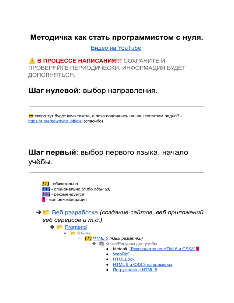 Методичка как стать программистом с нуля. Видео на YouTube. ⚠️ В ПРОЦЕССЕ НАПИСАНИЯ!!! СОХРАНИТЕ И ПРОВЕРЯЙТЕ ПЕРИОДИЧЕСКИ. ИНФОРМАЦИЯ БУДЕТ ДОПОЛНЯТЬСЯ. Шаг нулевой: выбор направления. 😎 скоро тут будет куча текста, а пока подпишись на наш телеграм ладно? https://t.me/howdyho_official (спасибо) Шаг первый: выбор первого языка, начало учёбы. [ ! ] - обязательно [ + ] - опционально (либо один из) [ ~ ] - рекомендуется ^ - моя рекомендация ➔ 📂 Веб разработка (создание сайтов, веб приложений, веб сервисов и т.д.) ◆ 📂 Frontend 📂 ● Языки ○ [ ! ] HTML 5 (язык разметки) ◆ Книги/Ресурсы для учебы ● Metanit. “Руководство по HTML5 и CSS3” ^ ● WebRef ● HTMLBook ● HTML 5 и CSS 3 на примерах ● Погружение в HTML 5 📚 ◆ 📂 ● W3Schools ● MDN ^ Полезно ● Проект Awesome HTML5 ● CodePen ^ онлайн редактор и каталог сниппетов (пенов) ● Как выучить HTML/CSS? ● Учим HTML за 1 час! ● Сервис JSFiddle ▶️ ▶️ ○ 📚 [ ! ] CSS 3 (каскадные таблицы стилей) ◆ Книги/Ресурсы для учебы ● Metanit. “Руководство по HTML5 и CSS3” ^ ● WebRef ● HTML 5 и CSS 3 на примерах ● W3Schools ● MDN ^ ● CSS Tricks ^ ● Полезный блог/журнал Smashing Magazine ^ ◆ Препроцессоры ● [ ! ] Sass/Scss ^ ● [ + ] PostCSS ◆ Сборщики ● [ + ] Vite ^ ● [ + ] Webpack ● [ + ] Rollup ◆ Полезно ● Проект Awesome CSS ● CodePen ^ онлайн редактор и каталог сниппетов (пенов) ● Как выучить HTML/CSS? ● Учим CSS за 1 час! (чуть устаревший урок, но всё же) ● Сервис JSFiddle 📂 📂 📂 ▶️ ▶️ ○ 📚 [ ! ] JavaScript / [ ~ ] TypeScript ◆ Книги/Ресурсы для учебы ● Учебник на learn.javascript.ru (актуальная версия ECMAScript) ^ ● Metanit. “Руководство по JavaScript” ● Книга “Eloquent JavaScript” ● Учебник “Вы не знаете JS” ● Скринкаст по Node.JS ● Документация MDN ^ ◆ Фреймворки/Библиотеки ● [ + ] React ● [ + ] Vue.js 📂 ◆ 📂 ◆ 📂 ● [ + ] Angular ● [ + ] Svelte ^ ● [ + ] Solid JS ● [ + ] Qwik Сборщики/Таскеры/Линтеры ● [ + ] Vite ^ ● [ + ] Webpack ● [ + ] Rollup ● Prettier ● ESLint ^ Полезно ● Проект Awesome JavaScript ● Полезный блог/журнал Smashing Magazine ^ ● Как выучить JavaScript? ● JavaScript за 1 час (старый урок, но база та же) ● Распознавание рисунков на JavaScript ● HTML5 Canvas за 30 минут! ● Проект CodeWars ^ ● Проект LeetCode ^ ● Задачи Эйлера ● Сервис JSFiddle ▶️ ▶️ ▶️ ▶️ ● 📂 Программы (редакторы кода, IDE и тд.) ○ ○ ○ ○ ○ ○ ○ ● Visual Studio Code ^ Sublime Text ^ JetBrains WebStorm Atom / Pulsar (поддерживаемый форк атома) Vim / Neovim Nova (для MacOS) Lite XL 📂 Интересные штуки ○ 📂 Десктопные приложения ○ 📂 ○ 📂 ◆ Electron ◆ Tauri ^ ◆ Flutter Мобильные приложения ◆ React Native ◆ Flutter ◆ Ionic ◆ NativeScript SSGшки (статик сайт генераторы) ◆ Jekyll ^ ◆ Astro ◆ Remix ◆ Eleventy ◆ Vuepress ◆ Hugo ◆ Nuxt.js ◆ Next.js ◆ 📂 Backend 📂 ● Языки ○ [ + ] Python ^ ◆ Книги/Ресурсы для учебы ● Книга “Укус Питона” ^ ● Опционально pythontutor.ru ^ ● Лутц или Доусон (если не чувствуешь что шаришь прям круто) ● Книга “Рамальо Лучано - Python К вершинам мастерства” ^ ● Книга “Гарри Персиваль - Python разработка на основе тестирования” ● Книга “Грокаем алгоритмы” (тут примеры прямо на Python) ^ ● Книга “Совершенный код” ^ ● Metanit. “Руководство по языку Python” ● Metanit. “Руководство по веб-фреймворку Django” ◆ Фреймворки/Библиотеки ● Django ^ (самый популярный веб-фреймворк для Python) ○ Оф. документация и туториал по Django ○ Урок Django за 1 час! ○ Руководство по Django от Django Girls ● Flask ● Numpy ^ ● Requests ^ ● BeautifulSoup ^ ● Pygame ● Selenium ^ ● Scrapy ^ ● Matplotlib ● PrettyTable ● Faker ● tqdm ● plotly ^ ● OpenCV ● pytesseract ● PyQT ^ ● humanize ● ujson ^ ● Pillow 📚 📂 ▶️ ● ● ◆ ○ 📂 ▶️ ▶️ ▶️ 📚 [ + ] JavaScript (Node.js) ^ ◆ Книги/Ресурсы для учебы ● Учебник на learn.javascript.ru (актуальная версия ECMAScript) ^ ● Metanit. “Руководство по Node.js” ● Книга “Eloquent JavaScript” ● Учебник “Вы не знаете JS” ● Скринкаст по Node.JS ● Документация MDN ^ ● Книга “Грокаем алгоритмы” ^ ● Книга “Совершен