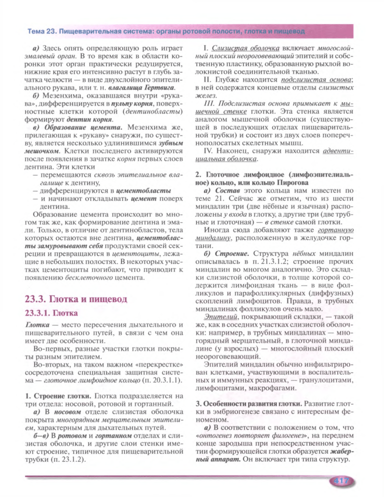 Тема 23. Пищеварительная система: органы ротовой полости, глотка и пищевод а) Здесь опять определяющую роль играет эмалевый орган. В то время как в области ко­ ронки этот орган практически редуцируется, нижние края его интенсивно растут в глубь за­ чатка челюсти — в виде двухслойного эпители­ ального рукава, или т. н. влагалища Гертвига. б) Мезенхима, оказавшаяся внутри «рука­ ва», дифференцируется в пульпу корня, поверх­ ностные клетки которой (дентинобласты) формируют дентин корня. в) Образование цемента. Мезенхима же, прилегающая к «рукаву» снаружи, по сущест­ ву, является несколько удлинившимся зубным мешочком. Клетки последнего активируются после появления в зачатке корня первых слоев дентина. Эти клетки — перемещаются сквозь эпителиальное вла­ галище к дентину, —дифференцируются в цементобласты — и начинают откладывать цемент поверх дентина. Образование цемента происходит во мно­ гом так же, как формирование дентина и эм а­ ли. Только, в отличие от дентинобластов, тела которых остаются вне дентина, цементоблас­ ты замуровывают себя продуктами своей сек­ реции и превращаются в цементоциты, лежа­ щие в небольших полостях. В некоторых учас­ тках цементоциты погибают, что приводит к появлению бесклеточного цемента. 23.3. Глотка и пищевод 23.3.1. Глотка Глотка — место пересечения дыхательного и пищеварительного путей, в связи с чем она имеет две особенности. Во-первых, разные участки глотки покры­ ты разным эпителием. Во-вторых, на таком важном «перекрестке» сосредоточена специальная защитная систе­ ма — глоточное лимфоидное кольцо (п. 20.3.1.1). 1. Строение глотки. Глотка подразделяется на три отдела: носовой, ротовой и гортанный. а) В носовом отделе слизистая оболочка покрыта многорядным мерцательным эпители­ ем, характерным для дыхательных путей. б—в) В ротовом и гортанном отделах и сли­ зистая оболочка, и другие слои стенки име­ ют строение, типичное для пищеварительной трубки (п. 23.1.2). I. Слизистая оболочка включает многослой­ ный плоский неороговевающий эпителий и собс­ твенную пластинку, образованную рыхлой во­ локнистой соединительной тканью. II. Глубже находится подслизистая основа: в ней содержатся концевые отделы слизистых желез. III. Подслизистая основа примыкает к мы­ шечной стенке глотки. Эта стенка является аналогом мышечной оболочки (существую­ щей в последующих отделах пищеваритель­ ной трубки) и состоит из двух слоев попереч­ нополосатых скелетных мышц. IV. Наконец, снаружи находится адвентиииальная оболочка. 2. Глоточное лимфоидное (лимфоэпителиаль­ ное) кольцо, или кольцо Пирогова а) Состав этого кольца нам известен по теме 21. Сейчас же отметим, что из шести миндалин три (две нёбные и язычная) распо­ ложены у входа в глотку, а другие три (две труб­ ные и глоточная) — в стенке самой глотки. Иногда сюда добавляют также гортанную миндалину, расположенную в желудочке гор­ тани. б) Строение. Структура нёбных миндалин описывалась в п. 21.3.1.2; строение прочих миндалин во многом аналогично. Это склад­ ки слизистой оболочки, в толще которой со­ держится лимфоидная ткань — в виде фол­ ликулов и парафолликулярных (диффузных) скоплений лимфоцитов. Правда, в трубных миндалинах фолликулов очень мало. Эпителий, покрывающий складки, — такой же, как в соседних участках слизистой оболоч­ ки: например, в трубных миндалинах — мно­ гор