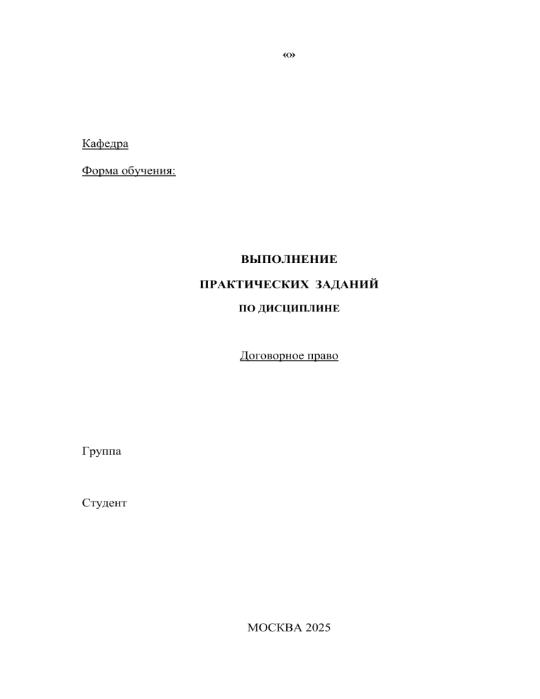 «» Кафедра Форма обучения: ВЫПОЛНЕНИЕ ПРАКТИЧЕСКИХ ЗАДАНИЙ ПО ДИСЦИПЛИНЕ Договорное право Группа Студент МОСКВА 2025 Задание 1: Гражданин в магазине розничной торговли решил приобрести пальто. Гражданин пальто в торговом зале выбрал и намеревался произвести оплату на кассе. Однако работник магазина отказался продавать гражданину выбранное последним пальто, ссылаясь на тот факт, что гражданину оно «не подходит» и «было предназначено для другого покупателя, который мерял пальто ранее». Вопросы: Прав ли продавец? Ответ: Продавец не прав, т.к. в соответствии со ст.426 ГК РФ лицо, осуществляющее предпринимательскую деятельность, то есть магазин розничной торговли, не вправе оказывать предпочтение одному лицу перед другим лицом в отношении заключения публичного договора. Отказ лица, осуществляющего предпринимательскую или иную приносящую доход деятельность, от заключения публичного договора при наличии возможности предоставить потребителю соответствующие товары, не допускается. Задание 2: Алексей, которому исполнилось 11 лет, продал принадлежащий ему фотоаппарат, своему другу Матвею. А на вырученные деньги купил куртку. Отец Алексея, узнав об этом, пошел к Матвею с намерением вернуть деньги и забрать фотоаппарат. Но Матвей отказался. Вопросы: Имеет ли право отец Алексея потребовать расторгнуть сделку? Ответ: Ч.1 ст. 21 Гражданского кодекса РФ следует, что способность гражданина своими действиями приобретать и осуществлять гражданские права, создавать для себя гражданские обязанности и исполнять их (гражданская дееспособность) возникает в полном объеме с наступлением совершеннолетия, то есть по достижении восемнадцатилетнего возраста. В соответствии со ст.28 ГК РФ, за несовершеннолетних, не достигших четырнадцати лет (малолетних), сделки, за исключением указанных в пункте 2 настоящей статьи, могут совершать от их имени только их родители, усыновители или опекуны. К сделкам законных представителей несовершеннолетнего с его Имуществом применяются правила, предусмотренные пунктами 2 и 3 статьи 37 настоящего Кодекса. Малолетние в возрасте от шести до четырнадцати лет вправе самостоятельно совершать:1) мелкие бытовые сделки;2) сделки, направленные на безвозмездное получение выгоды, не требующие нотариального удостоверения либо государственной регистрации;3) сделки по распоряжению средствами, предоставленными законным представителем или с согласия последнего третьим лицом для определенной цели или для свободного распоряжения. Имущественную ответственность по сделкам малолетнего, в том числе по сделкам, совершенным им самостоятельно, несут его родители, усыновители или опекуны, если не докажут, что обязательство было нарушено не по их вине. Эти лица в соответствии с законом также отвечают за вред, причиненный малолетними. Ничтожна сделка, совершенная несовершеннолетним, не достигшим четырнадцати лет (малолетним). К такой сделке применяются правила, предусмотренные абзацами вторым и третьим пункта 1 статьи 171 ГК РФ. Задание 4: Гражданин Н. лично обратился в банк с просьбой выдать ему кредит в размере 100.000 (сто тысяч) рублей. В процессе подготовки и подписания договора гражданин Н отказался от предоставления ему кредита, договор не подписал и покинул помещение банка. Однако через несколько дней указанная сумма была перечислена 
