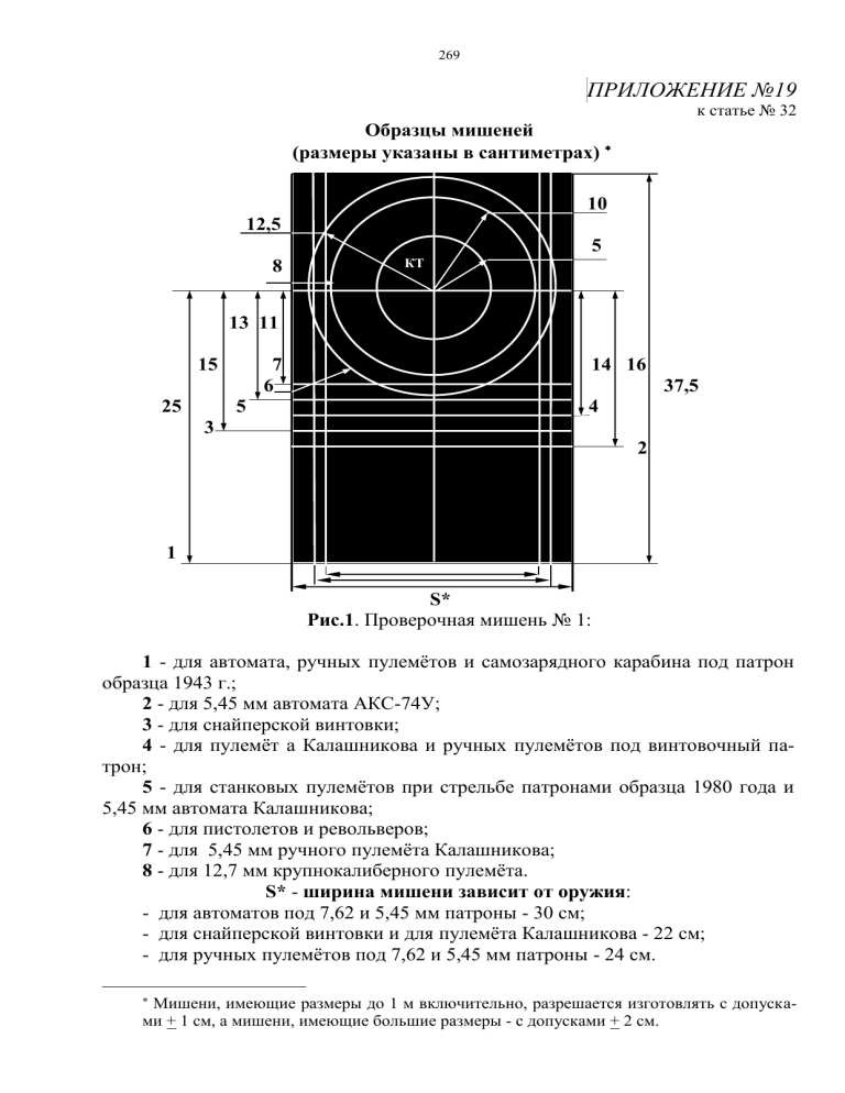 269 ПРИЛОЖЕНИЕ №19 к статье № 32 Образцы мишеней (размеры указаны в сантиметрах) 10 12,5 5 8 КТ 13 11 15 25 7 6 5 14 16 37,5 4 3 2 1 S* Рис.1. Проверочная мишень № 1: 1 - для автомата, ручных пулемётов и самозарядного карабина под патрон образца 1943 г.; 2 - для 5,45 мм автомата АКС-74У; 3 - для снайперской винтовки; 4 - для пулемёт а Калашникова и ручных пулемётов под винтовочный патрон; 5 - для станковых пулемётов при стрельбе патронами образца 1980 года и 5,45 мм автомата Калашникова; 6 - для пистолетов и револьверов; 7 - для 5,45 мм ручного пулемёта Калашникова; 8 - для 12,7 мм крупнокалиберного пулемёта. S* - ширина мишени зависит от оружия: - для автоматов под 7,62 и 5,45 мм патроны - 30 см; - для снайперской винтовки и для пулемёта Калашникова - 22 см; - для ручных пулемётов под 7,62 и 5,45 мм патроны - 24 см. Мишени, имеющие размеры до 1 м включительно, разрешается изготовлять с допуска- ми + 1 см, а мишени, имеющие большие размеры - с допусками + 2 см. 270 1 2 3 4 5 6 7 8 9 1 2 3 4 5 6 7 8 9 10 8 9 7 6 5 4 3 9 8 7 6 5 4 3 2 1 25 50 Рис. 2. Спортивная мишень № 2. 1 2 3 4 5 6 7 8 9 1 2 3 4 5 6 7 8 9 9 8 7 6 5 4 3 9 8 7 6 5 4 3 2 1 14 20 Рис. 3. Спортивная мишень № 3. 2 1 2 1 271 23 18 5 d =10 50 32 25 50 Рис. 4. Грудная фигура с кругами (мишень № 4) 13,5 23 18 30 50 Рис. 5. Головная фигура (мишень № 5) 272 23 Рис. 6. Головная фигура (мишень № 5а) 18 12 14 23 6 10 17 18 8 30 22 6 Рис. 7. Головная фигура* (мишень № 5б) 8 50 23 18 13,5 50 50 Рис. 8. Грудная фигура 273 (мишень № 6) 23 55 20 30 50 10 15 150 Рис.9 Грудная фигура* (мишень № 6 а) 11,5 10 <90° Рис. 10 Грудная фигура* (мишень № 6 б, трехмерная) 23 23 17 25 18 25 25 20 100 5 100 75 55 50 40 50 274 Рис. 11 Поясная фигура* (мишень № 7) Рис. 12 Поясная фигура* (мишень № 7а) Рис. 13. Поясная фигура* (мишень № 7б, трехмерная) 23 17 23 18 18 25 20 25 5 75 150 150 105 50 50 25 20 50 50 275 Рис. 14. Ростовая фигура (мишень № 8) Рис. 15. Ростовая фигура* (мишень № 8а) 61 14 24 14 8 10 30 37 12 1 85 30 85 Рис. 16. Ростовая фигура* (мишень № 8б, трехмерная) Рис. 17. Ручной противотанковый* гранатомёт (мишень № 9) 38 61 14 24 8 10 18 14 18 55 61 85 61 65 14 276 Рис. 18. Противотанковый гранатомёт* в окопе (мишень № 9а) 10 28 25 23 15 70 Рис. 19. Переносной ПТРК* на огневой позиции (мишень № 9б) 14 20 38 10 Рис. 20. Расчет ПТУР в окопе* (мишень № 9в) 100 10 27 28 20 Рис. 21. Ручной пулемёт* (мишень № 10) 10 18 12 55 35 37 23 75 25 80 100 25 Рис. 23. Противотанковое (безоткатное) орудие, 110 наземная установка (ПТУР) (мишень № 11) 277 25 Рис. 24. Противотанковое (безоткатное) орудие (наземная установка ПТУР в окопе) (мишень № 11а) 100 25 80 50 150 31 280 31 100 Рис. 25. Танк (мишень №12) 237 137 342 153 460 153 100 70 137 67 150 466 766 150 278 Рис. 26. Танк (мишень № 12а) 280 Рис. 27. Танк в окопе (мишень № 12б) 100 140 230 233 171 Рис. 28. Танк (мишень №12в, трехмерная) 279 250 Рис. 29. Бронетранспортёр (мишень № 13) 180 50 150 50 130 210 130 60 60 60 180 60 100 270 100 470 Рис. 30. Бронетранспортёр (мишень № 13 а) 18 50 23 80 125 105 50 62 250 Рис. 31. Бронетранспортёр в окопе (мишень № 13б) 135 Рис. 32. Бронетранспортёр (мишень № 13в, трехмерная) 280 68 30 100 30 68 30 220 190 30 50 196 296 50 Рис. 33. Боевая машина пехоты (бронеавтомобиль) (мишень № 14) 231 20 110 30 231 30 30 70 120 50 220 70 70 116 390 622 Рис. 34. Боевая машина пехоты* (бронеавтомобиль) (мишень № 14а) 116 281 68 30 100 30 68 30 Рис. 35. Боевая машина пехоты (бронеавтомобиль) в окопе (мишень № 14б) 80 296 50 60 98 205 Рис. 36. Боевая машина пехоты (бронеавтомобиль)* (мишень № 14в, трехмерная) 200 90 30 100 70 40 40 20 250 Рис. 37. Бронеавтомобиль* (мишень № 14г) 20 282 67,5 35 90 20 170 Рис. 38. Бронеколпак (мишень №15) 10 30 50 25 50 70 120 Рис. 39. Амбразура в сооружении (мишень № 16) 80 30 Рис. 40. Безоткатное орудие (ПТРК) на автомобиле (мишень № 17) 120 150 25 140 180 20 283 75 15 15 150 120 Рис. 41. Безоткатное орудие (ПТРК) на автомобиле* (мишень №17а) 250 80 30 110 50 180 Рис. 42. Безоткатное орудие (ПТУР) на автомобил