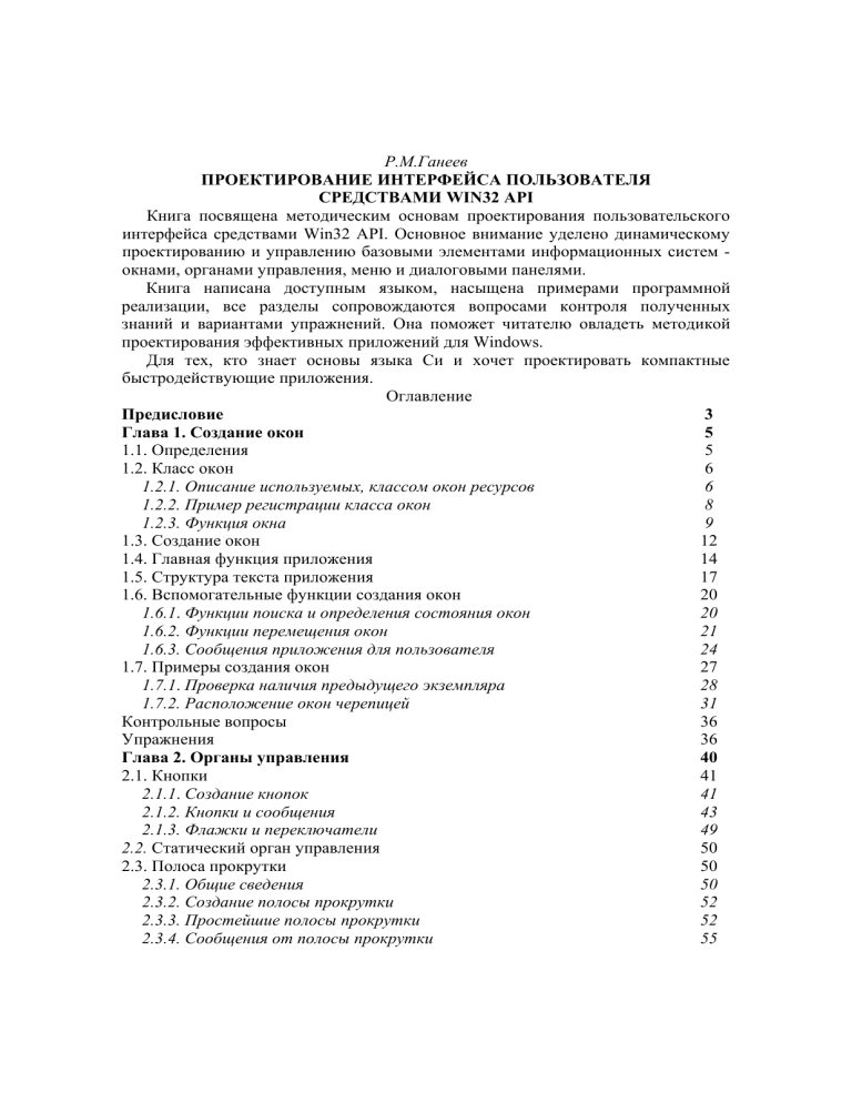 Р.М.Ганеев ПРОЕКТИРОВАНИЕ ИНТЕРФЕЙСА ПОЛЬЗОВАТЕЛЯ СРЕДСТВАМИ WIN32 API Книга посвящена методическим основам проектирования пользовательского интерфейса средствами Win32 API. Основное внимание уделено динамическому проектированию и управлению базовыми элементами информационных систем окнами, органами управления, меню и диалоговыми панелями. Книга написана доступным языком, насыщена примерами программной реализации, все разделы сопровождаются вопросами контроля полученных знаний и вариантами упражнений. Она поможет читателю овладеть методикой проектирования эффективных приложений для Windows. Для тех, кто знает основы языка Си и хочет проектировать компактные быстродействующие приложения. Оглавление Предисловие 3 Глава 1. Создание окон 5 1.1. Определения 5 1.2. Класс окон 6 1.2.1. Описание используемых, классом окон ресурсов 6 1.2.2. Пример регистрации класса окон 8 1.2.3. Функция окна 9 1.3. Создание окон 12 1.4. Главная функция приложения 14 1.5. Структура текста приложения 17 1.6. Вспомогательные функции создания окон 20 1.6.1. Функции поиска и определения состояния окон 20 1.6.2. Функции перемещения окон 21 1.6.3. Сообщения приложения для пользователя 24 1.7. Примеры создания окон 27 1.7.1. Проверка наличия предыдущего экземпляра 28 1.7.2. Расположение окон черепицей 31 Контрольные вопросы 36 Упражнения 36 Глава 2. Органы управления 40 2.1. Кнопки 41 2.1.1. Создание кнопок 41 2.1.2. Кнопки и сообщения 43 2.1.3. Флажки и переключатели 49 2.2. Статический орган управления 50 2.3. Полоса прокрутки 50 2.3.1. Общие сведения 50 2.3.2. Создание полосы прокрутки 52 2.3.3. Простейшие полосы прокрутки 52 2.3.4. Сообщения от полосы прокрутки 55 2.3.5. Управление полосой прокрутки 2.3.6. Пример обработки сообщений от полос прокрутки 2.3.7. Новые функции управления полосами прокрутки 2.3.8. Пример окна приложения с полосой просмотра 2.4. Редактор текста 2.4.1. Создание редактора 2.4.2. Сообщения для редактора текста 2.4.3. Сообщения от редактора текста 2.4.4. Пример работы с однострочным редактором 2.5. Списки строк 2.5.1. Создание списка 2.5.2. Сообщения от списка 2.5.3. Сообщения для списка 2.5.4. Пример работы со списком 2.6. Комбинированный список 2.6.1. Создание комбинированного списка 2.6.2. Коды извещения 2.6.3. Сообщения для комбинированного списка 2.6.4. Пример работы с комбинированным списком Контрольные вопросы Упражнения Глава 3. Вывод в окно 3.1. Сообщение WM_PAINT 3.2. Виды контекста отображения 3.3. Установка атрибутов контекста отображения 3.4. Вывод текста 3.4.1. Настройка параметров шрифта 3.4.2. Выбор шрифта в контекст отображения 3.4.3. Функции вывода текста 3.4.4. Пример вывода текста в окно 3.4.5. Определение метрик шрифта 3.5. Рисование геометрических фигур 3.5.1. Функции рисования точки 3.5.2. Функции рисования линий 3.5.3. Функции рисования замкнутых фигур Контрольные вопросы Упражнения Глава 4. Меню 4.1. Элементы меню 4.2. Создание меню 4.2.1. Вставка элементов вменю 4.2.2. Удаление элементов из меню 4.2.3. Управление состоянием элементов меню 4.2.4. Получение информации о меню 56 58 63 64 68 68 69 70 71 74 74 74 74 77 80 80 80 81 82 85 86 89 90 95 105 112 112 115 116 117 119 129 129 130 139 141 142 145 146 148 149 155 159 167 4.3. Сообщения от меню 4.3.1. Сообщение WM_INITMENU 4.3.2. Сообщение WM_INITMENUPOPUP 4.3.3. Сообщение WM_COMMAND 4.3.4. Сообщение WM_MENUSELECT 4.4. Плавающее меню 4.5. Акселераторы Контрольные вопросы Упражнения Глава 5. Панель инструментов и строка состояния 5.1. Панель инструментов 5.1.1. Создание панели инструментов 5.1.2. Управление состоянием кнопок панели 5.1.3. В