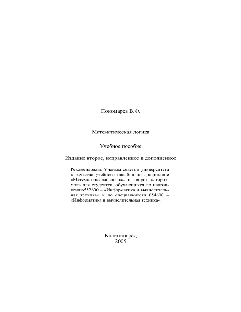 Пономарев В.Ф. Математическая логика Учебное пособие Издание второе, исправленное и дополненное Рекомендовано Ученым советом университета в качестве учебного пособия по дисциплине «Математическая логика и теория алгоритмов» для студентов, обучающихся по направлению552800 – «Информатика и вычислительная техника» и по специальности 654600 – «Информатика и вычислительная техника». Калининград 2005 ББК 60 УДК 53:630.11 Пономарев В.Ф. Математическая логика. Учебное пособие. – 2-е изд., испр. т доп. – Калиниград: изд-во КГТУ, 2005г., 201с. В разделе «Классическая логика» дано описание логики высказываний и предикатов. Исследованы возможности вывода дедуктивным методом и методом резолюции. Каждый пример сопровождается графом вывода. Для многих примеров составлены и отлажены программы на языке Prolog. В этом разделе приведены также основы реляционных алгебры и исчисления с переменными-кортежами. Приведены основы языка SQL и его инструкции для исполнения алгебраических и логических операций. В разделе «Неклассическая логика» изложены основы нечёткой и модальной логик. Показаны особенности исполнения нечётких алгебраических операций и нечёткого вывода в исчислении, приведены примеры экспертных систем. Рассмотрены возможности применения модальных операторов для формального описания того, что «должно быть», и того, что «может быть». Кратко дано описание темпоральной и алгоритмической логик, которые нашли широкое применение в информационных технологиях. 4 3 Оглавление Предисловие --------------------------------------------------------6 Глава1. Логика классическая ---------------------------------9 1.1. Логика высказываний ------------------------------------ 10 1.1.1. Алгебра высказываний------------------------------ 12 1.1.1.1. Логические операции--------------------------- 13 1.1.1.2. Правила записи сложных формул ----------- 19 1.1.1.3. Законы алгебры высказываний --------------- 28 1.1.1.4. Эквивалентные преобразования формул --- 31 1.1.1.5. Нормальные формы формул ------------------ 37 1.1.2. Исчисление высказываний ------------------------- 42 1.1.2.1. Интерпретация формул ------------------------ 43 1.1.2.2. Аксиомы исчисления высказываний ------- 45 1.1.2.3. Метод дедуктивного вывода ------------------ 49 1.1.2.4. Метод резолюции ------------------------------- 59 Вопросы и задачи ---------------------------------------------- 67 Расчетно-графическая работа ----------------------------- 70 1. 2. Логика предикатов -------------------------------------- 72 1.2.1. Алгебра предикатов --------------------------------- 79 1.2.1.1. Логические операции--------------------------- 80 1.2.1.2. Правила записи сложных формул ----------- 84 1.2.1.3. Законы алгебры предикатов------------------- 85 1.2.1.4. Эквивалентные преобразования формул --- 89 1.2.1.2. Предварённая нормальная форма------------ 91 1.2.1.3. Сколемовская стандартная форма ----------- 96 4 Математическая логика 1.2.2. Исчисление предикатов----------------------------- 99 1.2.2.1. Интерпретация формул ------------------------ 99 1.2.2.2. Аксиомы исчисления предикатов-----------102 1.2.2.3. Правила унификации предикатов-----------104 1.2.2.4. Метод дедуктивного вывода -----------------105 1.2.2.5. Метод резолюции ------------------------------111 1.2.3. Логическое программирование ------------------118 1.2.3.1. Основы логического программирования --118 1.2.3.2. Подготовка среды Visual Prolog для работы ---------------------------------------------------------------127 1.2.3.3. Описание логических задач на языке Prolog ---------------------------------------------------------------129 Вопросы и задачи ---------------------------------------------160 Расчетно-графическая работа ----------------------------110 1.3. Логика реляционная -------------------------------------112 1.3.1. Реляционная алгебра -------------------------------116 1.3.1.1. Унарные операции ---------------------------