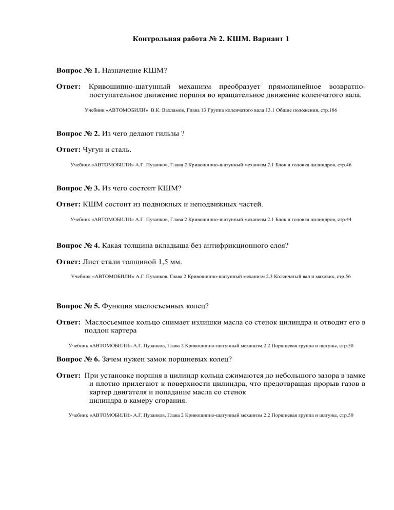 Контрольная работа № 2. КШМ. Вариант 1 Вопрос № 1. Назначение КШМ? Ответ: Кривошипно-шатунный механизм преобразует прямолинейное возвратнопоступательное движение поршня во вращательное движение коленчатого вала. Учебник «АВТОМОБИЛИ» В.К. Вахламов, Глава 13 Группа коленчатого вала 13.1 Общие положения, стр.186 Вопрос № 2. Из чего делают гильзы ? Ответ: Чугун и сталь. Учебник «АВТОМОБИЛИ» А.Г. Пузанков, Глава 2 Кривошипно-шатунный механизм 2.1 Блок и головка цилиндров, стр.46 Вопрос № 3. Из чего состоит КШМ? Ответ: КШМ состоит из подвижных и неподвижных частей. Учебник «АВТОМОБИЛИ» А.Г. Пузанков, Глава 2 Кривошипно-шатунный механизм 2.1 Блок и головка цилиндров, стр.44 Вопрос № 4. Какая толщина вкладыша без антифрикционного слоя? Ответ: Лист стали толщиной 1,5 мм. Учебник «АВТОМОБИЛИ» А.Г. Пузанков, Глава 2 Кривошипно-шатунный механизм 2.3 Коленчатый вал и маховик, стр.56 Вопрос № 5. Функция маслосъемных колец? Ответ: Маслосьемное кольцо снимает излишки масла со стенок цилиндра и отводит его в поддон картера Учебник «АВТОМОБИЛИ» А.Г. Пузанков, Глава 2 Кривошипно-шатунный механизм 2.2 Поршневая группа и шатуны, стр.50 Вопрос № 6. Зачем нужен замок поршневых колец? Ответ: При установке поршня в цилиндр кольца сжимаются до небольшого зазора в замке и плотно прилегают к поверхности цилиндра, что предотвращая прорыв газов в картер двигателя и попадание масла со стенок цилиндра в камеру сгорания. Учебник «АВТОМОБИЛИ» А.Г. Пузанков, Глава 2 Кривошипно-шатунный механизм 2.2 Поршневая группа и шатуны, стр.50 Вопрос № 7. Из какого материала изготавливают поршневые кольца? Ответ: Поршневые кольца изготавливают из легированного чугуна, для двигателей с большими динамическими нагрузками — из специальной стали. Учебник «АВТОМОБИЛИ» А.Г. Пузанков, Глава 2 Кривошипно-шатунный механизм 2.2 Поршневая группа и шатуны, стр.50 Вопрос № 8. Чем и для чего покрывают компрессионные кольца? Ответ: Поверхность верхнего компрессионного кольца для повышения износостойкости подвергают пористому хромированию. Учебник «АВТОМОБИЛИ» А.Г. Пузанков, Глава 2 Кривошипно-шатунный механизм 2.2 Поршневая группа и шатуны, стр.50 Вопрос № 9. На какие группы подразделяются пальцы по способу соединения с шатуном и поршнем? Ответ: По способу соединения с шатуном и поршнем пальцы подразделяются на плавающие и закрепленные (обычно в головке шатуна). Учебник «АВТОМОБИЛИ» А.Г. Пузанков, Глава 2 Кривошипно-шатунный механизм 2.2 Поршневая группа и шатуны, стр.52 Вопрос № 10. Какие пальцы получили наибольшее распространение? Ответ: Наибольшее распространение получили плавающие поршневые пальцы, которые свободно поворачиваются в бобышках и втулке, установленной в верхней головке шатуна. Учебник «АВТОМОБИЛИ» А.Г. Пузанков, Глава 2 Кривошипно-шатунный механизм 2.2 Поршневая группа и шатуны, стр.53 Вопрос № 11. Чем ограничивается осевое перемещение пальца? Ответ: Осевое перемещение поршневого пальца ограничивается стопорными кольцами, расположенными в выточках бобышек поршня. Учебник «АВТОМОБИЛИ» А.Г. Пузанков, Глава 2 Кривошипно-шатунный механизм 2.2 Поршневая группа и шатуны, стр.53 Вопрос № 12. Почему иногда стучит палец в бобышках поршня? Ответ: При работающем двигателе в бобышках поршня возможны стуки пальцев из-за различных значений коэффициента линейного расширения алюминиевого сплава и стали. Учебник «АВТОМОБИ