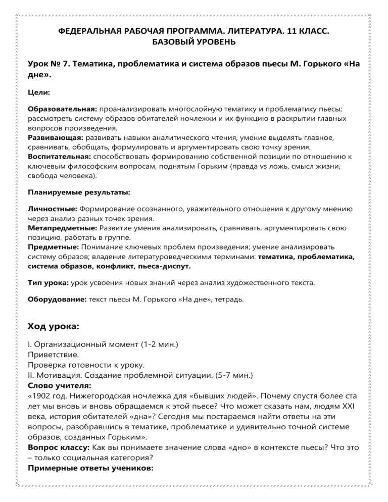 ФЕДЕРАЛЬНАЯ РАБОЧАЯ ПРОГРАММА. ЛИТЕРАТУРА. 11 КЛАСС. БАЗОВЫЙ УРОВЕНЬ Урок № 7. Тематика, проблематика и система образов пьесы М. Горького «На дне». Цели: Образовательная: проанализировать многослойную тематику и проблематику пьесы; рассмотреть систему образов обитателей ночлежки и их функцию в раскрытии главных вопросов произведения. Развивающая: развивать навыки аналитического чтения, умение выделять главное, сравнивать, обобщать, формулировать и аргументировать свою точку зрения. Воспитательная: способствовать формированию собственной позиции по отношению к ключевым философским вопросам, поднятым Горьким (правда vs ложь, смысл жизни, свобода человека). Планируемые результаты: Личностные: Формирование осознанного, уважительного отношения к другому мнению через анализ разных точек зрения. Метапредметные: Развитие умения анализировать, сравнивать, аргументировать свою позицию, работать в группе. Предметные: Понимание ключевых проблем произведения; умение анализировать систему образов; владение литературоведческими терминами: тематика, проблематика, система образов, конфликт, пьеса-диспут. Тип урока: урок усвоения новых знаний через анализ художественного текста. Оборудование: текст пьесы М. Горького «На дне», тетрадь. Ход урока: I. Организационный момент (1-2 мин.) Приветствие. Проверка готовности к уроку. II. Мотивация. Создание проблемной ситуации. (5-7 мин.) Слово учителя: «1902 год. Нижегородская ночлежка для «бывших людей». Почему спустя более ста лет мы вновь и вновь обращаемся к этой пьесе? Что может сказать нам, людям XXI века, история обитателей «дна»? Сегодня мы постараемся найти ответы на эти вопросы, разобравшись в тематике, проблематике и удивительно точной системе образов, созданных Горьким». Вопрос классу: Как вы понимаете значение слова «дно» в контексте пьесы? Что это – только социальная категория? Примерные ответы учеников: Ученик 1: «Я думаю, «дно» – это в первую очередь бедность, нищета. Эти люди живут в ужасных условиях, у них нет денег, работы». Ученик 2: «Я согласен, но это не только социальное дно. Это еще и дно моральное, духовное. Они многие потеряли себя, утратили надежду и веру в будущее. Например, Бубнов уже ни к чему не стремится». Ученик 3: «Для меня «дно» – это состояние души. Человек может быть беден, но не быть «на дне», если у него есть внутренний стержень. А герои пьесы в основном сломаны и опустошены». Вывод учителя: Верно. «Дно» у Горького – понятие комплексное: это и социальный статус, и состояние души, и экзистенциальная категория. Это отправная точка для нашего анализа. III. Работа по теме урока. 1. Тематика пьесы (запись в тетрадь). (10-12 мин.) Задание: На основе текста пьесы назовите основные темы, которые поднимает Горький. Аргументируйте свои ответы цитатами или отсылками к конкретным сценам. Предполагаемые ответы учеников (учитель обобщает и записывает на доске): Ученик 1: «Я вижу тему социального неравенства. Это показано через конфликт хозяев ночлежки (Костылевых) и ее обитателей. Костылев жестокий и жадный, он наживается на несчастье других». Ученик 2: «Еще тема прошлого. У каждого героя есть своя история падения. Сатин был телеграфистом, Барон – аристократом, Актер – служителем искусства. Эти воспоминания мучают их». Ученик 3: «Тема правды и лжи – это главная тема! Она возникает в спорах Луки и Сатина