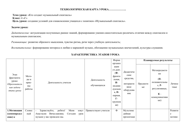 ТЕХНОЛОГИЧЕСКАЯ КАРТА УРОКА……………….. Тема урока: «Кто создает музыкальный спектакль» Класс: 4 «Г» Цель урока: создание условий для ознакомления учащихся с понятием «Музыкальный спектакль». Задачи урока: Дидактические: актуализация полученных раннее знаний, формирование умения самостоятельно различать отличия между спектаклем и музыкальным спектаклем; Развивающие: развитие образного мышления, чувство ритма, речи через учебную деятельность; Воспитательные: формирование интереса и любви к маршевой музыке, обогащение музыкальных впечатлений, культуры слушания. ХАРАКТЕРИСТИКА ЭТАПОВ УРОКА Этап фрагмента урока: Образователь ная задача этапа урока 1.Мотивации (самоопредел ение) к Методы и приемы работы Словес ный Деятельность Деятельность учителя обучающихся - Здравствуйте, ребята! Меня зовут Приветствуют учителя Анастасия Вячеславовна. Сегодня урок музыки у вас проведем мы. Форма организ ации уч.деят. (Ффронта льная, Ииндиви дуальна я, Ппарная, Ггруппов ая) Ф Планируемые результаты Метапредметн ые Дидактиче ские средства, интеракти вное оборудова ние Мультиме дийная презентаци Предметн ые (Ппознавательны е, Ррегулятивные, Личнос тные Ккоммуникативн ые) Развити е мотиво учебной деятельности Цель: выработка на личностнозначимом уровне внутренней готовности выполнения нормативных требований учебной деятельности (1 – 2 мин) 2.Актуализа ция и фиксированиеинди видуальногозатруд не-ния Цель: подготовка мышления учащихся и организма для осознания ими внутренней потребности в построении учебных Нагляд ный - Перед началом урока предлагаю вам прослушать фрагменты из двух музыкальных произведений. Выберите музыкальный фрагмент, который соответствует вашему настроению в начале урока. Номер выбранного фрагмента покажите с помощью пальцев. Выполняют задание: слушают фрагменты из двух музыкальных произведений и выбирают тот, который соответствует (звучит тревожная музыка и спокойная, их настроению в восторженная; учащиеся выбирают начале урока музыкальный фрагмент, который соответствует их настроению и показывают его номер с помощью пальцев рук) Словес ный Приступим к работе! Нагляд ный - Ребята, мы с вами уже знаем, что такое Отвечают на вопросы спектакль, кто может сказать, что такое учителя. спектакль? Словес ный я Спектакль - это театральная постановка определенного произведения. - Ребята, скажите, как происходит спектакль? - Верно, происходит по произведению и по нему составляется спектакль, в котором участники спектакля в театральной форме предоставляют это произведение. в учебно й деятель ности, оценива ть результ аты деятель ности. Слайд 1 Ф Мультиме дийная презентаци я Слайд 2 К: формирование умения планировать учебное сотрудничеств о с учителем и сверстниками в процессе музыкальной деятельности. действий (5 – 7 мин) 3.Выявление места и причины затруднений Цель: анализ возникшей ситуации и на ее основе выявление места и причины затруднений (2 мин) Словес ный - Сегодня я вновь приглашаю совершить Слушают путешествие в удивительный мир музыки, мир ярких и разнообразных звуков. - Что он нам откроет, я думаю, вы догадаетесь, если отгадаете следующие Отгадывают загадки загадки: 1.Сон и отдых позабыты, пишет песню ( композитор) 2. Лишь музыка начнет играть. Не могу я устоять. На щеках моих румянец, Когда исполняю (Танец) 3.Взмахнёт 