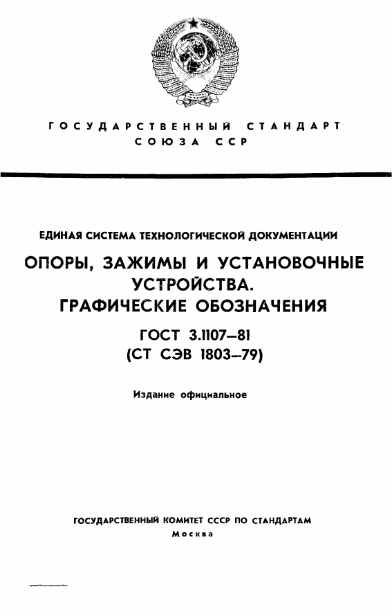 г о с у д а р с т в е н н ы й С О Ю З А с т а н д а р т ССР ЕДИНАЯ СИСТЕМА ТЕХНОЛОГИЧЕСКОЙ ДОКУМЕНТАЦИИ ОПОРЫ, ЗАЖИМЫ И УСТАНОВОЧНЫЕ УСТРОЙСТВА. ГРАФИЧЕСКИЕ ОБОЗНАЧЕНИЯ ГОСТ 3.1107-81 (СТ СЭВ 1803-79) Издание официальное ГОСУДАРСТВЕННЫЙ КОМИТЕТ СССР ПО СТАНДАРТАМ Москва о промышленной безопасности производственных объектов РАЗРАБОТАН Государственным комитетом СССР по стандартам ИСПОЛНИТЕЛИ 8, Ф. Курочкин, канд. техн. наук; Ю. Я. Венгеровский, Б. С. Мендриков: Н. П. Корченков; А. Ю. Воронова канд. техн. наук; ВНЕСЕН Государственным комитетом СССР по стандартам УТВЕРЖДЕН И ВВЕДЕН В ДЕЙСТВИЕ Постановлением Государст­ венного комитета СССР по стандартам от 31 декабря 1981 г, 5943. т Группа 153 УДК 658.5:621.7.07:006,334 Г О С У Д А Р С Т В Е Н Н Ы Й С Т А Н Д А Р Т м н м н н н н н вш н н п ан ш ш н вп н п Единая система технологической документации ОПОРЫ, ЗАЖИМЫ И УСТАНОВОЧНЫЕ УСТРОЙСТВА. ГРАФИЧЕСКИЕ ОБОЗНАЧЕНИЯ Unified system for technological documentation. Bases, damps and installing arrangements. Symbolic representation С О Ю З А ССР "Тост 3 .1107—31 (CT сзв 1803—79 ) Взамен ГОСТ 3.1107—73 Постановлением Государственного комитета СССР по стандарта л от 15&1 г. № 5943 срок введения установлен декабря с 01.07. 1982 г. 1. Настоящий стандарт устанавливает графические обозначе­ ния опор, зажимов и установочных устройств, применяемых в тех­ нологической документации. Стандарт полностью соответствует СТ СЭВ 1803—79. 2. Для изображения обозначения опор, зажимов и установоч­ ных устройств следует применять сплошную тонкую линию по ГОСТ 2.303—68. 3. Обозначения опор (условные) приведены в табл. 1. Таблица ! Обозначение опоры па видах Наименование опоры 1. Непод­ вижная сяереди, сзади сверху снизу ЬОь 'О М4 U Издание официальное I ? * .. " Й Г'Л С ' Перепечатка воспрещена ★ © Издательство стандартов, 1982 Стр. 2 ГОСТ 3.110Т—81 Продолжение табл. 1 Обозначение опоры па видах Наименование опоры спереди, сзади сверху снизу иг 2. П одви ж ­ н ая 06 О О 60° 3. П лав аю ­ щ ая i <>■ R3 60° 4. Р егули ру­ ем ая Тп ? 9 4. Допускается обозначение подвижной, плавающей и регули­ руемой опор на видах сверху и снизу изображать, как обозначе­ ние неподвижной опоры на аналогичных видах. 5. Обозначения зажимов приведены в табл. 2. 6. Обозначение двойного зажима на виде спереди или сзади при совпадении точек приложения силы, допускается изображать как обозначение одиночного зажима на аналогичных видах. 7. Обозначения установочных устройств приведены в табл. 3. 8. Установочно-зажимные устройства следует обозначать как сочетание обозначений установочных устройств и зажимов (спра­ вочное приложение 2). Пр и м е ч а н и е . Для цанговых оправок (патронов) следует применять обо­ значение ГОСТ 3.1107— 81 Стр. 3 Таблица 2 Обозначение зажима на видах Наименование зажима Спереди, сзади сверху 1. Одиноч­ ный снизу © 2. Двойной 0 i | U >1 |-gJ о — о П р и м е ч а н и е . Для двойных зажимов длина плеча устанавливается раз­ работчиком в зависимости от расстояния между точками приложения сил. Д о­ пускается упрощенное графическое обозначение двойного зажима: 9. Допускается обозначение опор и установочных устройств, кроме центров, наносить на выносных линиях, соответствующих поверхностей (справочные приложения 1 и 2). 10. Для указания формы рабочей поверхности опор, зажимов и установочных устройств следует применять обозначения в соот­ ветствии с табл. 4. 11. Обозначение форм рабочих поверхностей наносят слева от обозначения опоры, зажима или установ