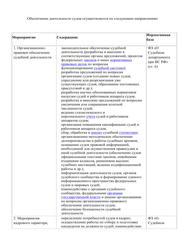 Обеспечение деятельности судов осуществляется по следующим направлениям Мероприятие Содержание 1. Организационноправовое обеспечение судебной деятельности 2. Мероприятия кадрового характера, законодательное обеспечение судебной деятельности (разработка и внесение в соответствующие органы предложений, проектов федеральных законов и иных нормативных правовых актов по вопросам функционирования судебной системы); разработка предложений по вопросам организации судов (создание новых судов, упразднение или реорганизация уже существующих судов, образование постоянных присутствий и др.); разработка научно обоснованных нормативов нагрузки судей и работников аппарата судов; разработка и внесение предложений по вопросам увеличения или сокращения штатной численности судей; ведение статистического и персонального учета судей и работников аппаратов судов; организация повышения квалификации судей и работников аппарата судов; сбор, обработка и анализ судебной статистики; организационно-методическое обеспечение делопроизводства и работы судебных архивов; оснащение судов правовой информацией, необходимой для осуществления правосудия и иной судебной деятельности (обеспечение судов официальными текстами законов, новейшими изданиями кодексов, решениями высших судебных инстанций, ведение кодификационной работы и др.); информатизация деятельности судов, органов судейского сообщества и формирование единого информационного пространства федеральных судов и мировых судей; взаимодействие с органами судейского сообщества, федеральными органами государственной власти и иными организациями по вопросам организационно-правового обеспечения деятельности судов; обеспечение безопасности судебной деятельности. определение потребностей судов в кадрах; осуществление работы по отбору и подготовке кандидатов на должности судей, взаимодействие Нормативная база ФЗ «О Судебном департаменте при ВС РФ» (ст. 6) ФЗ «О Судебном направленные на создание условий для полного и независимого осуществления правосудия 3. Финансовоэкономическое обеспечение судебной деятельности 4. Обеспечение судов материально- с образовательными учреждениями, осуществляющими подготовку и повышение квалификации судей и работников аппаратов судов; ведение статистического и персонального учета судей и работников аппаратов судов, органов и учреждений Судебного департамента; обеспечение судов различной информацией правового характера (законами, иными нормативными правовыми актами, судебными решениями, специальной литературой и т. п.); методическое и организационное обеспечение психологического сопровождения судебной деятельности, психодиагностического опроса кандидатов на должность судей; создание нормативной базы прохождения государственной гражданской службы в системе Судебного департамента и в судах общей юрисдикции; контроль за исполнением законов и нормативных актов о государственной гражданской службе; аттестация государственных гражданских служащих и присвоение им классных чинов. разработка и представление в Правительство РФ согласованных с Председателем Верховного Суда РФ и Советом судей РФ предложений о бюджетных ассигнованиях федеральных судов, мировых судей, Судебного департамента и органов судейского сообщества; обеспеч