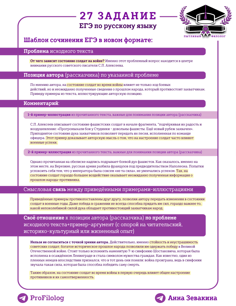 27 ЗАДАНИЕ ЕГЭ по русскому языку ПЫТЛИВЫЙ Шаблон сочинения ЕГЭ в новом формате: ФИЛОЛОГ Проблема исходного текста От чего зависит состояние солдат на войне? Именно этот проблемный вопрос находится в центре внимания русского советского писателя С.П. Алексеева. Позиция автора (рассказчика) по указанной проблеме По мнению автора, на состояние солдат во время войны влияет не только ход боевых действий, но и неожиданно полученные сведения о прошлом народа, который противостоит захватчикам. Приведу примеры из текста, иллюстрирующие авторскую позицию. Комментарий: 1-й пример-иллюстрация из прочитанного текста, важные для понимания позиции автора (рассказчика) С.П. Алексеев описывает состояние фашистских солдат в начале фрагмента, "подчёркивая их радость и воодушевление: «Прогромыхали бои у Студянки - довольны фашисты. Ещё новый рубеж захвачен». Приподнятое состояние духа захватчиков позволяет передать их песня, исполненная по команде офицера. Этот пример доказывает авторскую мысль о том, что на настроение солдат часто влияют военные успехи. 2-й пример-иллюстрация из прочитанного текста, важные для понимания позиции автора (рассказчика) Однако прочитанная на обелиске надпись подрывает боевой дух фашистов. Как оказалось, именно на этом месте, на Березине, русская армия разбила французов под предводительством Наполеона. Попытки успокоить себя тем, что у императора была совсем «не та сила», не увенчались успехом. Так, на состояние солдат гораздо большее воздействие оказывает неожиданно полученная информация о прошлом народа-противника. Смысловая связь между приведёнными примерами-иллюстрациями Приведённые примеры противопоставлены друг другу, позволяя автору передать изменения в состоянии солдат в военные годы. Даже победа в сражении не всегда способна придать им сил, гораздо важнее то, какой непоколебимой силой духа обладает противостоящий захватчикам народ. Своё отношение к позиции автора (рассказчика) по проблеме исходного текста+пример-аргумент (с опорой на читательский, историко-культурный или жизненный опыт) Нельзя не согласиться с точкой зрения автора. Действительно, именно стойкость и неустрашимость советских солдат, богатое историческое прошлое народа позволили им одержать победу в Великой Отечественной войне. Стоит только вспомнить наменитую 7-ю симфонию Шостаковича, которая была исполнена в осаждённом Ленинграде и стала символом мужества граждан. Как известно, один из пленных немцев впоследствии признался, что в тот день они поняли: война проиграна, ведь в симфонии звучала такая сила, которая была способна победить саму смерть. Таким образом, на состояние солдат во время войны в первую очередь влияет общее настроение противников и их самоотверженность. ProFilolog Анна Зевакина