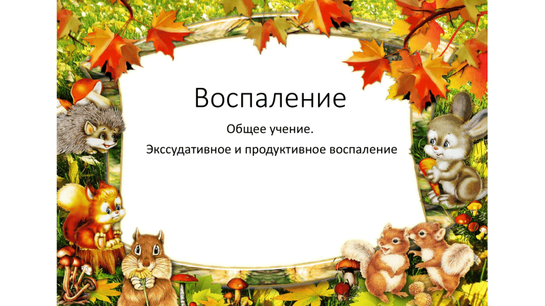 Воспаление Общее учение. Экссудативное и продуктивное воспаление Содержание Общее учение о воспалении Фазы воспаления: • Альтерация и медиаторы воспаления • Экссудация • Пролиферация Экссудативное воспаление Продуктивное воспаление Воспаление • Комплексная сосудисто-мезенхимальная реакция на повреждение вызванная действием различных агентов. • Цель реакции: ограничение участка повреждения, уничтожение агентов вызвавших воспаление и восстановление поврежденной ткани • Всегда имеет защитный характер, сопровождается общими проявлениями • Лежит в основе многих заболеваний Признаки воспаления Этиология • Экзогенные факторы: 1. Химические факторы 2. Физические факторы 3. Биологические факторы • Эндогенные факторы 1. Продукты азотистого обмена 2. Продукты распада опухолей 3. Антитела 4. Иммунные комплексы Альтерация и медиаторы воспаления Альтерация • Представлена дистрофией и некрозом • Инициальная фаза воспаления, ведущая к выбросу медиаторов • Медиаторы определяют все последующее развитие воспалительной реакции Классификация • Первичная альтерация Связана с действием повреждающего фактора • Вторичная альтерация Связана с действием медиаторов воспаления • Морфологическая подфаза Связана с разрушением мембран клетки и органелл • Биохимическая подфаза Связана со вторичными биохимическими реакциями (ферментативное расщепление, свободные радикалы) Первичная альтерация • Повреждение межклеточного вещества • Повреждение мембранных структур • Повреждение мембран митохондрий • Повреждение лизосом (необратимый характер повреждения!) Вторичная альтерация • Лизосомальные ферменты деполимеризуют клеточные и внеклеточные структуры • Накопление продуктов распада • Ацидоз • Выделение биологический активных веществ (медиаторов) Медиаторы воспаления • Аутокаталитическая система с принципами обратной связи, дублирования и антагонизма • Действие специфическое (связывание с рецепторами клеток) или собственная ферментативная активность • Классифицируются : Плазменные (гуморальные) и клеточные (тканевые) Плазменные медиаторы • Обеспечивают 1. Сосудистую проницаемость 2. Активацию хемотаксиса 3. Коагуляцию в сосудах отходящих от очага воспаления • Представлены: 1. Калликреин-кининовая система (брадикинин) 2. Система комплимента (С3а и С5а – анафилотоксины) 3. Свертывающая система крови (фактор Хагемана) Клеточные медиаторы • Источники: лаброциты, нейтрофильные и базофильные гранулоциты, тромбоциты, клетки APUD системы • Основные медиаторы: гистамин, серотонин, лимфокины, монокины и т.д. Функции: • Усиление сосудистой проницаемости, хемотаксиса, фагоцитоза • Включение иммунного ответа • Репарация Классификация клеточных медиаторов • Вазоактивные амины • Продукты метаболизма арахидоновой кислоты • Лизосомальные продукты (лейкоциты, макрофаги) • Фактор активации тромбоцитов (лейкоциты, эндотелий) • Цитокины • Оксид азота (NO) Основные эффекты медиаторов воспаления • Вазодилатация – простагландины, оксид азота • Повышение сосудистой проницаемости – гистамин, С3а, лейкотриены, фактор адгезии тромбоцитов • Хемотаксис, активация лейкоцитов – С3b, лейкотриены, Ил-8, бактериальные продукты • Лихорадка – Ил-1, ФНО, простогландины • Боль – брадикинин, простагландины • Повреждение ткани – лизосомал