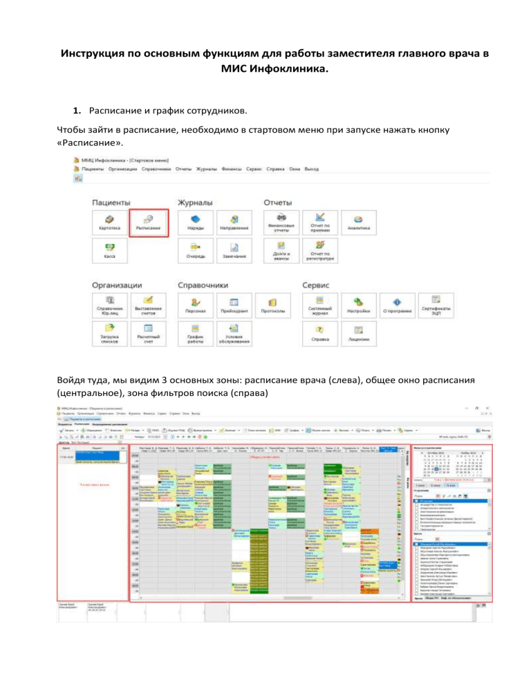 Инструкция по основным функциям для работы заместителя главного врача в МИС Инфоклиника. 1. Расписание и график сотрудников. Чтобы зайти в расписание, необходимо в стартовом меню при запуске нажать кнопку «Расписание». Войдя туда, мы видим 3 основных зоны: расписание врача (слева), общее окно расписания (центральное), зона фильтров поиска (справа) Окно расписания врача (слева) дублирует информацию из столбца, выделенного синим цветом в окне общего расписания. Для поиска расписания конкретного врача и на конкретный день можно воспользоваться фильтрами справа. Необходимо выбрать сначала день, потом отделение, потом врача, и нажать кнопку «Обновить расписание» в окне выбора отделения. После выбора отделения, врачи данного отделения отфильтруются в нижнем окне автоматически. Чтобы просмотреть всю информацию по записи пациента, необходимо кликнуть на него 1 раз в расписании, чтобы он засветился синим. В нижней части появится вся информация по записи: кто, когда, во сколько записал данного пациента, категория оплаты и дополнительный комментарий. Для начала приёма необходимо нажать на кнопку «Лечение» на панели над расписанием. В окне приёма выставляются услуги (зелёный плюс в правой части) и пишется протокол приёма. Также, в правом нижнем углу располагается кнопка «Дополнительный комментарий о докторе», где внесена вся информация по врачу, его контактные данные, компетенции, ограничения по приёмам и стоимость приёма. 2. График работы. В окне расписания также можно перейти в График работы специалистов. Здесь нас интересуют даты и время приёма специалиста. Сверху можно найти врача и выбрать интересующий нас месяц. Справа будет отображаться выбранный день. Здесь можно выбрать время, специализацию, рабочее место и интервал (время 1 приёма) записи. Кнопка «Загруженность рабочих мест» открывает вкладку, где отображается, когда, кем и в какое время конкретный кабинет занят. 3. Отчёты Основные отчёты, которые показывают выработку врачей, это «Ежедневный отчёт по докторам» и «По выполненным работам, денежным поступлениям». Найти их можно по кнопке «Отчёты» в верхней панели. В ежедневном отчёте можно посмотреть информацию по каждому отдельно взятому врачу за выбраный промежуток времени. Для этого в верхнем левом углу необходимо выбрать период, затем выбрать врача и участок (ОМС, ДМС, ПМУ), после чего нажать кнопку «Обновить» в левом верхнем углу. Когда информация обновится, в основном окне отразится информация по конкретному врачу по всем оказанным услугам по всем специализациям. Необходимо выбрать один из 4 вариантов отчёта: Детальный отчёт покажет все услуги, оказанные врачом за выбранный период, независимо от отделения. Сводный по отделениям – посчитает, на какую сумму врач оказал услуг в разных отделениях без разбивки по услугам или пациетам. Детальный с группировкой по ассистентам работает также, как и детальный, но дополнительно сортирует по разным ассистентам. Сводный по докторам покажет просто сумму всех оказанных врачом услуг за период без каких либо разбивок. Ежедневный отчёт удобнее использовать, когда необходимо свести информацию о деятельности 1 врача. Если есть необходимость в просмотре информации по нескольким врачам/отделениям/специализациям/услугам, то необходимо использовать Отчёт о выполненных работах. Данный от