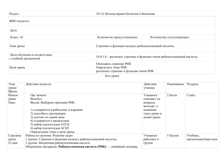 Раздел: 10.1А Молекулярная биология и биохимия ФИО педагога Дата: Класс: 10 Количество присутствующих: Тема урока Строение и функции молекул рибонуклеиновой кислоты. Цели обучения в соответствии с учебной программой 10.4.1.8 – различать строение и функции типов рибонуклеиновой кислоты Описывать строение РНК Определять типы РНК различать строение и функции типов РНК Ход урока Цели урока Этап урока/ Время Начало урока 5мин Середина урока 25 мин Количество отсутствующих: Действия педагога Орг момент. Всеобуч. Вызов. Выберите признаки РНК. 1) содержится в рибосомах и ядрышке 2) способна к репликации 3) состоит из одной цепи 4) содержится в хромосомах 5) набор нуклеотидов АТГЦ 6) набор нуклеотидов АГЦУ Определение темы и цели урока. Работа по группам: Решение задач 1 группа. Строение и функции молекул рибонуклеиновой кислоты. 2 группа. Матричная рибонуклеиновая кислота Объяснение материала: Рибонуклеиновая кислота (РНК) — линейный полимер, Действия ученика Оценивание Ресурсы Учащиеся отвечают на вопросы выходят к названию темы урока и целям урока. 2 балла Слайд Учащиеся работают в группе 5 баллов Учебник, презентация,Карточки состоящий из одной цепочки нуклеотидов. Мономеры (нуклеотиды) РНК состоят из пятиуглеродного сахара — рибозы, остатка фосфорной кислоты и азотистого основания. Три азотистых основания в молекулах РНК такие же, как и у ДНК — аденин, гуанин, цитозин, а четвертым является урацил. Образование полимера РНК происходит (также как и у ДНК) через ковалентные связи между рибозой и остатком фосфорной кислоты соседних нуклеотидов. Работа в парах: 1. В биосинтезе белка участвовали т-РНК с антикодонами: УУА, ГГЦ, ЦГЦ, АУУ, ЦГУ. Определите нуклеотидную последовательность участка каждой цепи молекулы ДНК, который несет информацию о синтезируемом полипептиде, и число нуклеотидов, содержащих аденин, гуанин, тимин, цитозин в двухцепочечной молекуле ДНК. 2. Матрицей для синтеза транспортной РНК служит 1) ДНК 2) и-РНК 3) р-РНК 4) белок 3. Все перечисленные ниже признаки, кроме двух, можно использовать для описания молекул транспортных РНК. Определите два признака, «выпадающих» из общего списка, и запишите в таблицу цифры, под которыми они указаны. 1) переносят аминокислоты к рибосомам 2) участвуют в синтезе белков 3) не имеют двуцепочечных фрагментов 4) синтезируются в ходе транскрипции 5) содержат кодон в центральной петле Дескриптор: Определяют нуклеотидную последовательность участка -определяют характеристику транспортной РНК Конец урока 10 мин 1. Что является мономером РНК? 2. Вставьте пропущенные слова в текст. Выполняют задания для ФО В РНК аденин всегда образует пару с ... . Существует три вида РНК. ______________________ переносит информацию от ядра к рибосомам в цитоплазме. ____________________ читает информацию и связывается с конкретной _____________________, чтобы сделать белок. ___________________ является наиболее распространенной формой РНК и образует рибосомы. 3. Утверждения ниже описывают особенности нуклеиновых кислот. 1 переносят аминокислоты к рибомомам 2 переносят последовательность генетического кода из ядра 3 переносят последовательность генетического кода к рибосомам Какая функция характерна только для м РНК А1,2и3 В1,2 С 1,3 D2,3 Дескриптор: называет мономер РНК; - называет типы РНК; - определяет функции тиопов РНК. Рефлексия Метод “Горячий стул”. 5 мин Обобщение знани