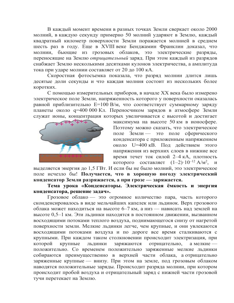 В каждый момент времени в разных точках Земли сверкает около 2000 молний, в каждую секунду примерно 50 молний ударяют в Землю, каждый квадратный километр поверхности Земли поражается молнией в среднем шесть раз в году. Еще в XVIII веке Бенджамин Франклин доказал, что молнии, бьющие из грозовых облаков, это электрические разряды, переносящие на Землю отрицательный заряд. При этом каждый из разрядов снабжает Землю несколькими десятками кулонов электричества, а амплитуда тока при ударе молнии составляет от 20 до 100 кА. Скоростная фотосъемка показала, что разряд молнии длится лишь десятые доли секунды и что каждая молния состоит из нескольких более коротких. С помощью измерительных приборов, в начале XX века было измерено электрическое поле Земли, напряженность которого у поверхности оказалась равной приблизительно Е=100 В/м, что соответствует суммарному заряду планеты около q=400 000 Кл. Переносчиком зарядов в атмосфере Земли служат ионы, концентрация которых увеличивается с высотой и достигает максимума на высоте 50 км в ионосфере. Поэтому можно сказать, что электрическое поле Земли — это поле сферического конденсатора с приложенным напряжением около U=400 кВ. Под действием этого напряжения из верхних слоев в нижние все время течет ток силой 2–4 кА, плотность которого составляет (1–2)·10–12 А/м2, и выделяется энергия до 1,5 ГВт. И если бы не было молний, это электрическое поле исчезло бы! Получается, что в хорошую погоду электрический конденсатор Земли разряжается, а при грозе — заряжается. Тема урока «Конденсаторы. Электрическая ёмкость и энергия конденсатора, решение задач». Грозовое облако — это огромное количество пара, часть которого сконденсировалось в виде мельчайших капелек или льдинок. Верх грозового облака может находиться на высоте 6–7 км, а низ — нависать над землей на высоте 0,5–1 км. Эти льдинки находятся в постоянном движении, вызванном восходящими потоками теплого воздуха, поднимающегося снизу от нагретой поверхности земли. Мелкие льдинки легче, чем крупные, и они увлекаются восходящими потоками воздуха и по дороге все время сталкиваются с крупными. При каждом таком столкновении происходит электризация, при которой крупные льдинки заряжаются отрицательно, а мелкие — положительно. Со временем положительно заряженные мелкие льдинки собираются преимущественно в верхней части облака, а отрицательно заряженные крупные — внизу. При этом на земле, под грозовым облаком наводятся положительные заряды. Происходит разряда молнии, при котором происходит пробой воздуха и отрицательный заряд с нижней части грозовой тучи перетекает на Землю. Устройство простейшего конденсатора Конденсатор состоит их двух металлических пластин — электродов, называемых обкладками, между которыми находится тонкий слой диэлектрика (материал обкладок и диэлектрика может быть различным). Чтобы увеличить ёмкость конденсатора, не увеличивая его размеры, применяют разные хитрости. Плёночные конденсаторы - возьмем две обкладки в виде длинных полосок фольги, проложим между ними полиэтилен и свернем как «рулет»,получится компактный прибор с большой ёмкостью. Если вместо полиэтилена взять бумагу и пропитать её электролитом, то на поверхности фольги образуется тонкий слой оксида, который не проводит ток, получится электролитический конденсатор. Существ