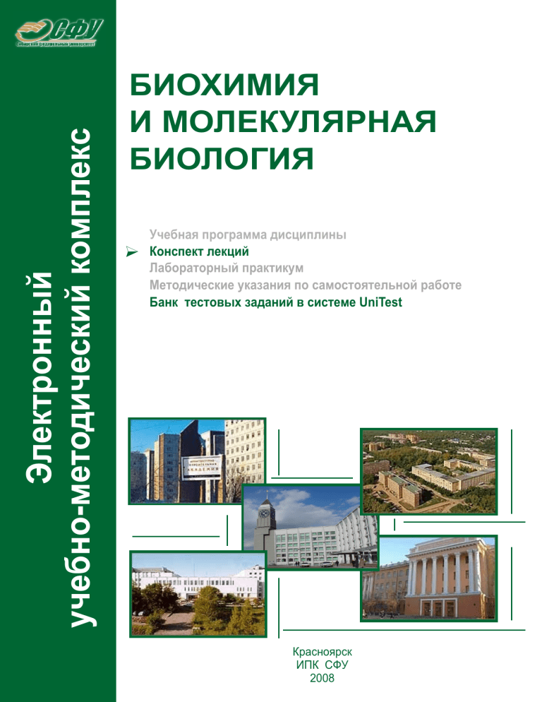 Электронный учебно-методический комплекс БИОХИМИЯ И МОЛЕКУЛЯРНАЯ БИОЛОГИЯ Учебная программа дисциплины Конспект лекций Лабораторный практикум Методические указания по самостоятельной работе Банк тестовых заданий в системе UniTest Красноярск ИПК СФУ 2008 УДК 577.1 ББК 28.072 Б63 Авторы: Н. М. Титова, А. А. Савченко, Т. Н. Замай, Г. И. Боровкова, Т. Н. Субботина, Е. В. Инжеваткин Электронный учебно-методический комплекс по дисциплине «Биохимия и молекулярная биология» подготовлен в рамках инновационной образовательной программы «Создание и развитие Департамента физико-химической биологии и фундаментальной экологии», реализованной в ФГОУ ВПО СФУ в 2007 г. Рецензенты: Красноярский краевой фонд науки; Экспертная комиссия СФУ по подготовке учебно-методических комплексов дисциплин Б63 Биохимия и молекулярная биология. Версия 1.0 [Электронный ресурс] : конспект лекций / Н. М. Титова, А. А. Савченко, Т. Н. Замай и др. – Электрон. дан. (10 Мб). – Красноярск : ИПК СФУ, 2008. – (Биохимия и молекулярная биология : УМКД № 175-2007 / рук. творч. коллектива Н. М. Титова). – 1 электрон. опт. диск (DVD). – Систем. требования : Intel Pentium (или аналогичный процессор других производителей) 1 ГГц ; 512 Мб оперативной памяти ; 10 Мб свободного дискового пространства ; привод DVD ; операционная система Microsoft Windows 2000 SP 4 / XP SP 2 / Vista (32 бит) ; Adobe Reader 7.0 (или аналогичный продукт для чтения файлов формата pdf). ISBN 978-5-7638-0882-7 (комплекса) ISBN 978-5-7638-1433-0 (конспекта лекций) Номер гос. регистрации в ФГУП НТЦ «Информрегистр» 0320802400 от 21.11.2008 г. (комплекса) Настоящее издание является частью электронного учебно-методического комплекса по дисциплине «Биохимия и молекулярная биология», включающего учебную программу, лабораторный практикум, методические указания к самостоятельной работе, контрольно-измерительные материалы «Биохимия и молекулярная биология. Банк тестовых заданий», наглядное пособие «Биохимия и молекулярная биология. Презентационные материалы». Изложены современные представления о структуре и функциях белков, нуклеиновых кислот, углеводов и липидов, путях биосинтеза и распада этих биополимеров, механизме ферментативного катализа, его регуляции. Даны сведения о важнейших группах ферментов и коферментов, их структуре, участии окислительных ферментов в осуществлении процессов тканевого дыхания, его энергетической эффективности. Особое внимание уделено структуре и механизму действия на обмен веществ витаминов. Предназначен для студентов направления подготовки бакалавров 020200.62 «Биология» укрупненной группы 020000 «Естественные науки». © Сибирский федеральный университет, 2008 Рекомендовано к изданию Инновационно-методическим управлением СФУ Редактор В. Р. Наумова Разработка и оформление электронного образовательного ресурса: Центр технологий электронного обучения информационно-аналитического департамента СФУ; лаборатория по разработке мультимедийных электронных образовательных ресурсов при КрЦНИТ Содержимое ресурса охраняется законом об авторском праве. Несанкционированное копирование и использование данного продукта запрещается. Встречающиеся названия программного обеспечения, изделий, устройств или систем могут являться зарегистрированными товарными знаками тех или иных фирм. Подп. к использованию 22.09.2008 Объем 10 Мб Красноярск: СФУ, 660041, Красноярск, пр. Свободный, 79 Оглавление Введение.